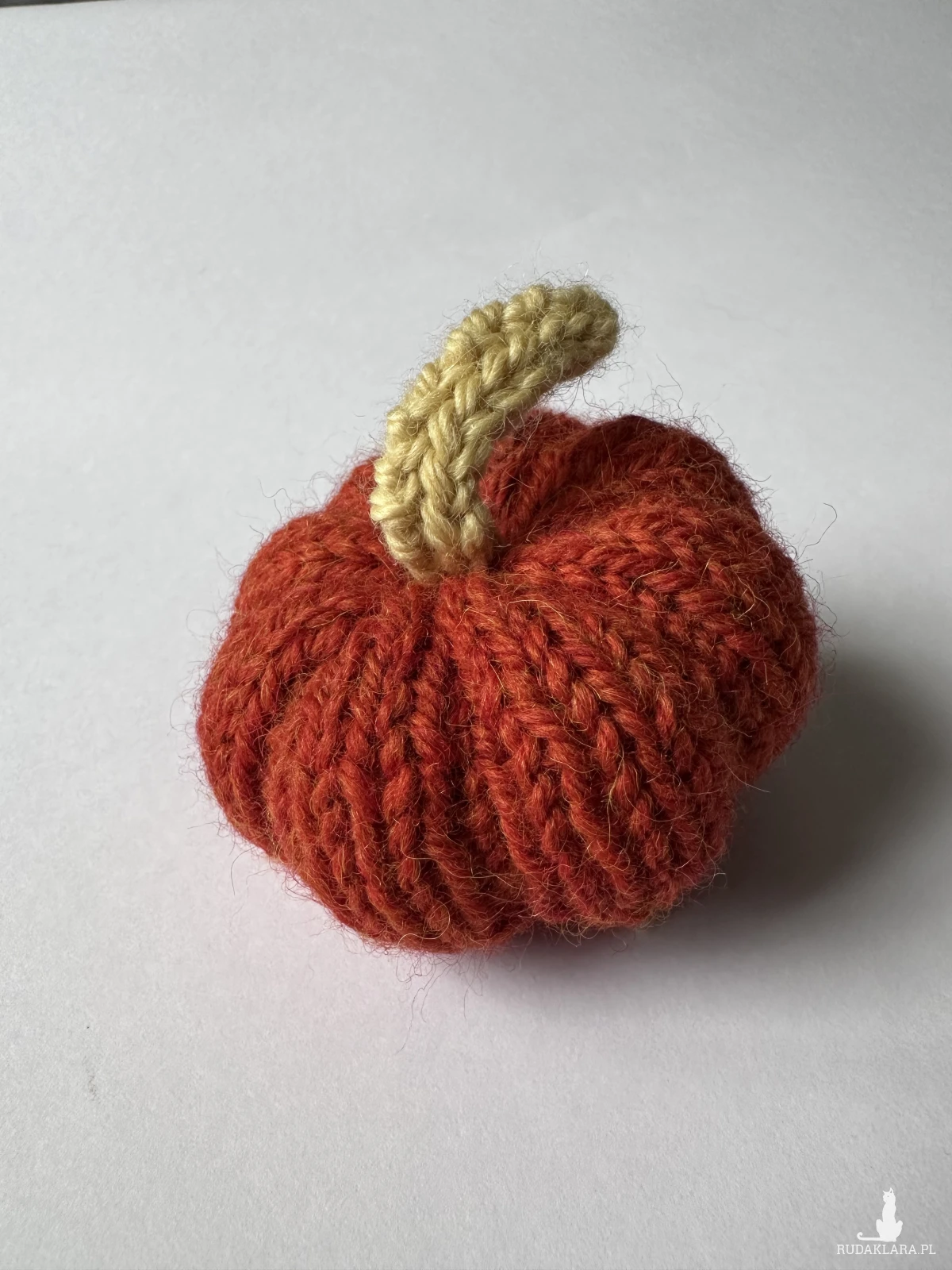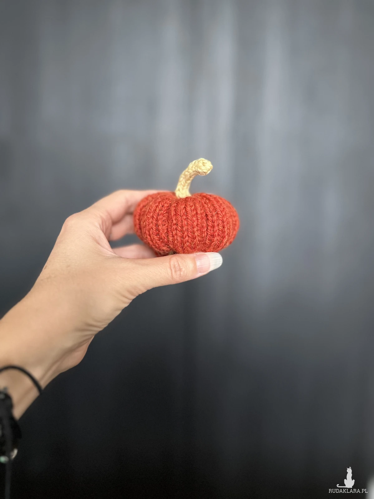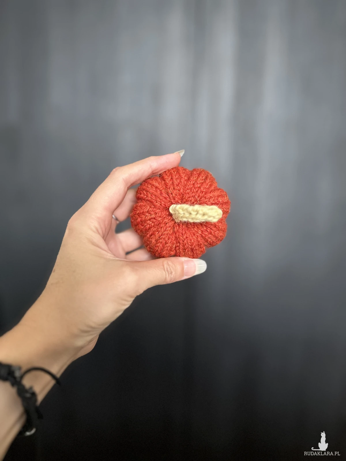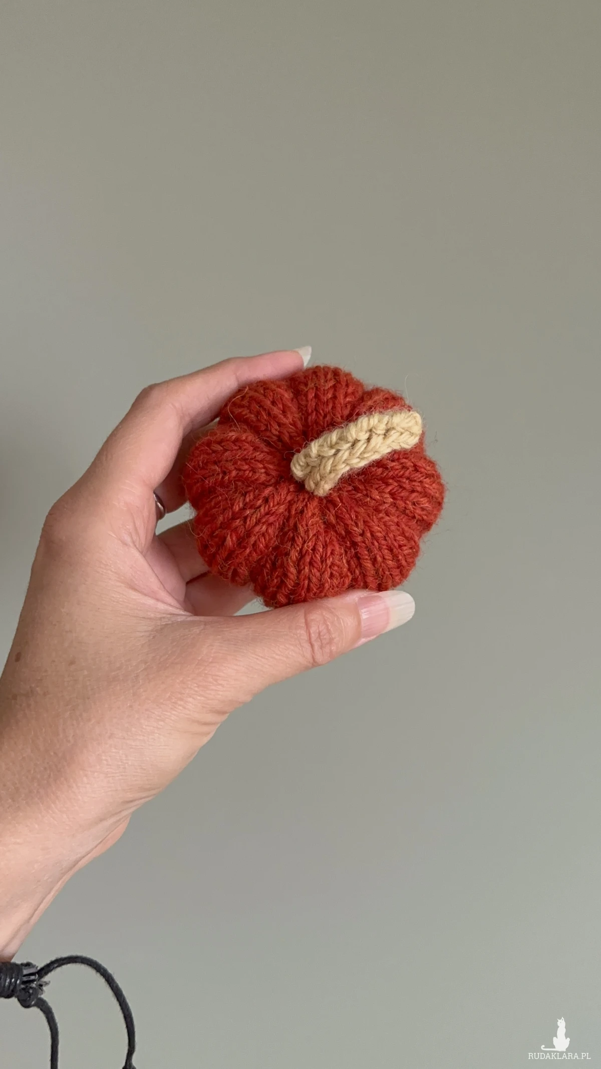 Urocza, ręcznie wykonana wełniana dynia, stworzona z pasją w jesiennym, ciepłym odcieniu pomarańczy.