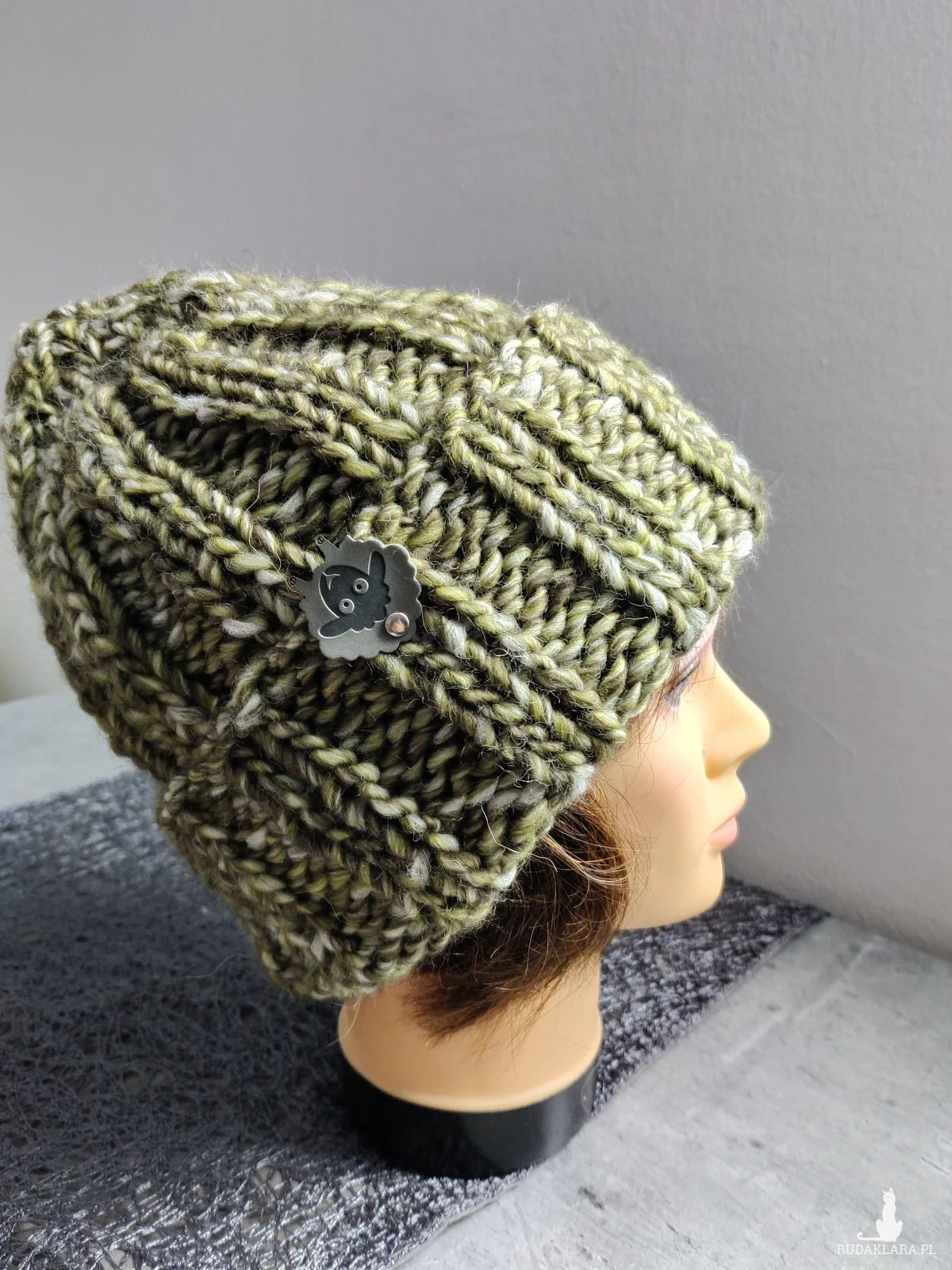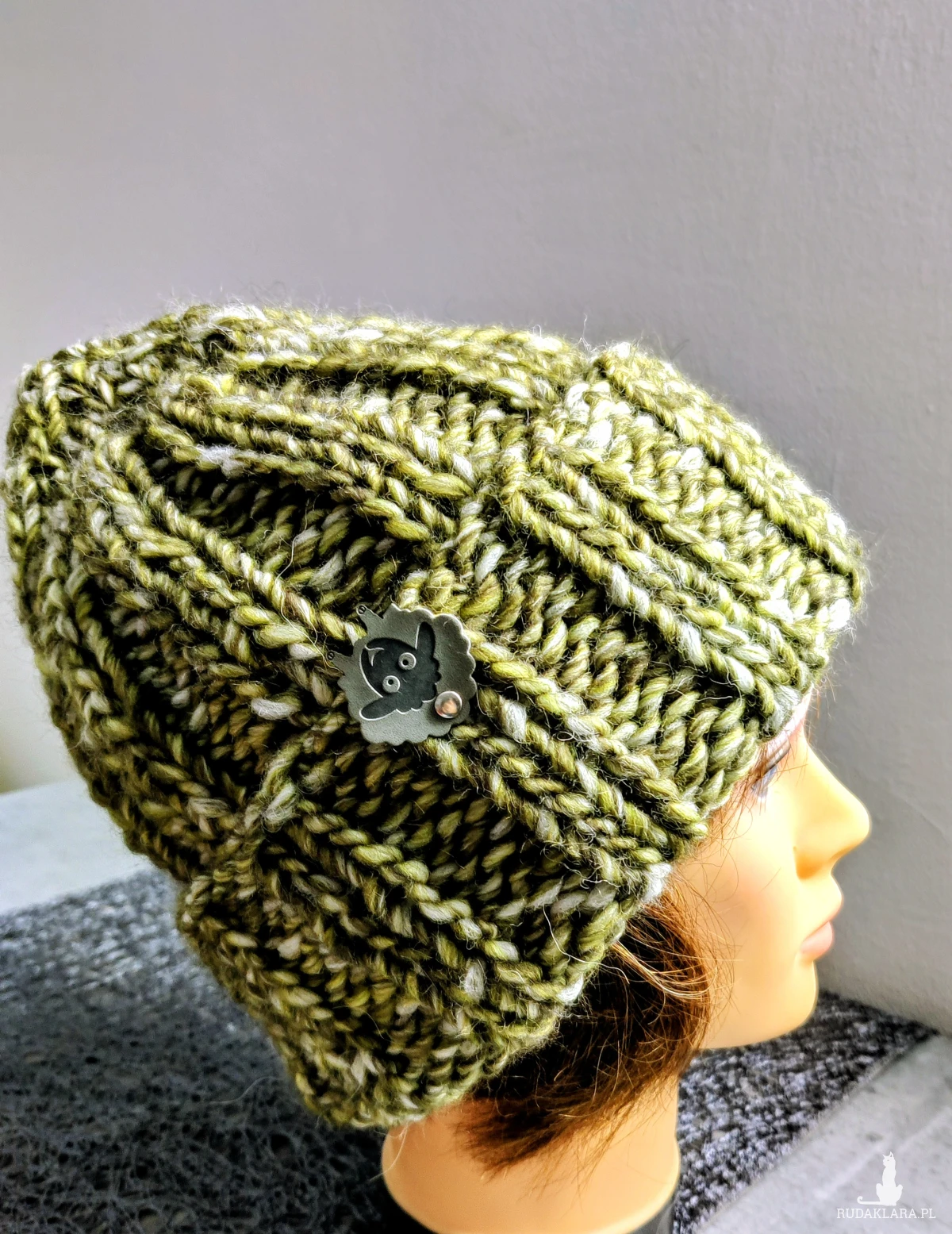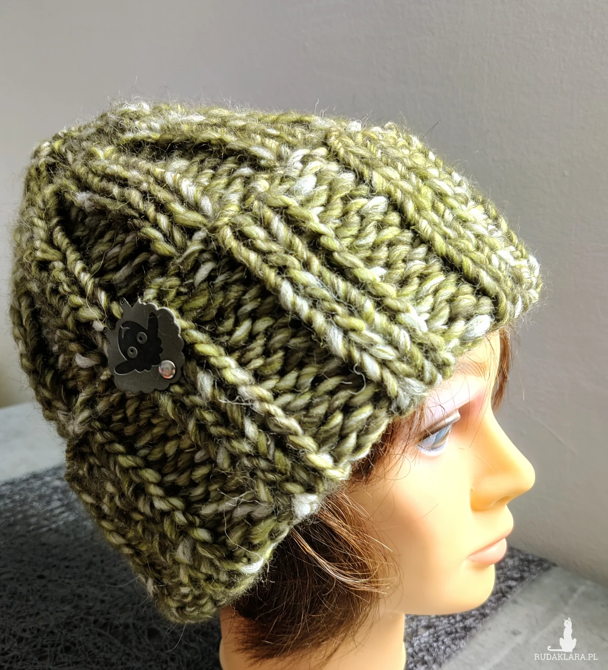 Czapka zimowa ręcznie zrobiona w kolorze oliwkowego melanżu , kolor wełny liść laurowy.