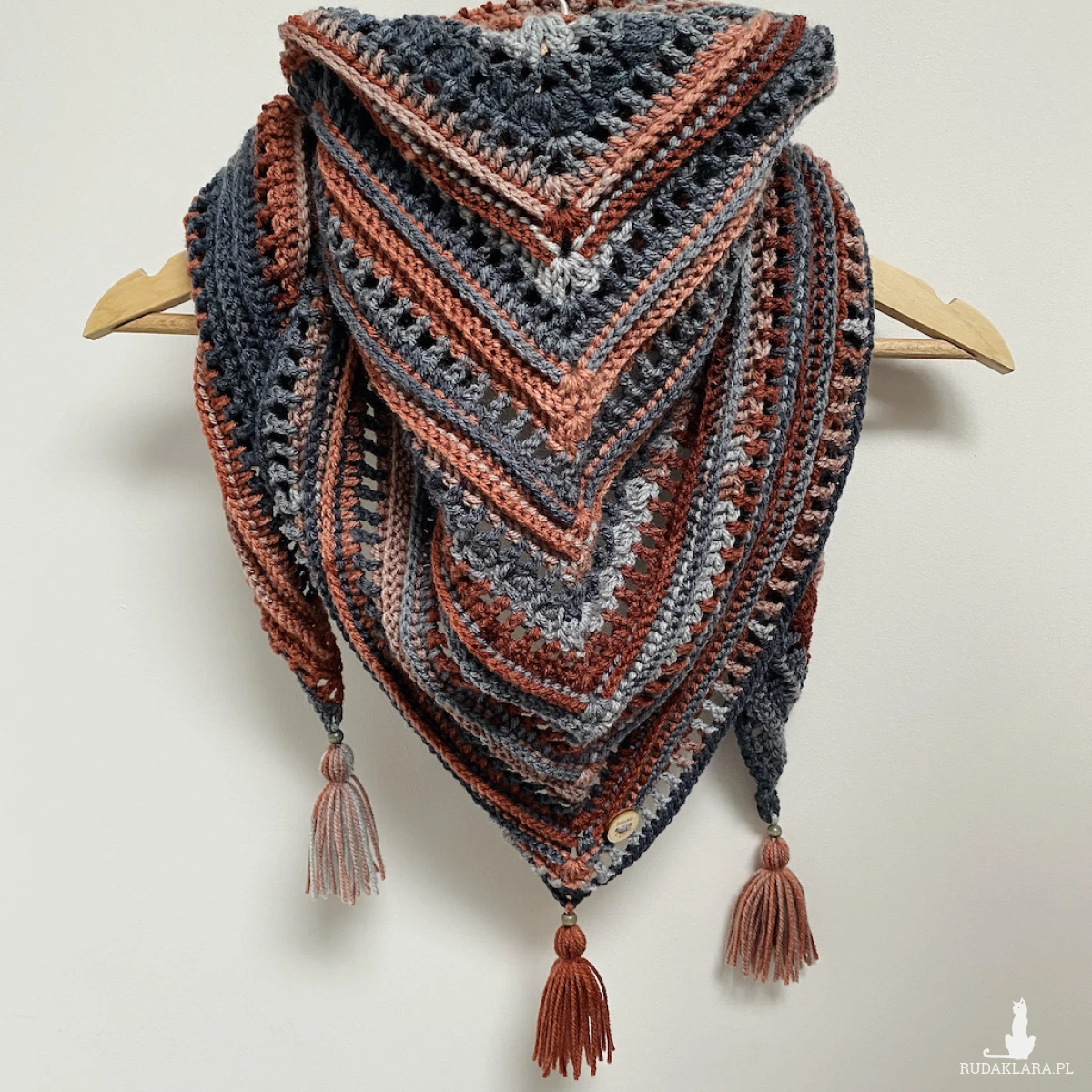 Chustę wykonałam na szydełku z miękkiej włóczki akrylowej, która zachwyca intensywnością koloru i delikatnością. Certyfikat OEKO-TEX® Standard 100 potwierdza, że jest bezpieczna dla a zdrowia materiały użyte do jej produkcji są wolne od szkodliwych substancji chemicznych.