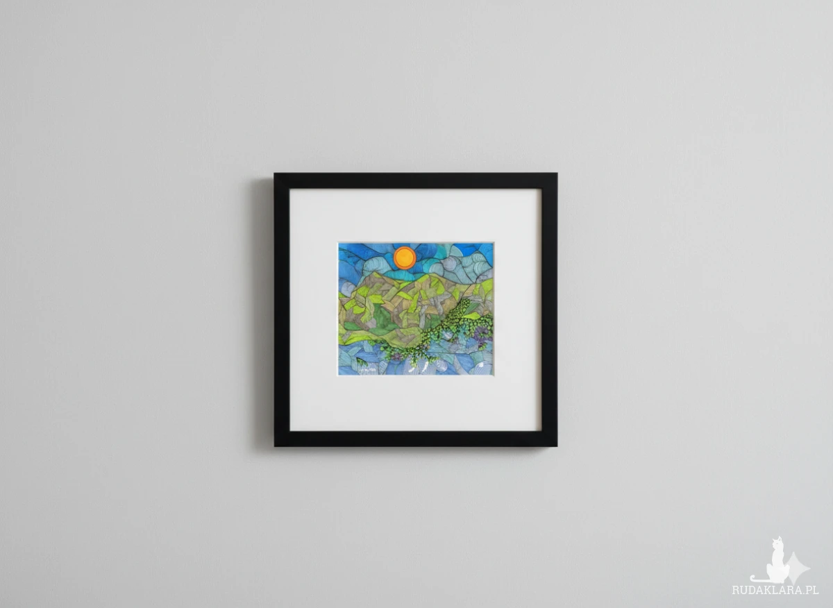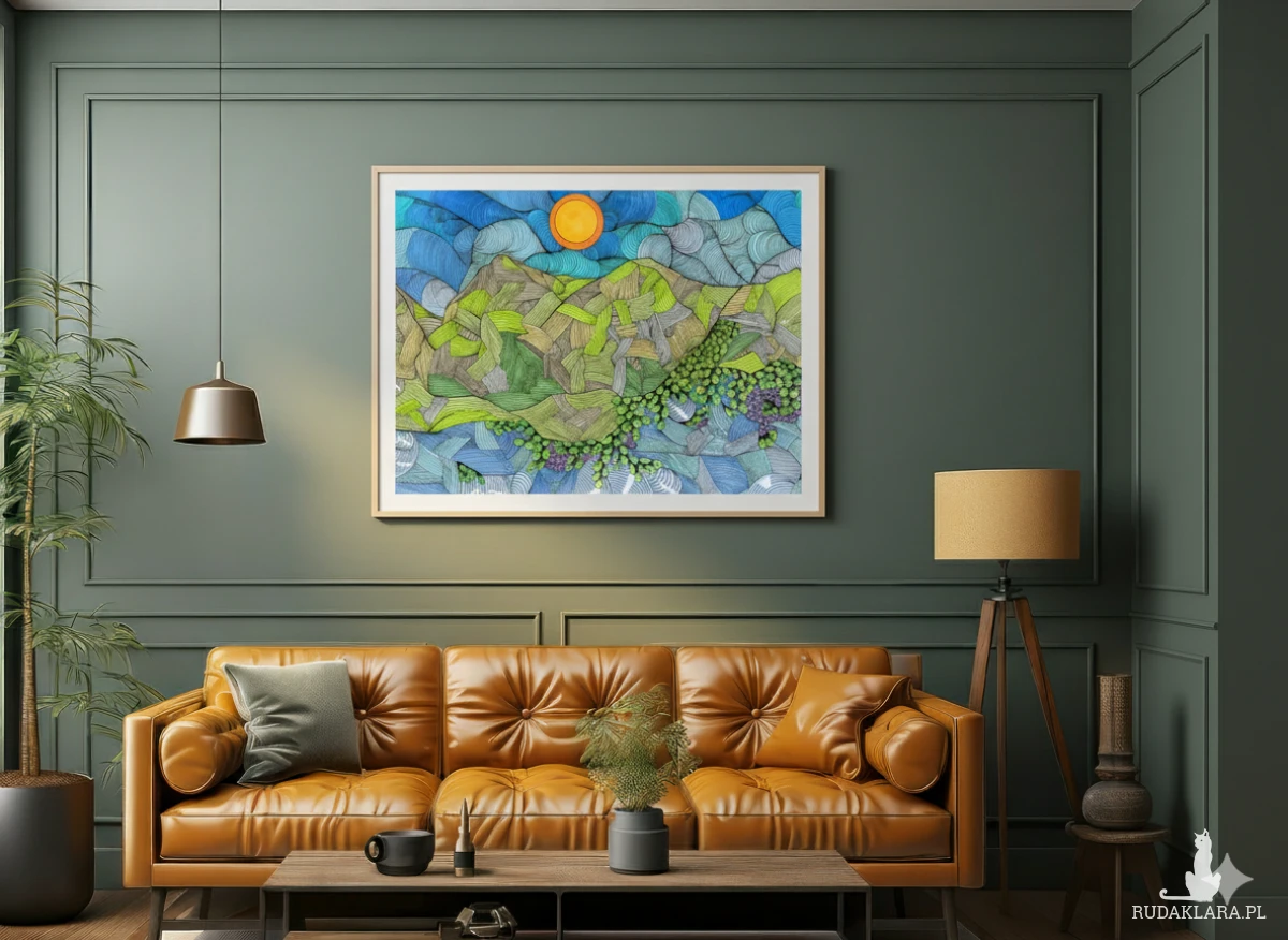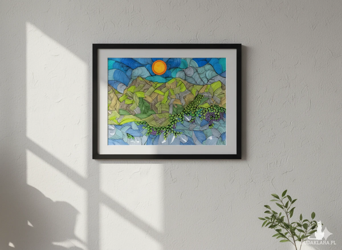 Wydruk autorskiego rysunku na satynowym papierze o gramaturze 200g/m2 - sprzedawany bez ramki - rysunki w ramkach na zdjęciach to wizualizacje. Format wydruku: A4. Wysyłka bezpieczna w kartonowej tubie. Kolory mogą się nieznacznie różnić w zależności od ustawień monitora ! Ten rysunek jest wizualną medytacją nad energią i ciągłym ruchem w naturze, a jednocześnie wyraża poczucie ujarzmionej, wewnętrznej siły. Brak gładkich powierzchni, zastąpionych przez nieustanny, falisty splot linii, sugeruje, że wszystko w naturze jest w stanie ciągłej, choć powolnej, zmiany i wibracji. To wyraża radość życia odczuwaną jako wewnętrzne drżenie i ruch. Góry, które powinny być stabilne i ciężkie, są tu zredukowane do migoczących pasm koloru. Woda i niebo płyną z podobną, oniryczną dynamiką. Emocjonalnie oznacza to akceptację płynności — świadomość, że nawet to, co wydaje się stałe (góry), jest częścią większego, nieustannego tańca życia. Jedynym gładkim i pełnym elementem jest Słońce w zenicie. Działa ono jako ogniskowa spokoju i klarowności, oświetlając skomplikowany wzór poniżej. To symbol wewnętrznego światła lub świadomości, która patrzy na złożoność świata z dystansem i spokojem, bez lęku przed jego dynamiczną i chaotyczną naturą. Emocja przewodnia: Dynamiczna Witalność i Spokojna Kontemplacja Zmiany. Styl: Ilustracja Abstrakcyjna, Stylizacja Krajobrazowa, Art Brut / Outsider Art, Doodle Art/Zentangle Inspired, Postimpresjonizm Liniowy Afirmacja: "Akceptuję nieustanny ruch życia. Choć świat wokół mnie wibruje, w moim wnętrzu panuje jasność i stabilność, pozwalająca mi z ufnością podążać za wzrostem." Krótka Mantra: "Jestem falą i jestem szczytem. Płynę i wzrastam."