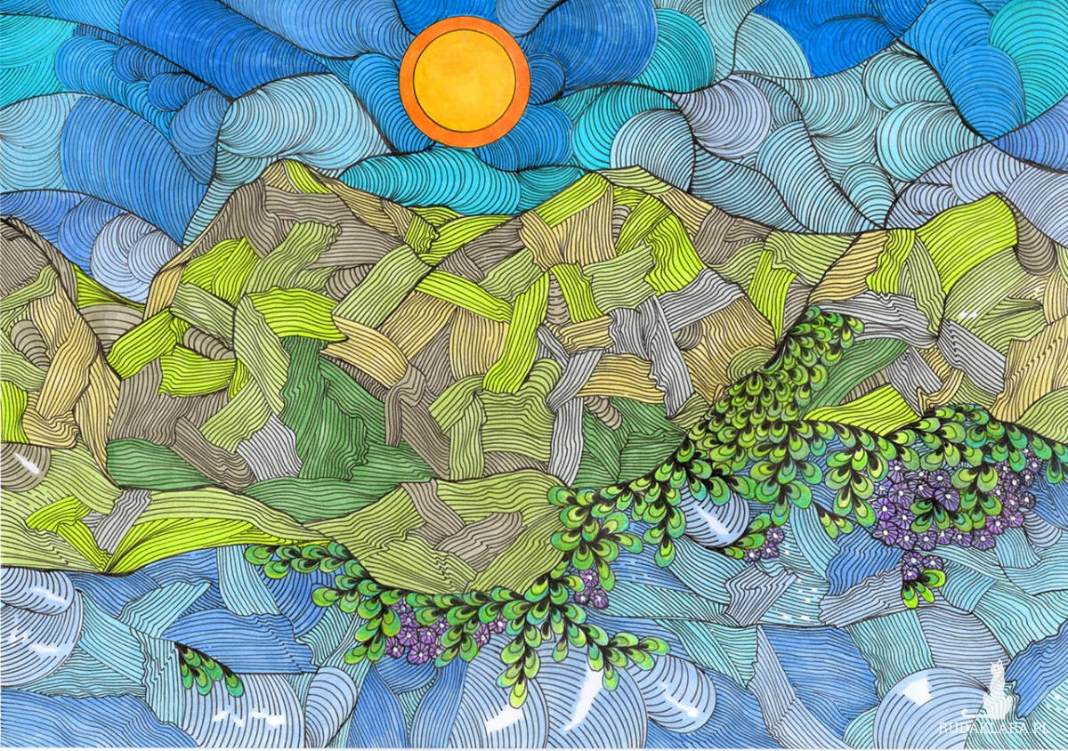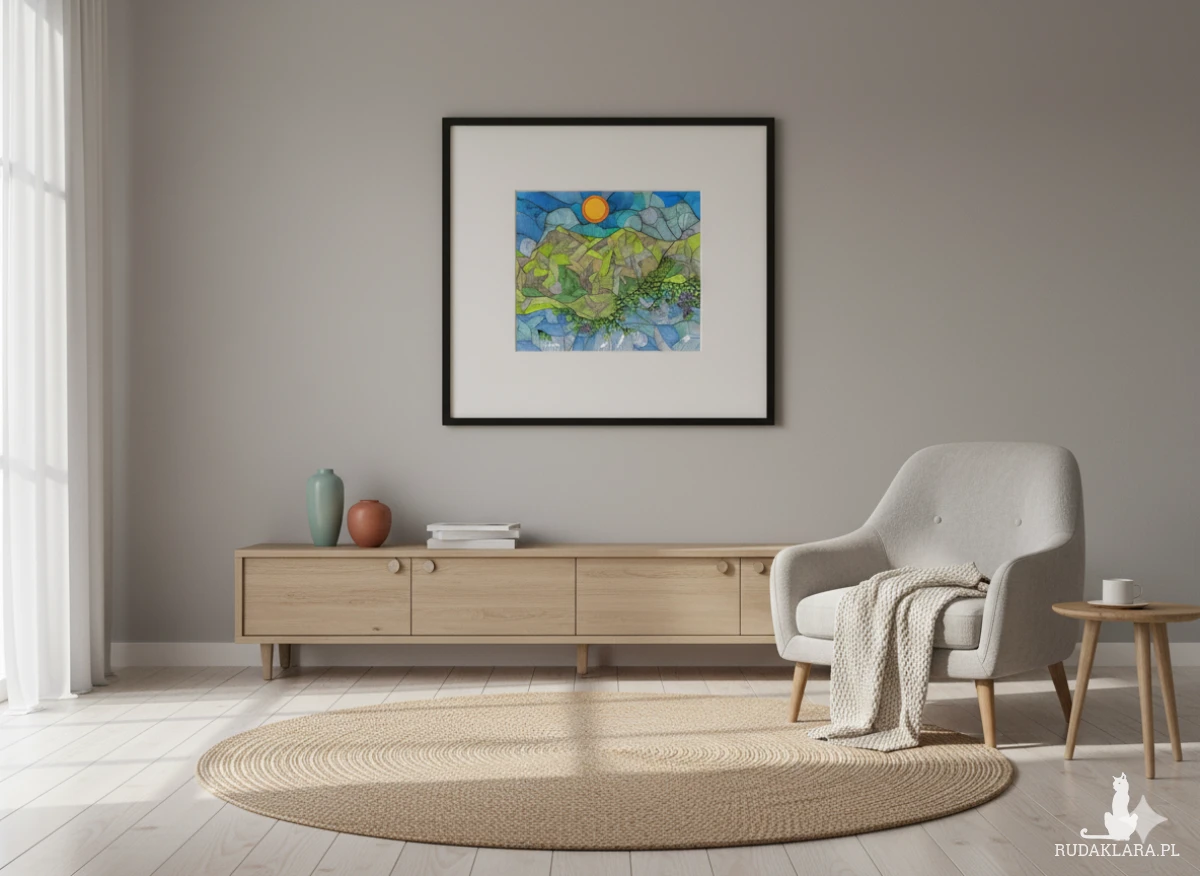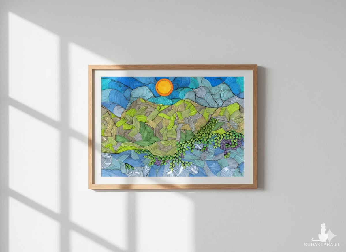 Wydruk autorskiego rysunku na satynowym papierze o gramaturze 200g/m2 - sprzedawany bez ramki - rysunki w ramkach na zdjęciach to wizualizacje. Format wydruku: A3. Wysyłka bezpieczna w kartonowej tubie. Kolory mogą się nieznacznie różnić w zależności od ustawień monitora ! Ten rysunek jest wizualną medytacją nad energią i ciągłym ruchem w naturze, a jednocześnie wyraża poczucie ujarzmionej, wewnętrznej siły. Brak gładkich powierzchni, zastąpionych przez nieustanny, falisty splot linii, sugeruje, że wszystko w naturze jest w stanie ciągłej, choć powolnej, zmiany i wibracji. To wyraża radość życia odczuwaną jako wewnętrzne drżenie i ruch. Góry, które powinny być stabilne i ciężkie, są tu zredukowane do migoczących pasm koloru. Woda i niebo płyną z podobną, oniryczną dynamiką. Emocjonalnie oznacza to akceptację płynności — świadomość, że nawet to, co wydaje się stałe (góry), jest częścią większego, nieustannego tańca życia. Jedynym gładkim i pełnym elementem jest Słońce w zenicie. Działa ono jako ogniskowa spokoju i klarowności, oświetlając skomplikowany wzór poniżej. To symbol wewnętrznego światła lub świadomości, która patrzy na złożoność świata z dystansem i spokojem, bez lęku przed jego dynamiczną i chaotyczną naturą. Emocja przewodnia: Dynamiczna Witalność i Spokojna Kontemplacja Zmiany. Styl: Ilustracja Abstrakcyjna, Stylizacja Krajobrazowa, Art Brut / Outsider Art, Doodle Art/Zentangle Inspired, Postimpresjonizm Liniowy Afirmacja: "Akceptuję nieustanny ruch życia. Choć świat wokół mnie wibruje, w moim wnętrzu panuje jasność i stabilność, pozwalająca mi z ufnością podążać za wzrostem." Krótka Mantra: "Jestem falą i jestem szczytem. Płynę i wzrastam."