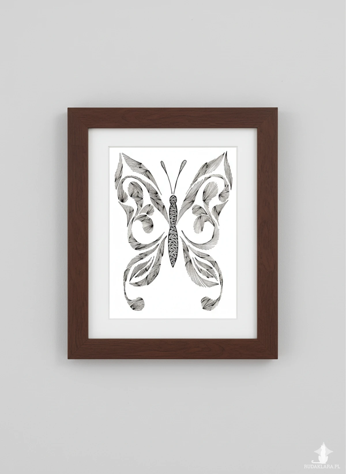 Skrzydła nie są wypełnione kolorem, lecz składają się z gęsto rysowanych, falistych linii, które układają się w wirujące, ażurowe kształty, nadając postaci motyla wrażenie lekkości, ruchu i niemal przejrzystości.