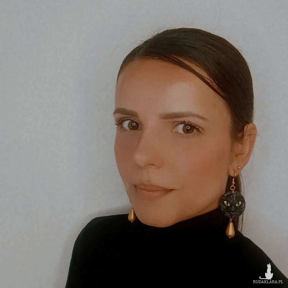 Czarny kot - długie kolczyki ze złotymi kropelkami - biżuteria z charakterem