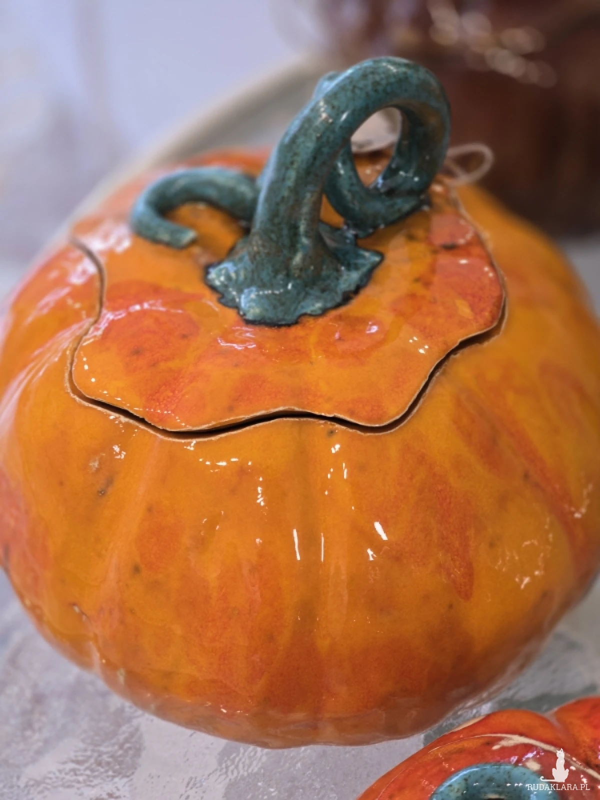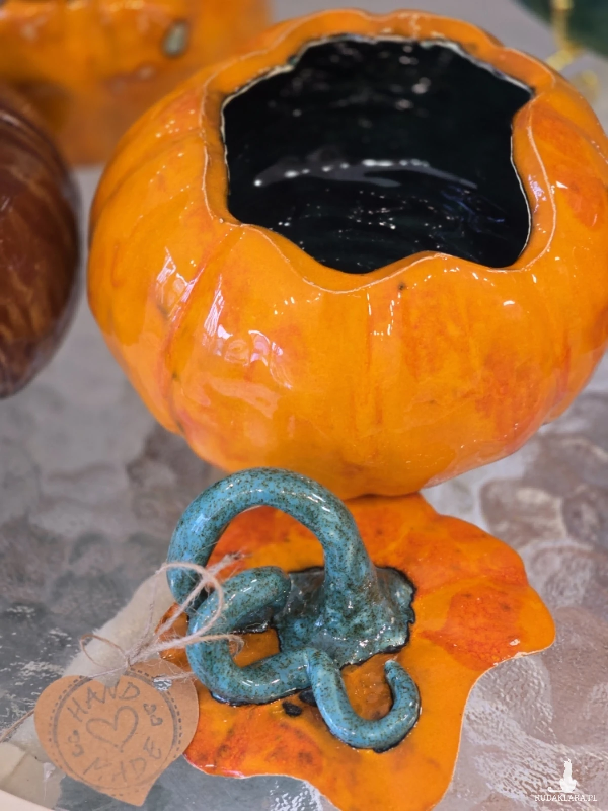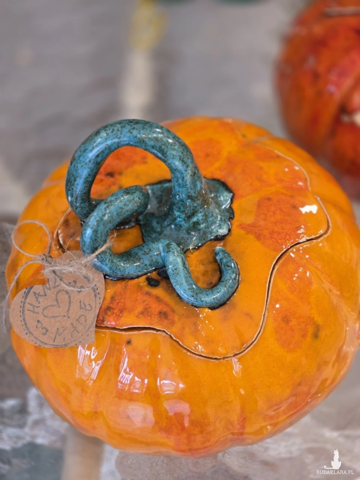 Dynia ceramiczna, wykonana ręcznie, wypalana dwukrotnie w temperaturze 950 stopni na biskwit i w temperaturze 1050 stopni ze szkliwem. Szkliwo w pięknym pomarańczowym kolorze z efektami, wszystkie przetarcia i odcienie są efektem zamierzonym i to stanowi o jego wyjątkowych walorach dekoracyjnych.