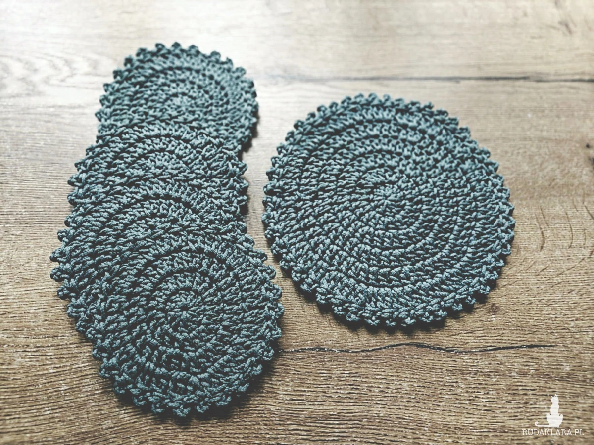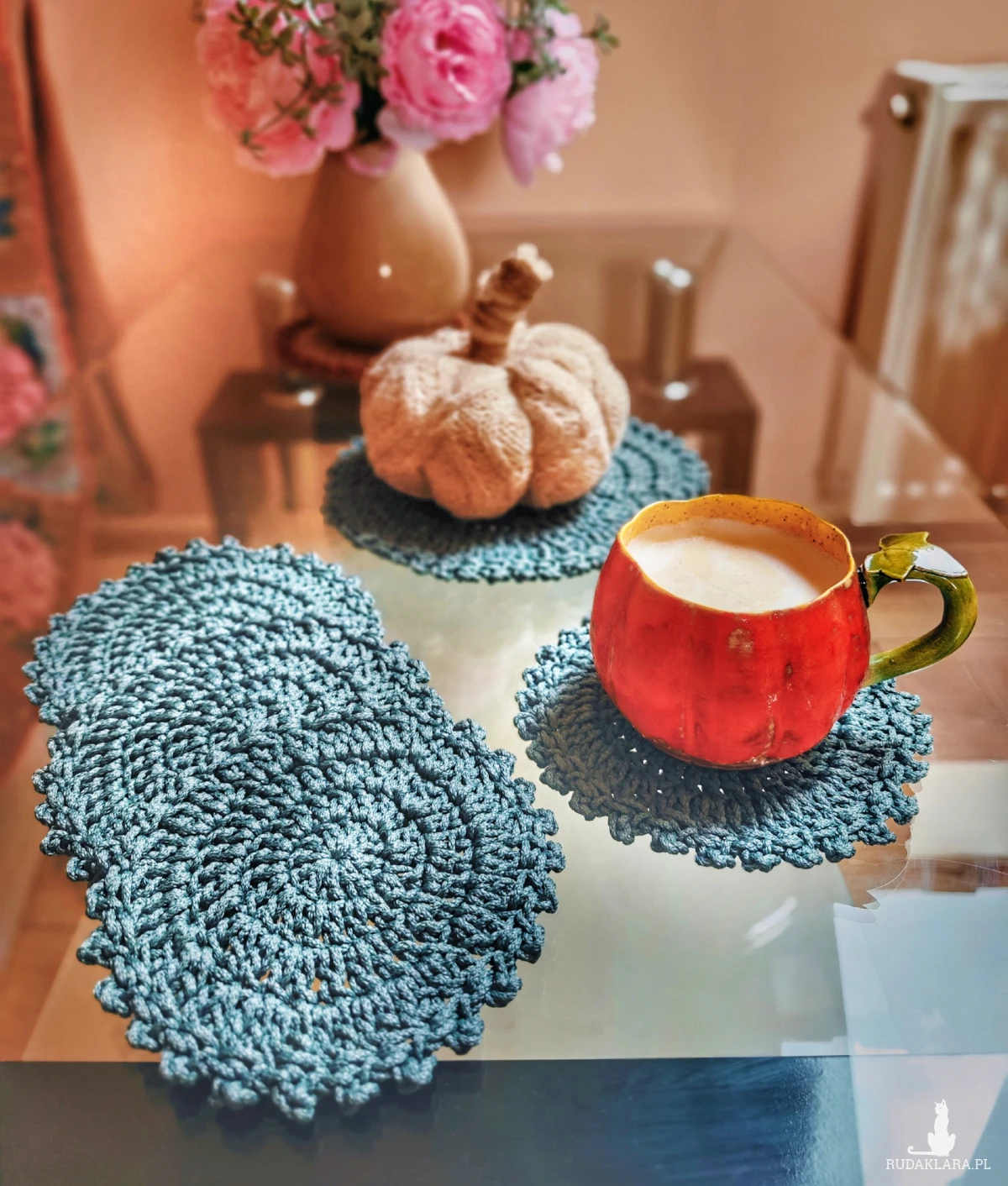 4 podkładki ze sznurka poliestrowego 2mm, o średnicy 14cm plus 1 większa o średnicy 21cm w kolorze ciemna szałwia( nie jest to kolor niebieski) wykonane na szydełku, brzegi wykończone drobnymi pikotkami co nadaje im ozdobny charakter. Podkładki mają rustykalny, naturalny styl i świetnie sprawdzą się jako dekoracja stołu pod kubek, filiżankę czy niewielki talerzyk.