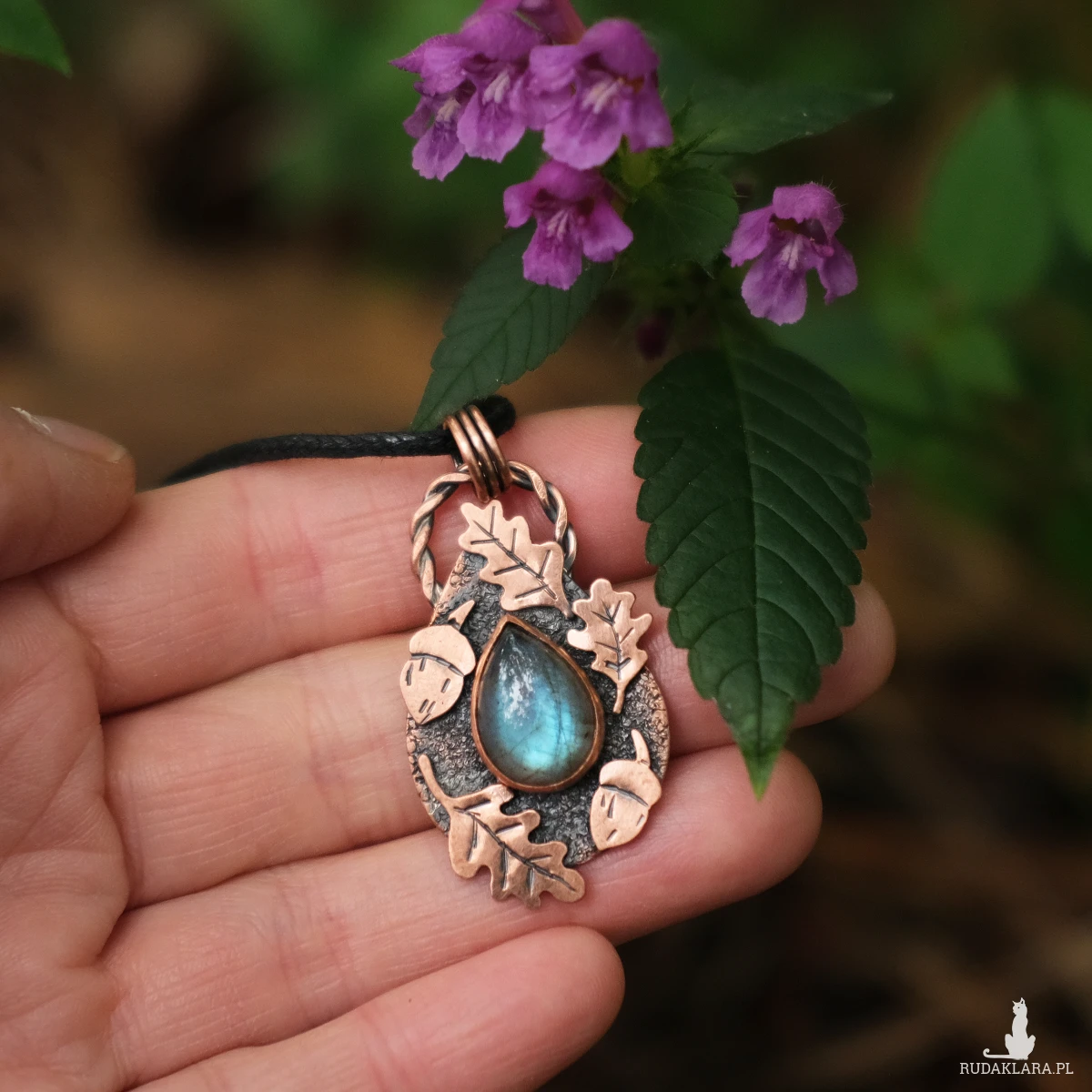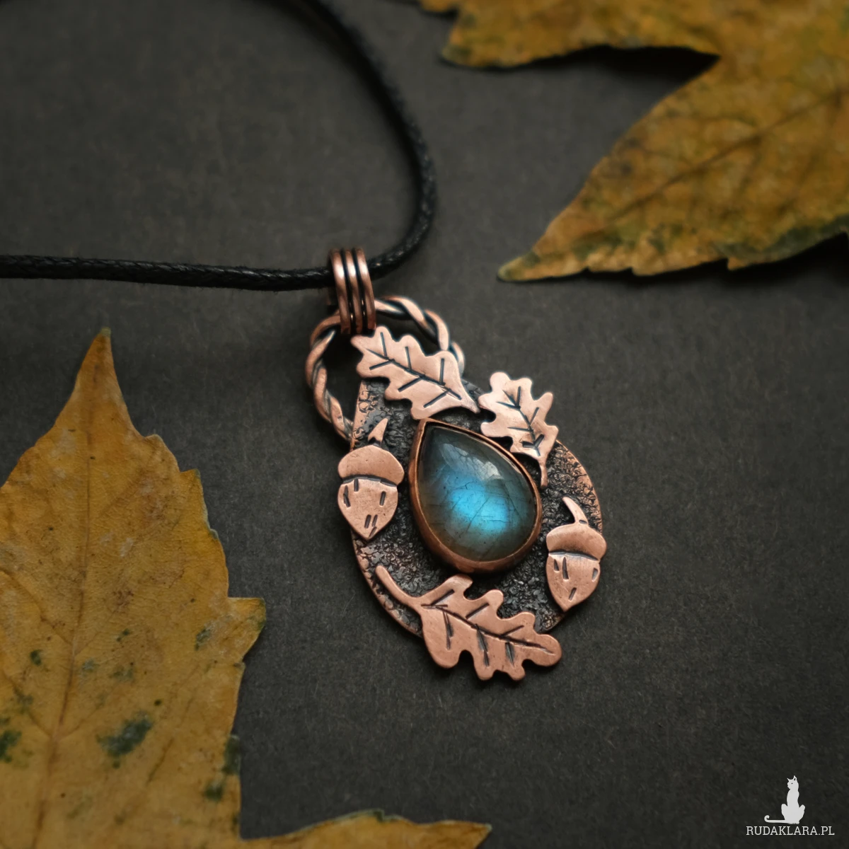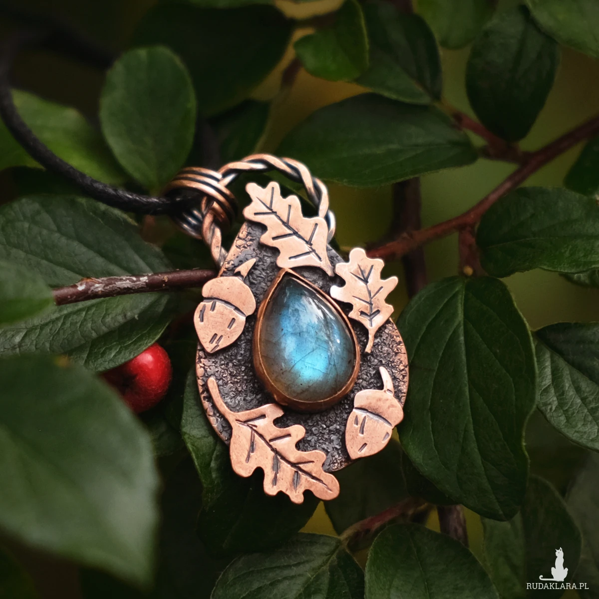 Unikatowy miedziany wisiorek z liśćmi dębu i żołędziami mieści w sobie kamień naturalnego labradorytu. Wszystkie elementy zostały stworzone ręcznie na podstawie rysunku, co nadaje mu oryginalnego leśnego charakteru. Wisiorek ma naniesioną patynę, aby uwydatnić rysunek. Idealnie sprawdzi się na dekolcie miłośniczki natury, ceniącej wyroby rękodzielnicze.
