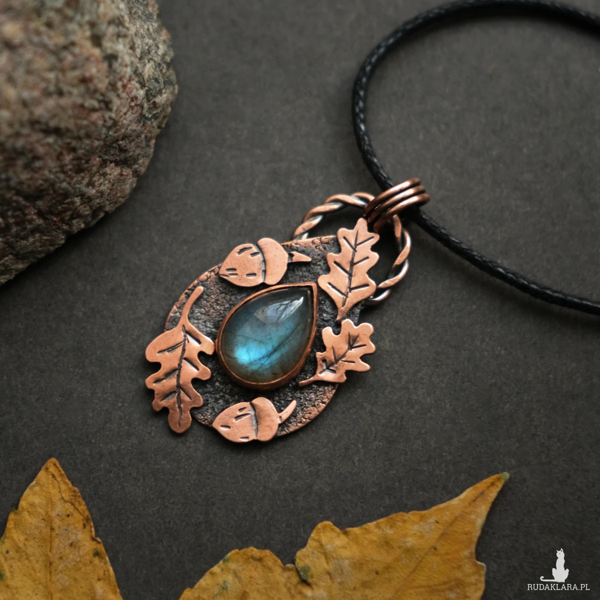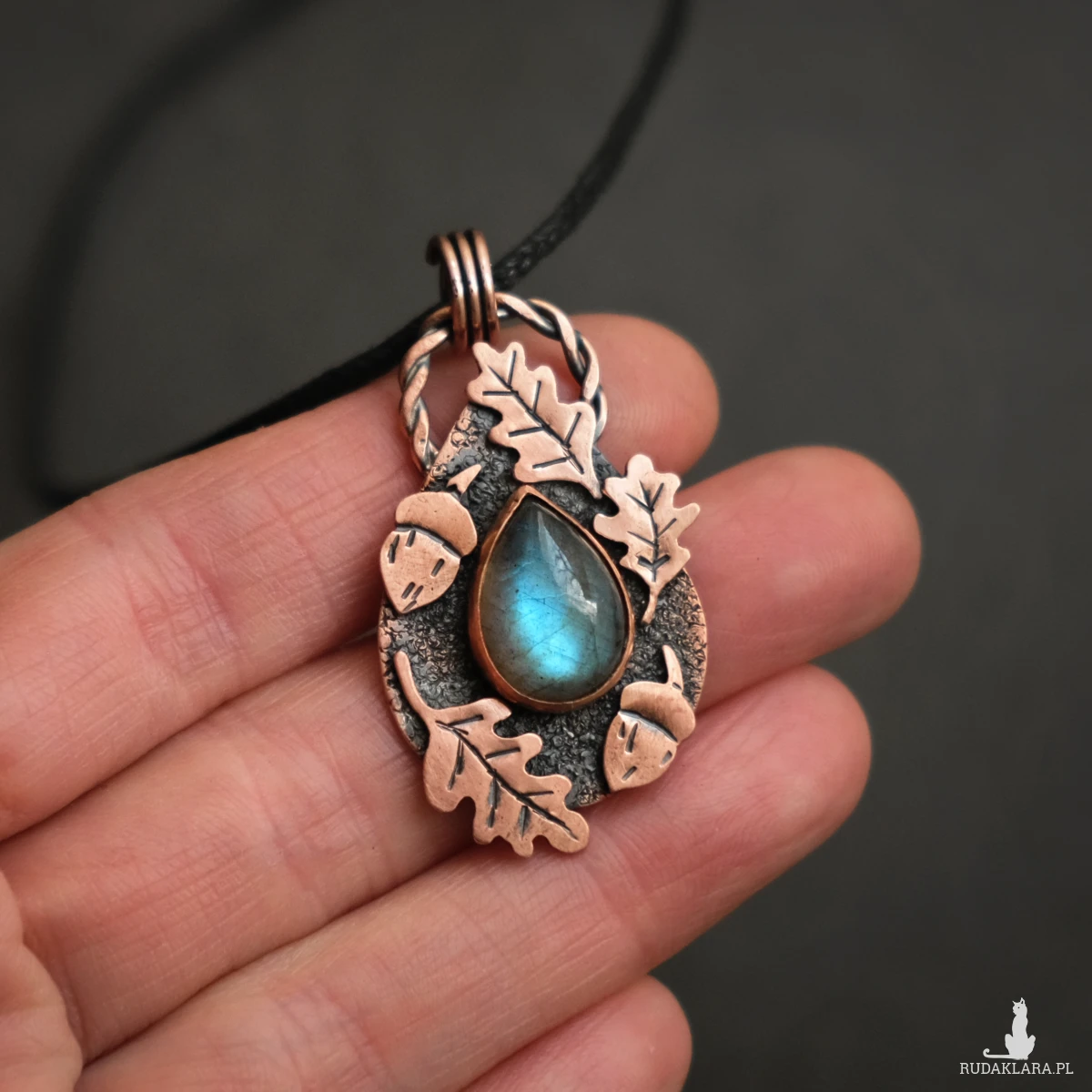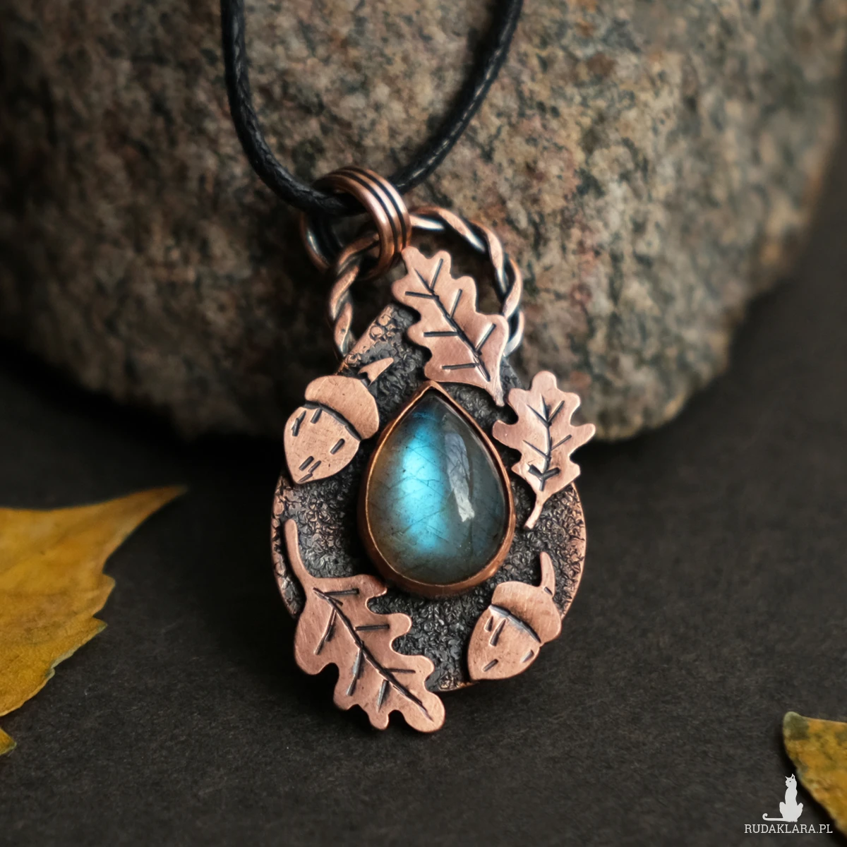 Unikatowy miedziany wisiorek z liśćmi dębu i żołędziami mieści w sobie kamień naturalnego labradorytu. Wszystkie elementy zostały stworzone ręcznie na podstawie rysunku, co nadaje mu oryginalnego leśnego charakteru. Wisiorek ma naniesioną patynę, aby uwydatnić rysunek. Idealnie sprawdzi się na dekolcie miłośniczki natury, ceniącej wyroby rękodzielnicze.