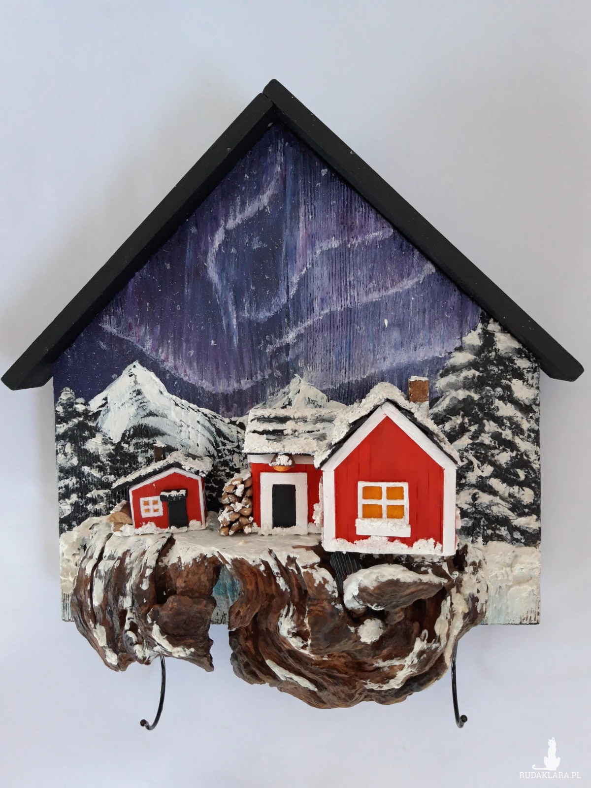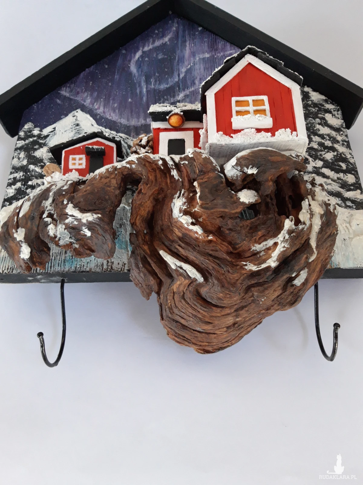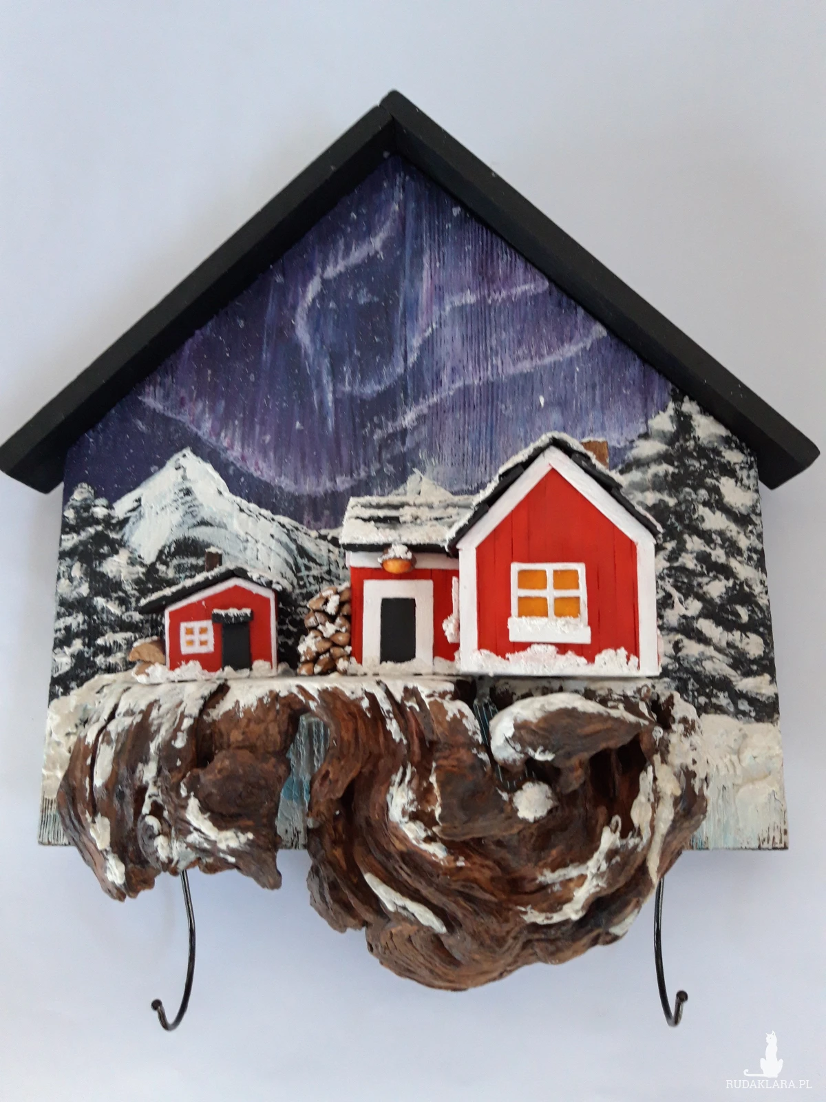 Wieszak na klucze i inne drobiazgi, który oprócz pełnienia swojej podstawowej funkcji podkreśla również piękno norweskich krajobrazów, gdzie drewniane, czerwone domki harmonijnie wpasowują się w zimową scenerię gór, a w tle tańczące " światło" Zorzy Polarnej. Wieszak może być świetnym dopełnieniem wystroju wnętrz w stylu skandynawskim.