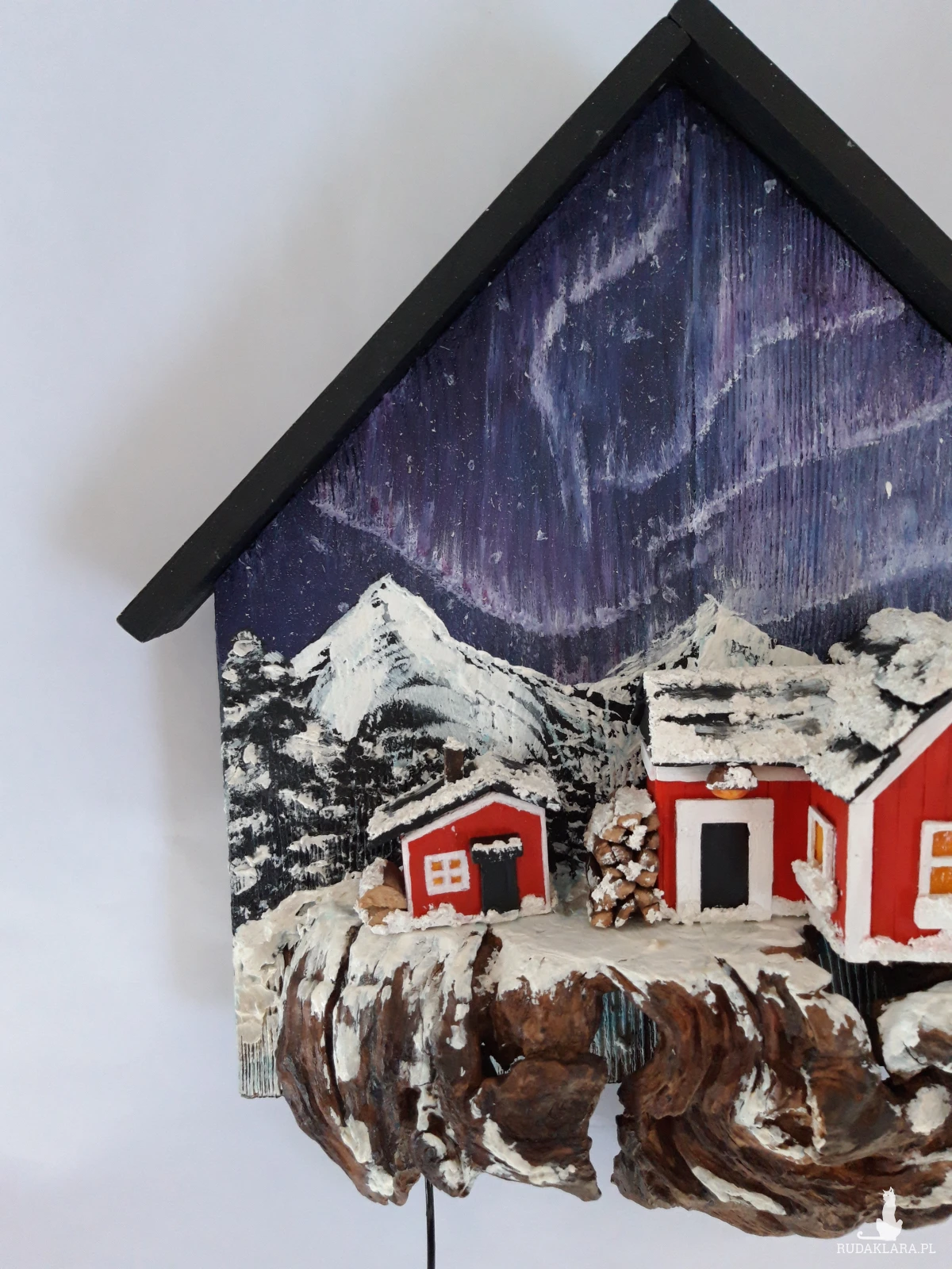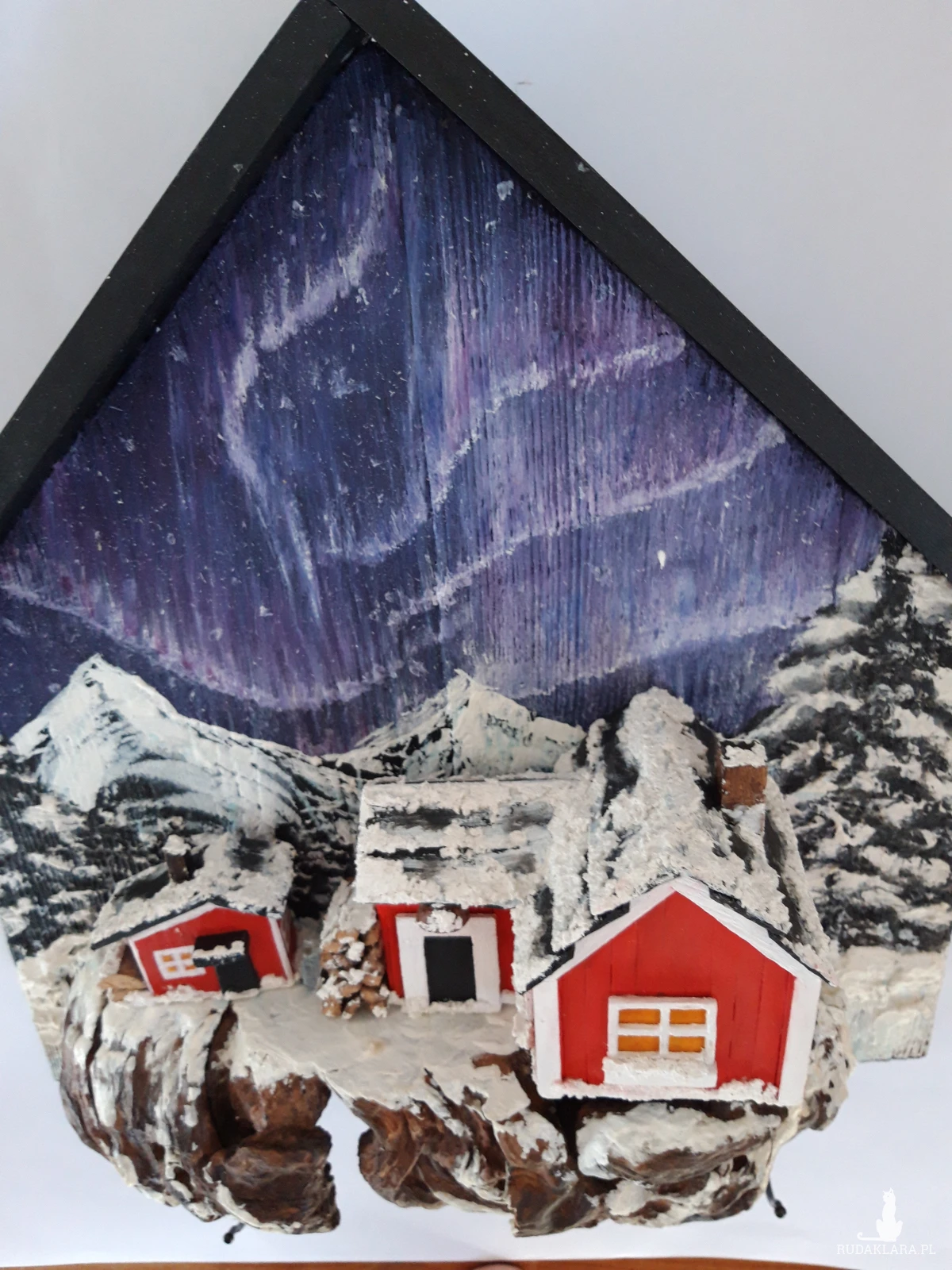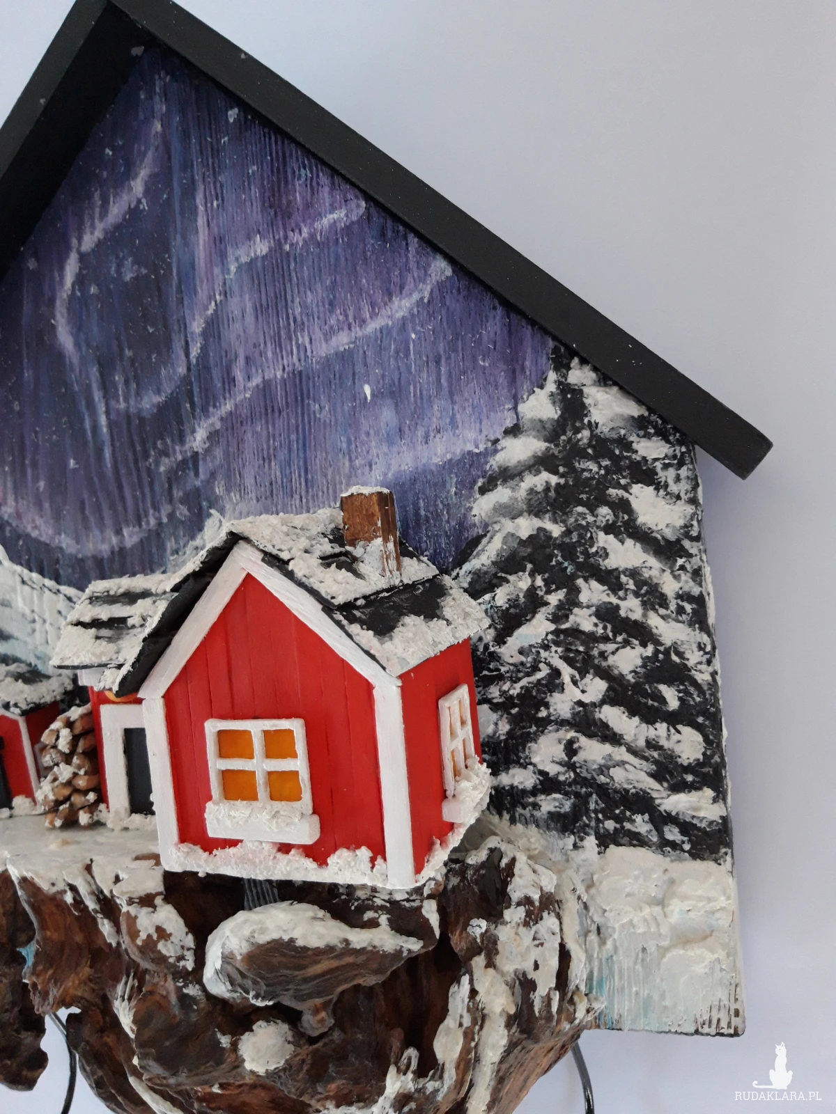 Wieszak na klucze i inne drobiazgi, który oprócz pełnienia swojej podstawowej funkcji podkreśla również piękno norweskich krajobrazów, gdzie drewniane, czerwone domki harmonijnie wpasowują się w zimową scenerię gór, a w tle tańczące " światło" Zorzy Polarnej. Wieszak może być świetnym dopełnieniem wystroju wnętrz w stylu skandynawskim.