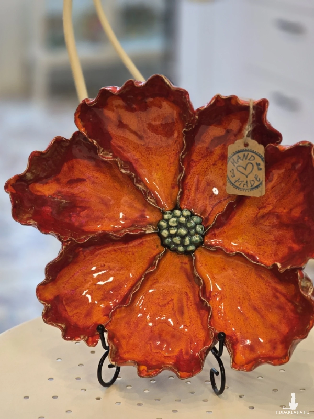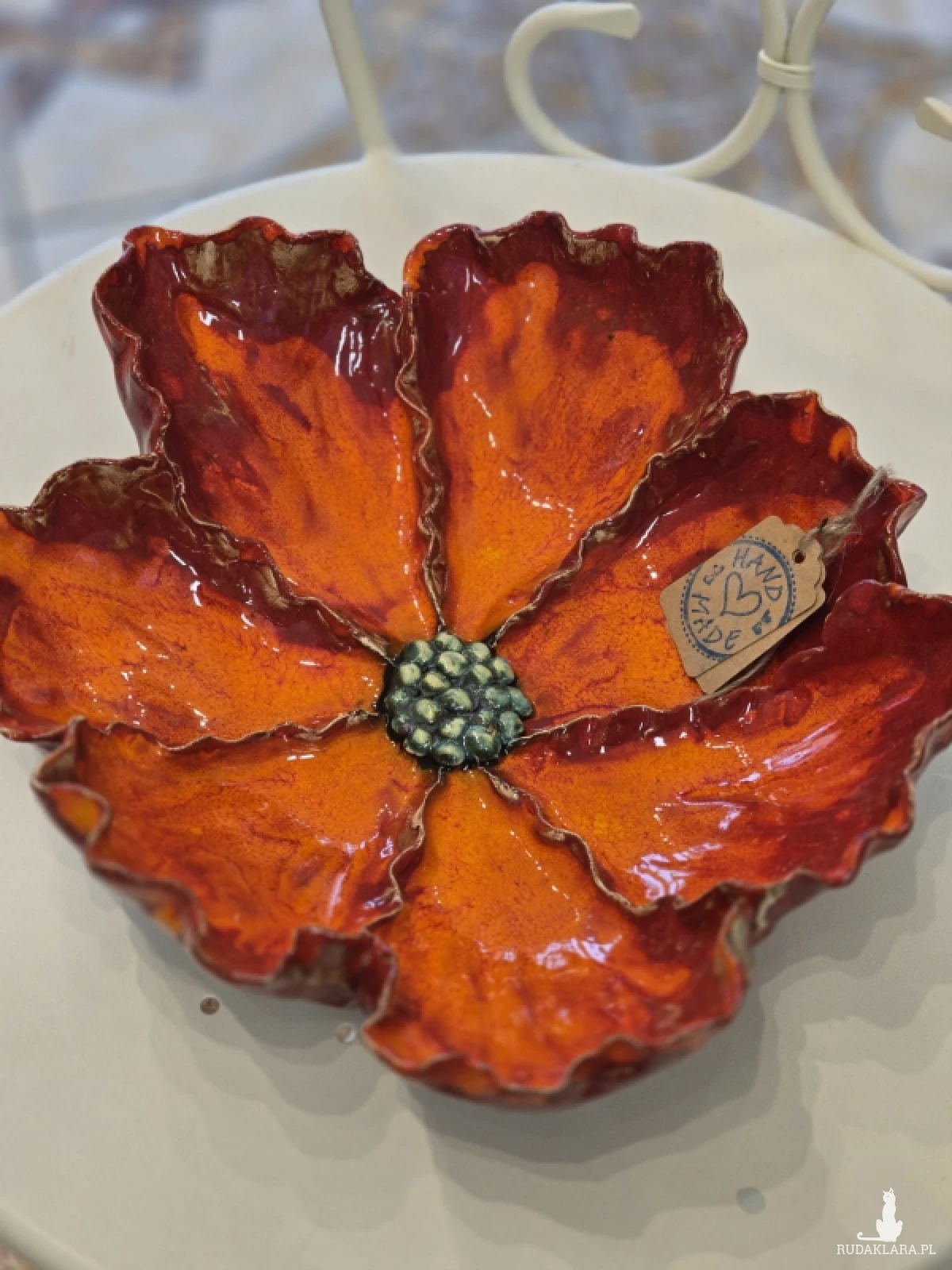 Przepiękny talerz w kształcie kwiata maku, wykonany z gliny. Wypalony dwukrotnie w temperaturze 950 stopni na biskwit i 1080 stopni ze szkliwem. Szkliwiony kilkoma odcieniami czerwieni, cieniowanie nadaje mu niepowtarzalny, uroczy wygląd, wszystkie przetarcia oraz cienie są efektem zamierzonym. Talerz wykonałam ręcznie, każdy następny będzie podobny ale nigdy taki sam. Średnica około 30 cm.https://www.facebook.com/share/p/14PbRQCfszP/