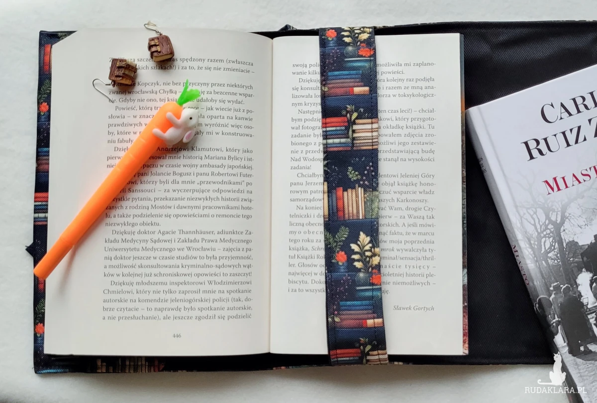- zapięcie na gumkę, dzięki czemu książka się nie otwiera, a okładka dostosowuje się do grubości tomu;
