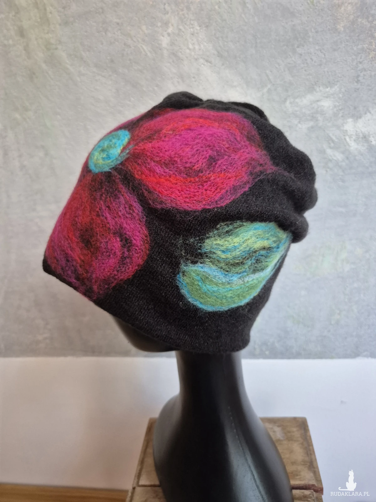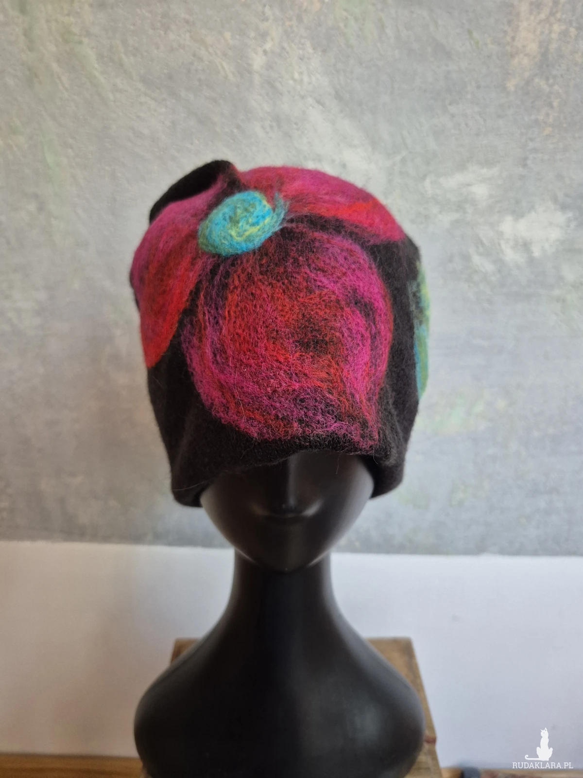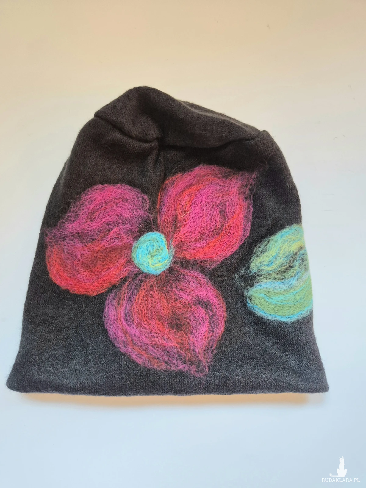 czapka wełniana filcowana zimowa czarba ostatnia, handmade w kwiaty na podszewce-- rozmiar uniwersalny, wełniana, filcowana wełną merynosów, bardzo ciepła, fantastyczna, miła, miękko układa się na głowie, niesamowicie zwraca uwagę, doskonałą na codzienne noszenie jak i na prezent, zawsze możesz ją założyć po basenie i przeżyjesz,box waliz