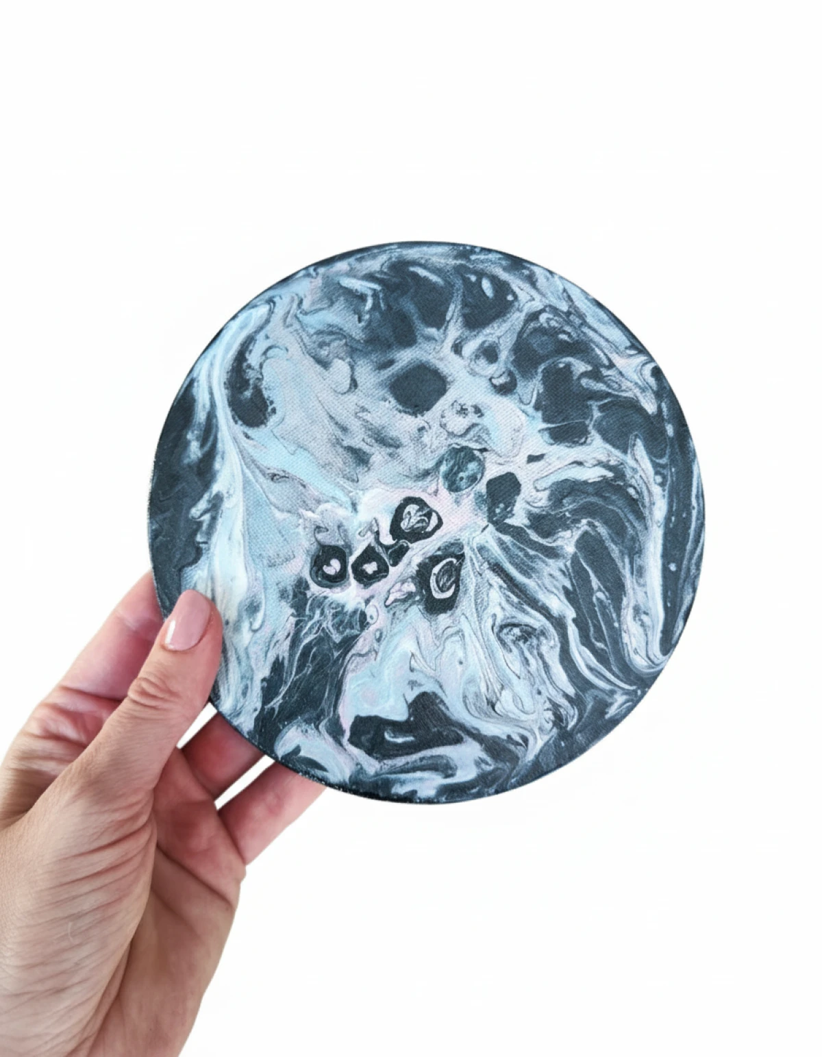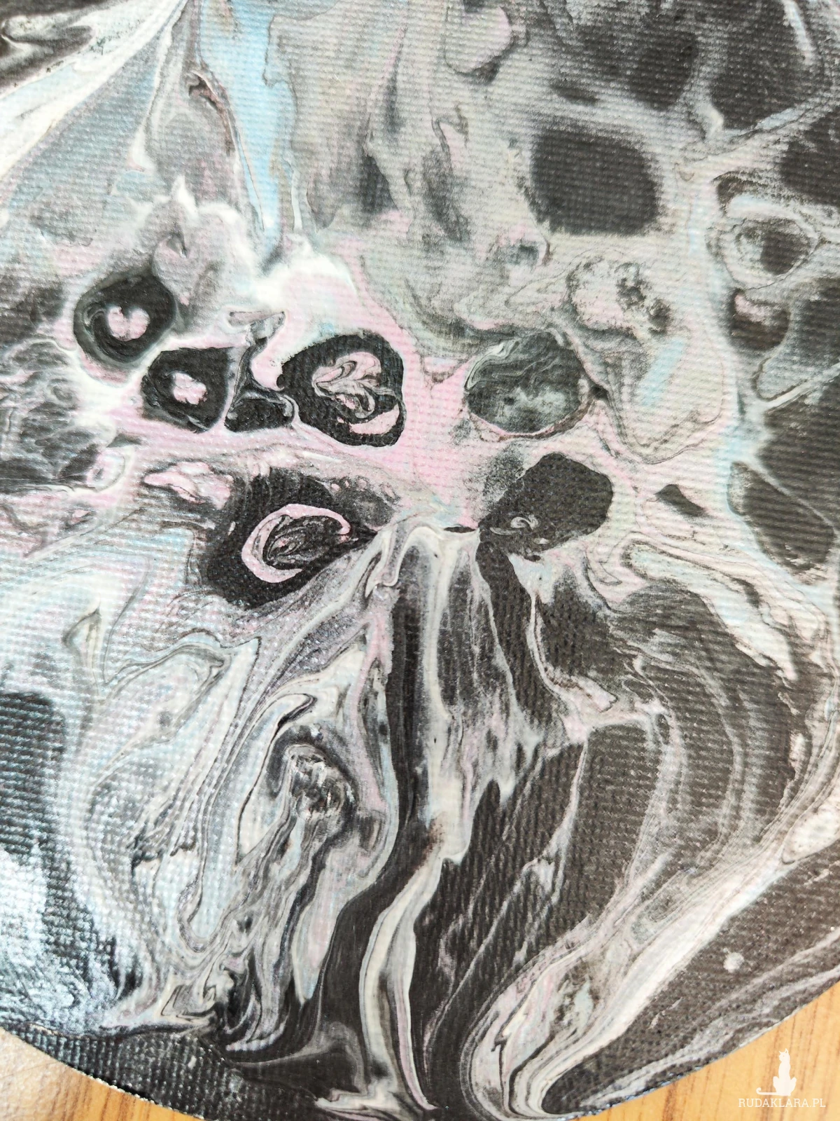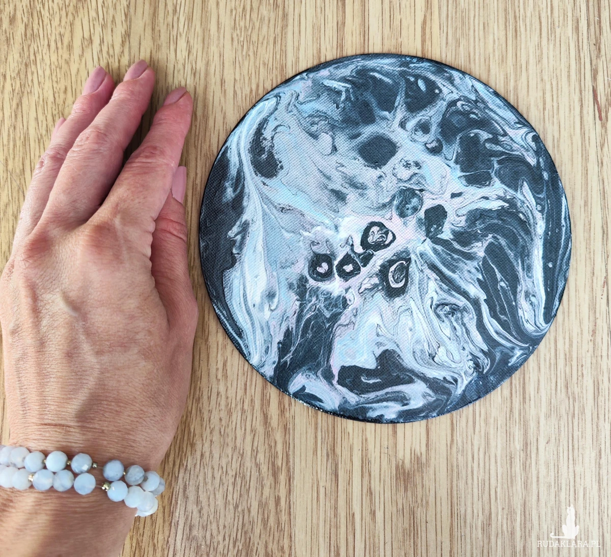 Stworzony techniką acrylic pouring, jest absolutnie wyjątkowy -każdy egzemplarz to niepowtarzalna kompozycja kolorów i wzorów.