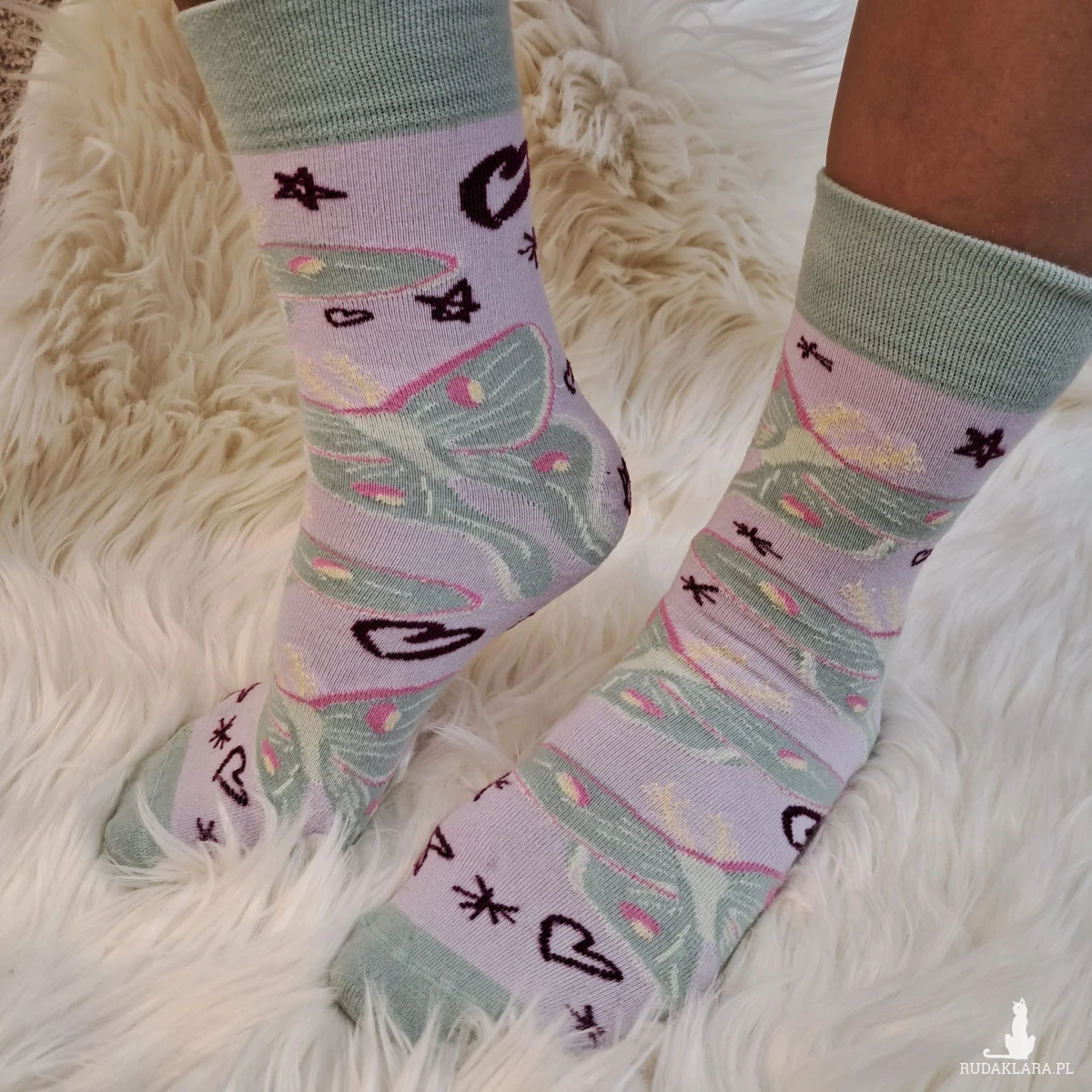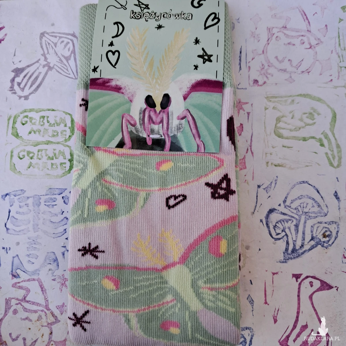 Skarpetki w ćmy księżycówki w rozmiarze uniwersalnym. Sama zaprojektowałam wzór i etykietę. Skarpetki są zrobione z 80% bawełny, 15% poliamidu, 5% elastanu. Należy prać na lewej stronie.