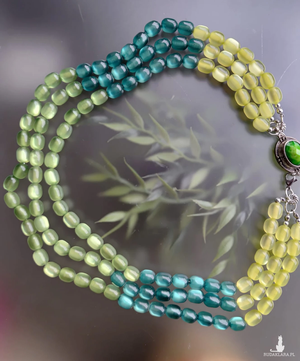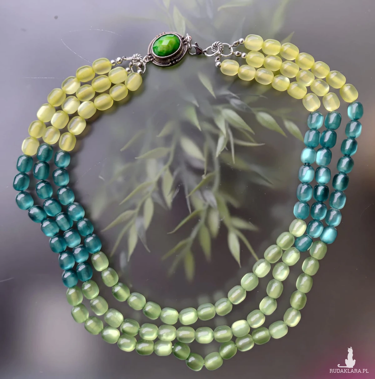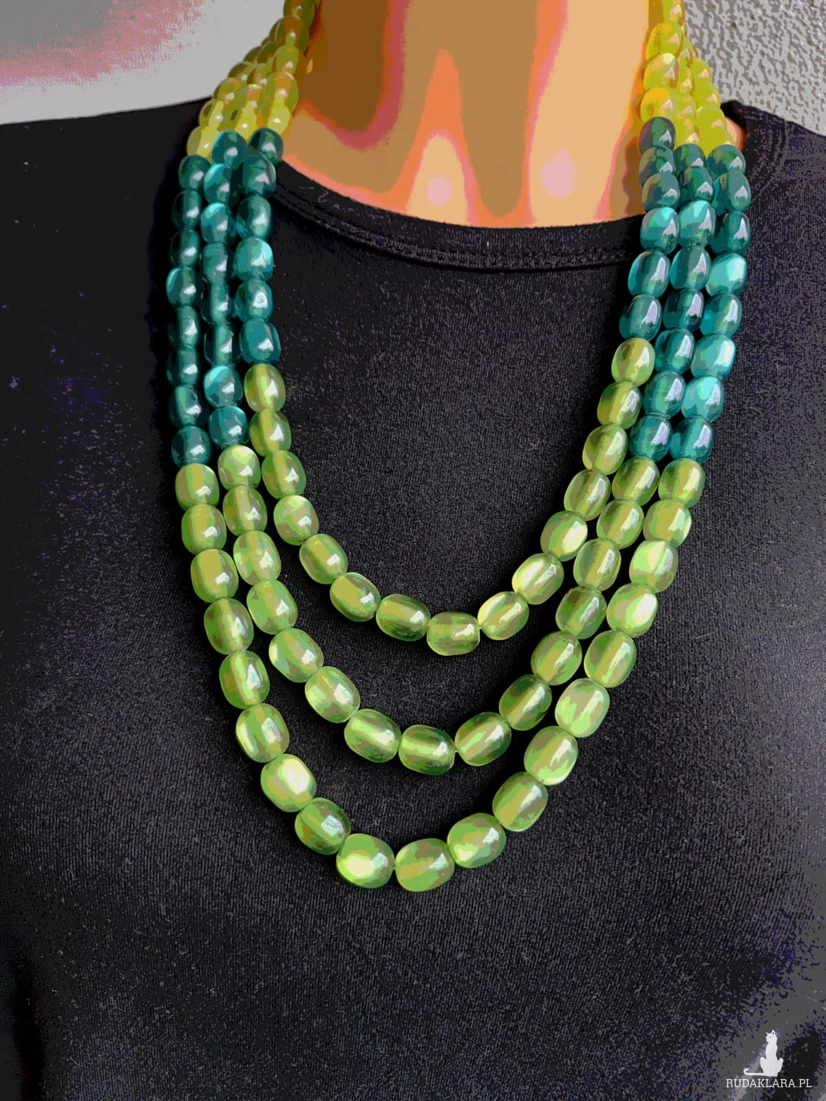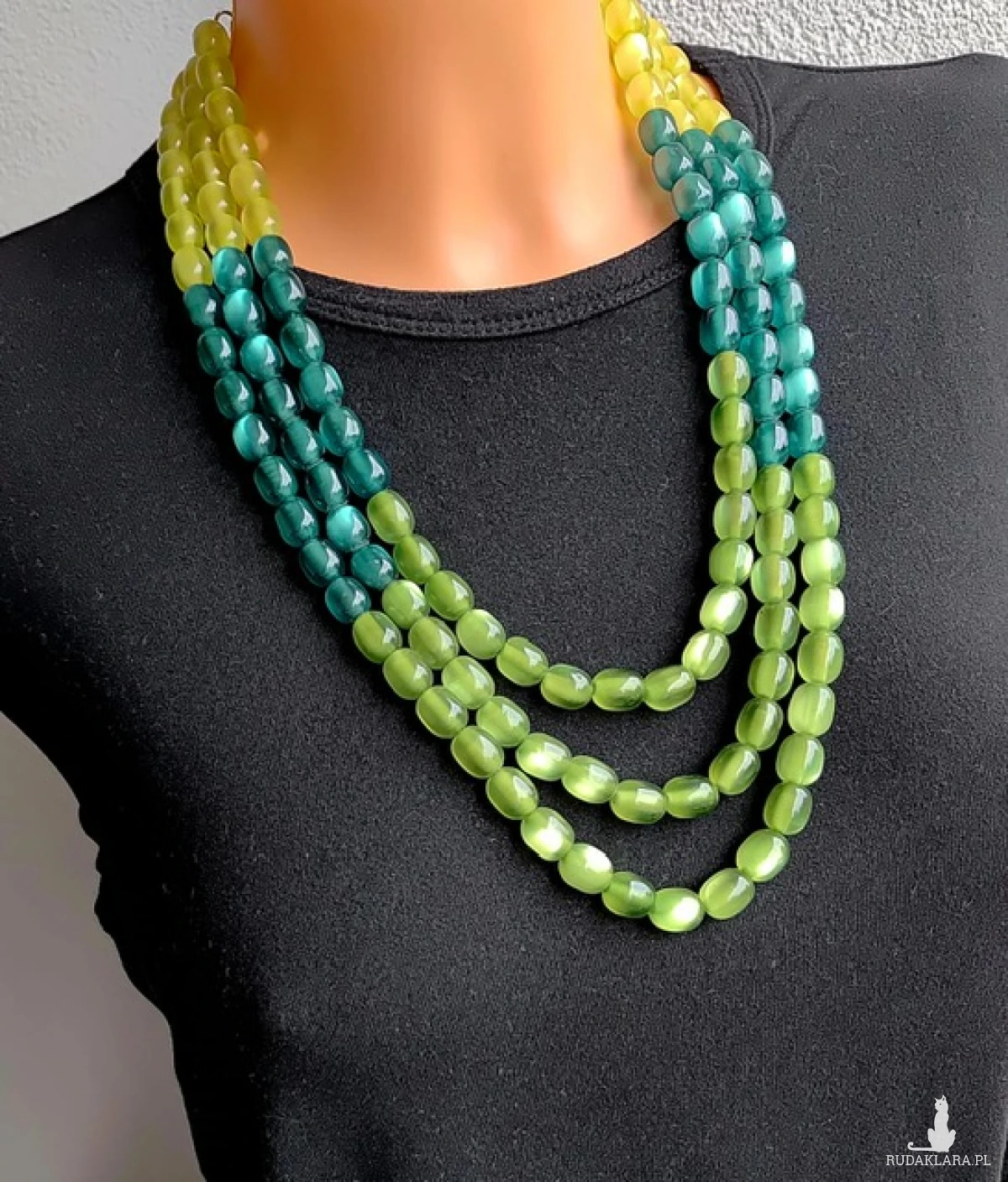 Naszyjnik z koralików akrylowych w kształcie oliwek. Trzy odcienie zieleni. pięknie się prezentuje. Wykończenie metalowe. Zapięcie ozdobne, metalowe. Karabińczyk ze stali nierdzewnej. Piekne korale do wielu stylizacji. Długość 35 cm