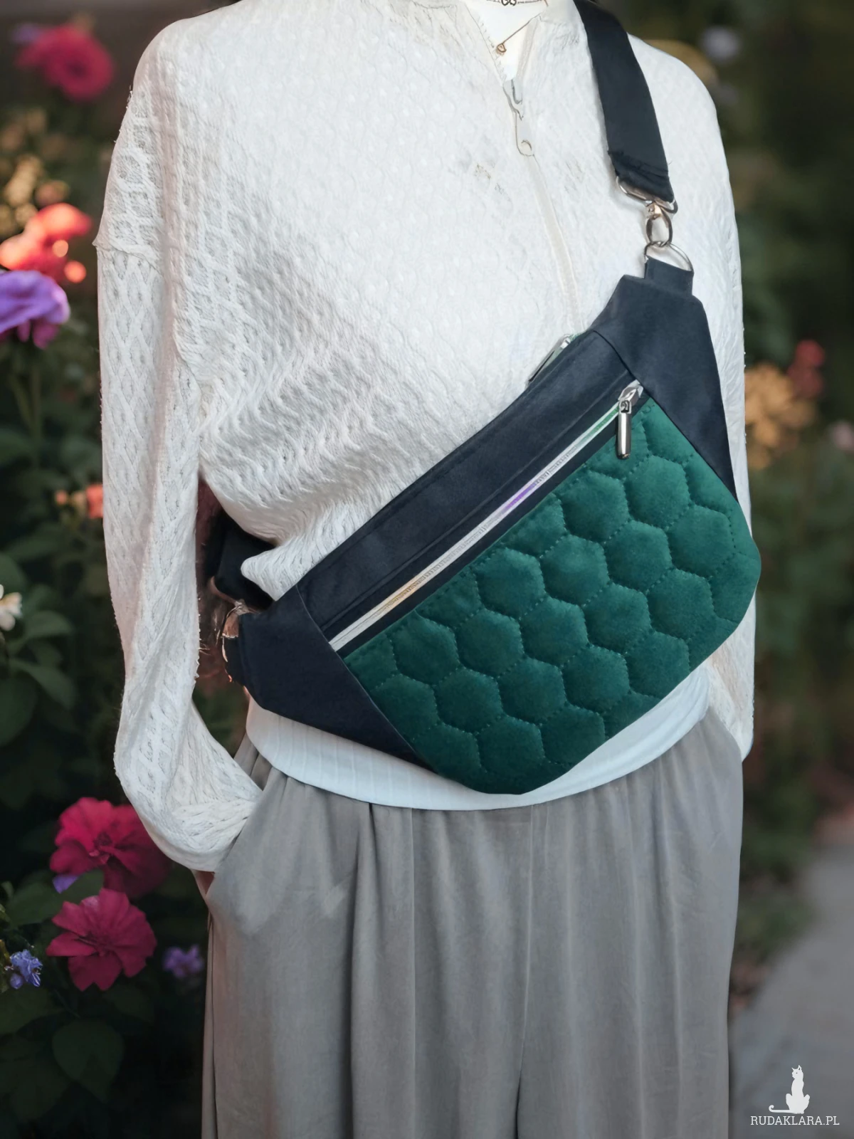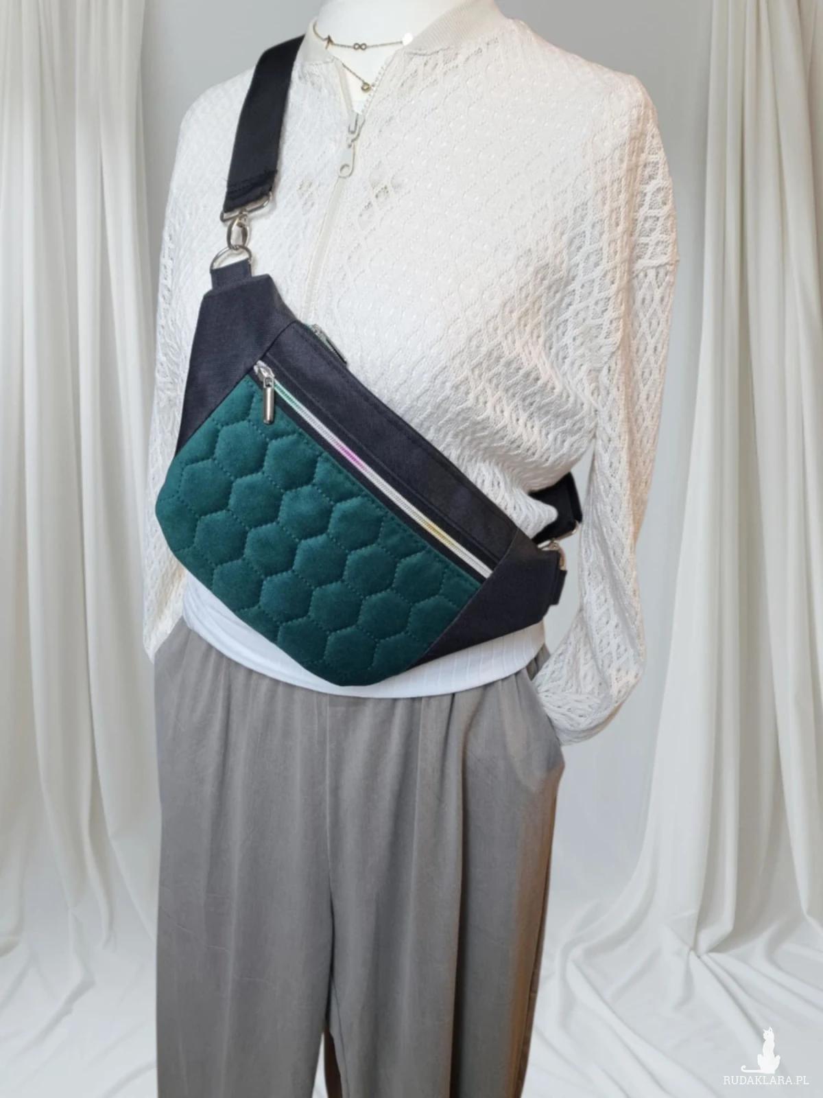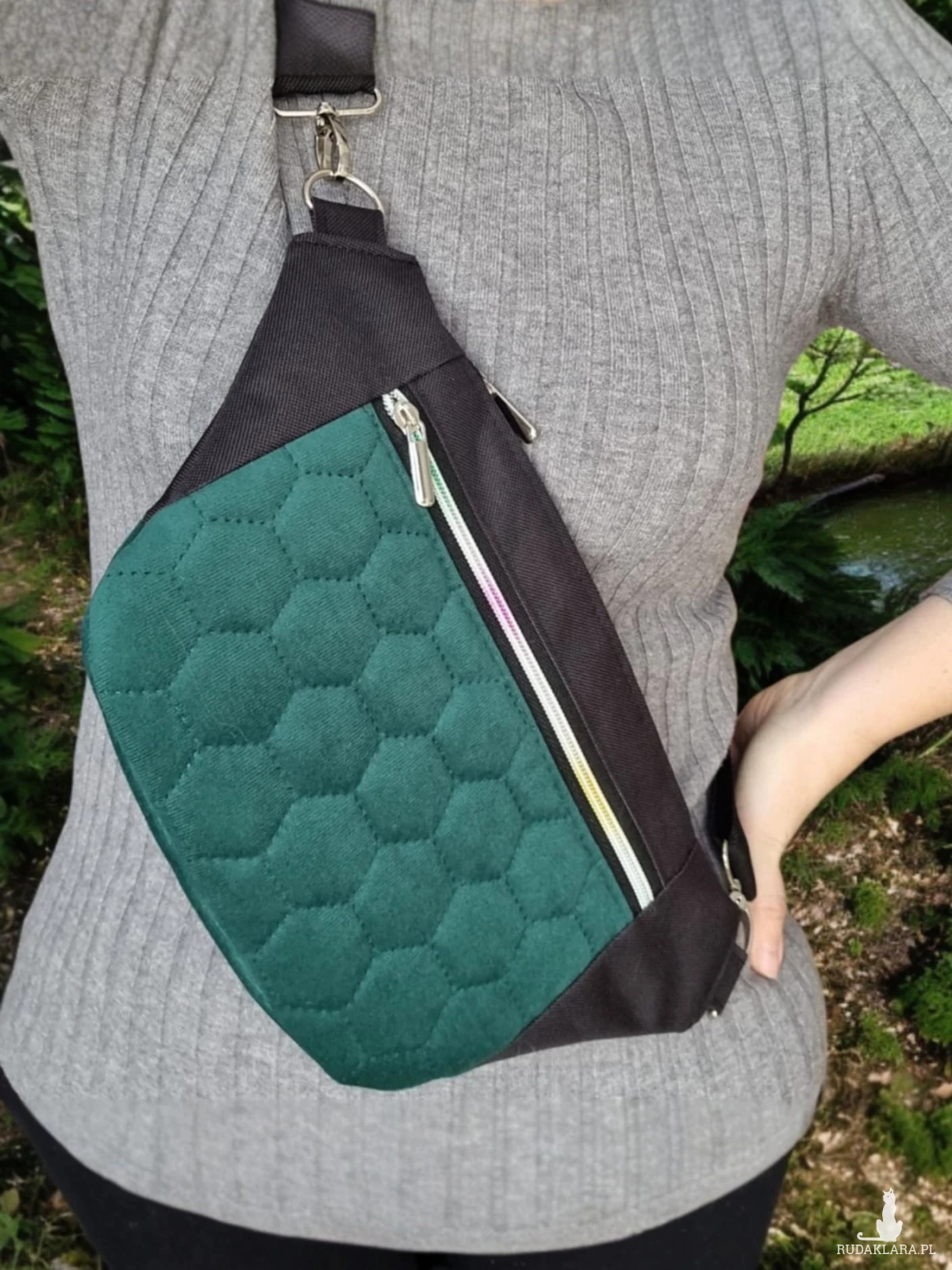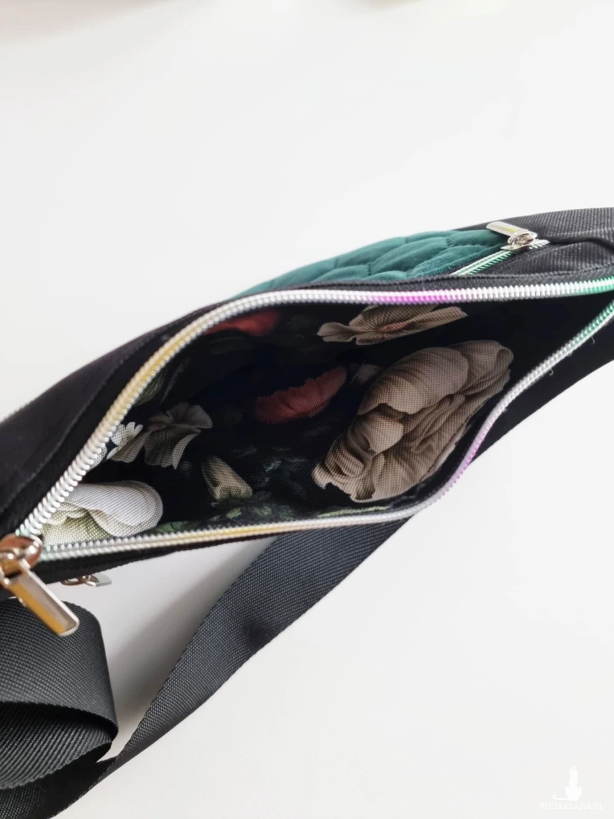 Tęczowe zamki z błyszczącymi, srebrnymi suwakami dodają nerce figlarnego uroku, jak iskierki rozświetlające codzienność. Miękki, szeroki, parciany pasek otuli Twoje ramię, zapewniając komfort i lekkość – bo Emma ma być przyjaciółką w podróży, nie ciężarem.