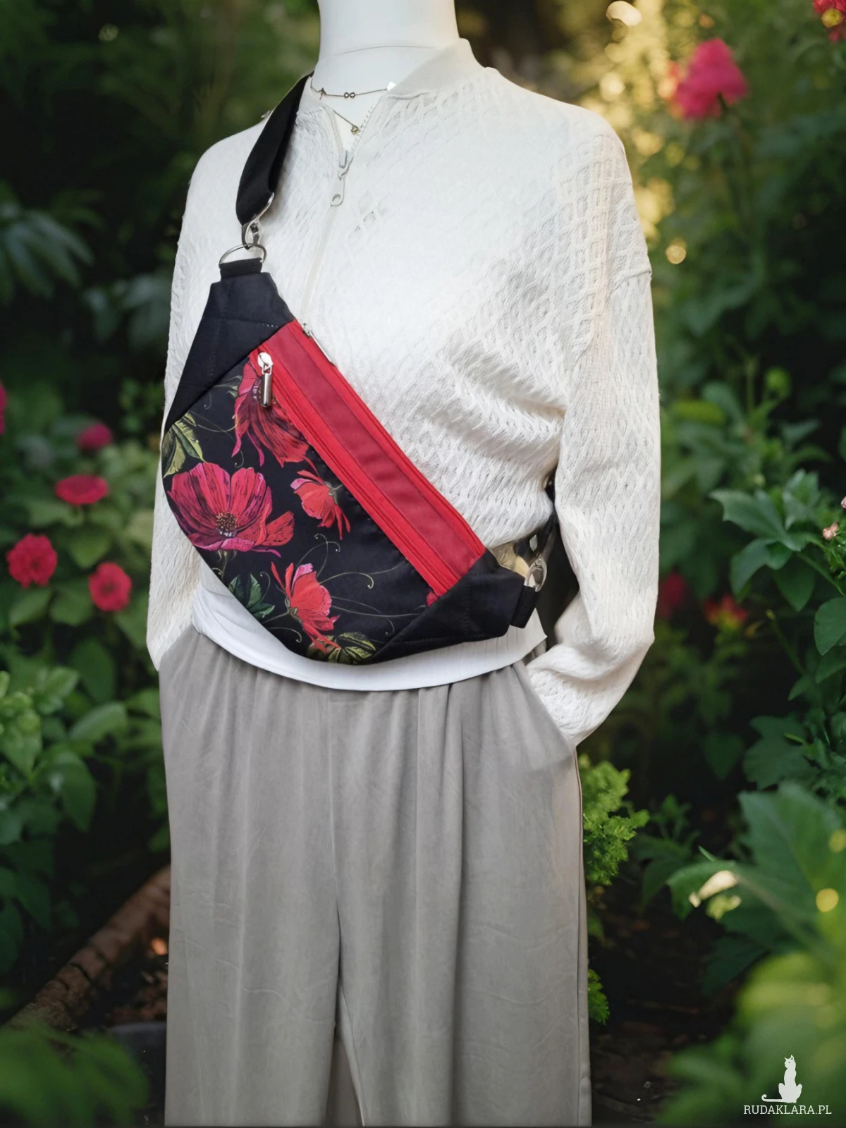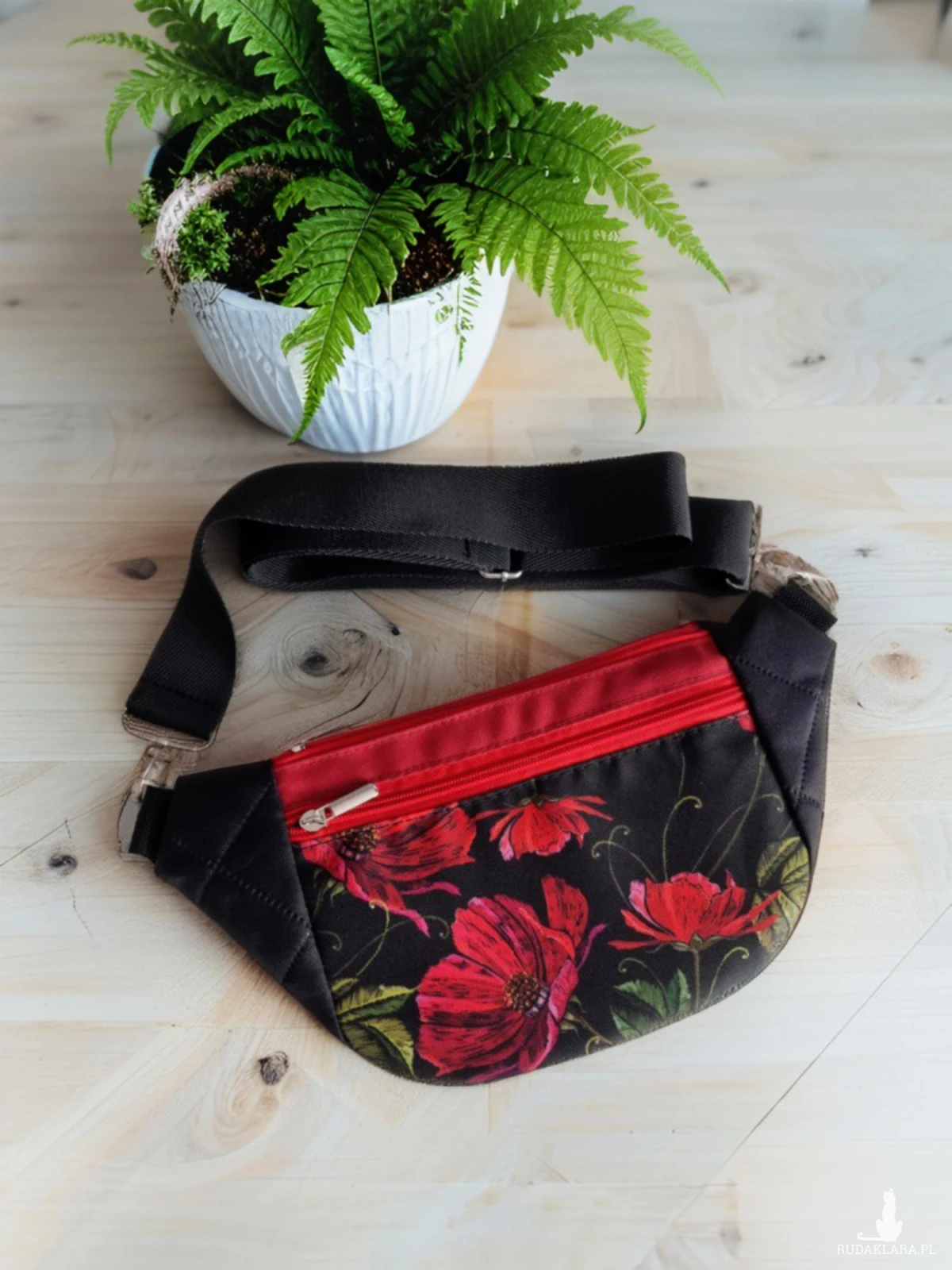 W pracowni narodził się pomysł na coś, co łączy w sobie lekkość i charakter. Tak powstała Emma – nerka, która pomieści wszystko, co potrzebne, a przy tym wygląda jak mały skarb przy Tobie. Czarne tło, na którym rozkwitają czerwone maki, spotyka się z pikowanymi bokami i miękkim, parcianym paskiem – połączenie faktur, które dodaje jej rytmu i życia. Kieszonka z przodu, z tyłu i główna w środku dbają, żeby każdy drobiazg miał swoje miejsce. Emma to nie tylko nerka – to mała opowieść o kobiecości, stylu i wolności ruchu, którą możesz nosić przy sobie każdego dnia.