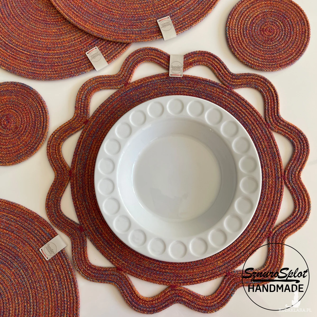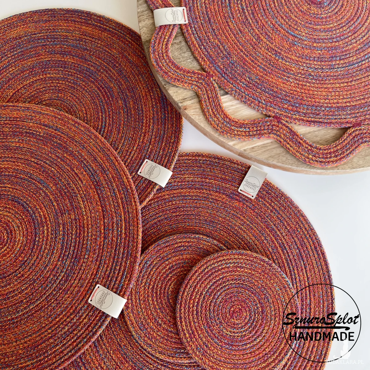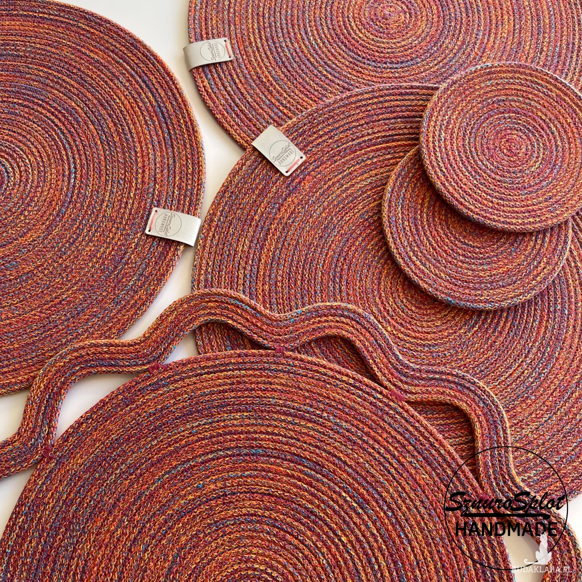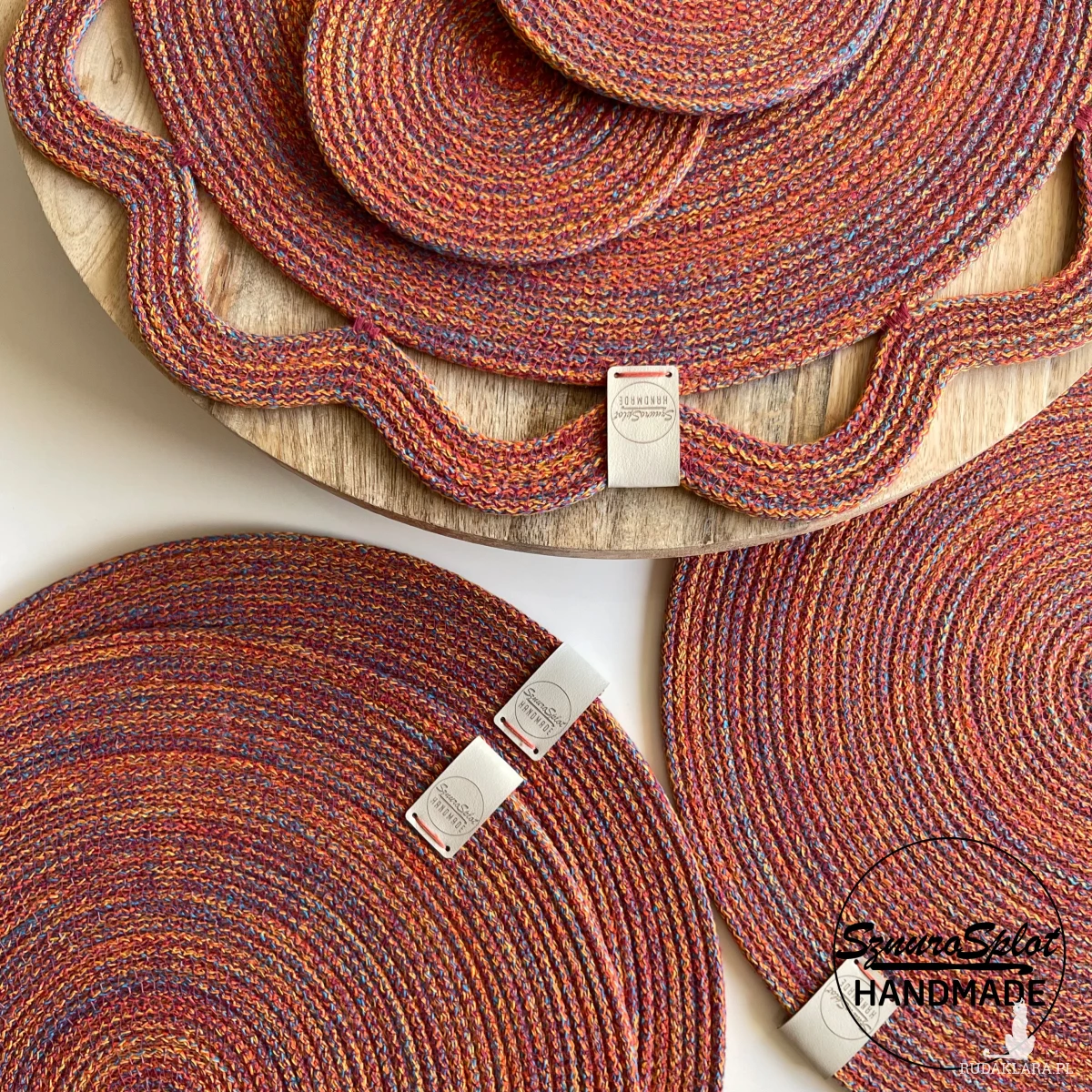 Podkładki ze sznurka uszyte w przykładowej kolorystyce ciepłego melanżu (nie zamieszczony we wzorniku, ale dostępny)