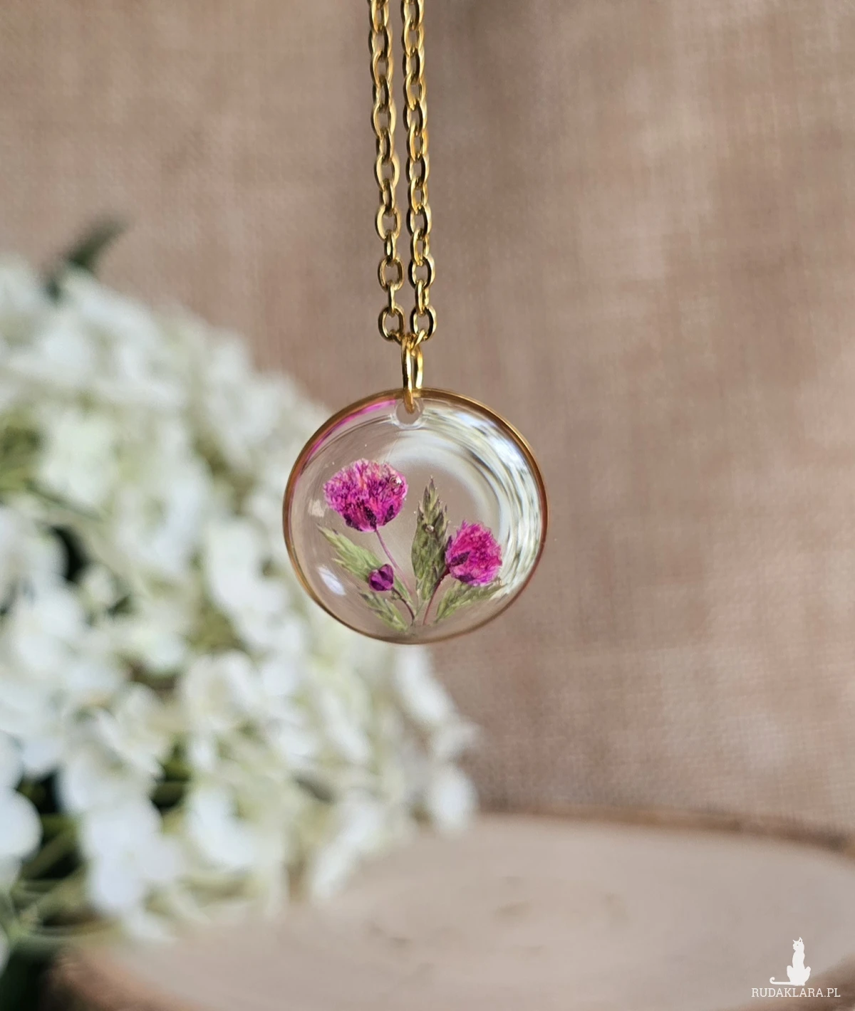 Oferuję Państwu unikalną biżuterię. Zawieszka jest wykonana z suszonych kwiatów i żywicy epoksydowej. Biżuteria jest wspaniałym i oryginalnym prezentem na lata.