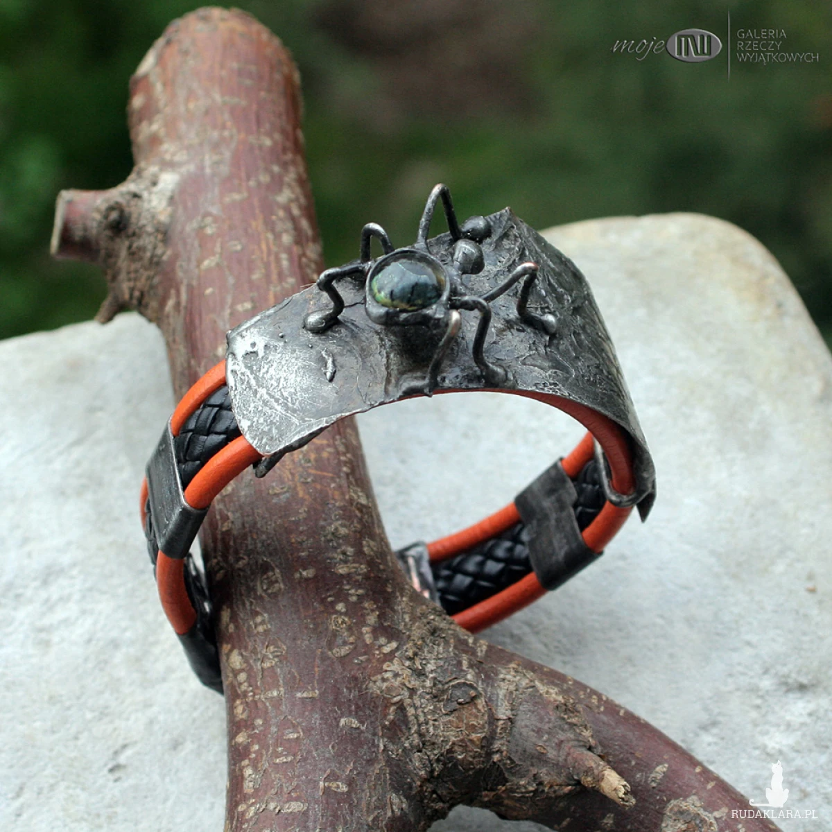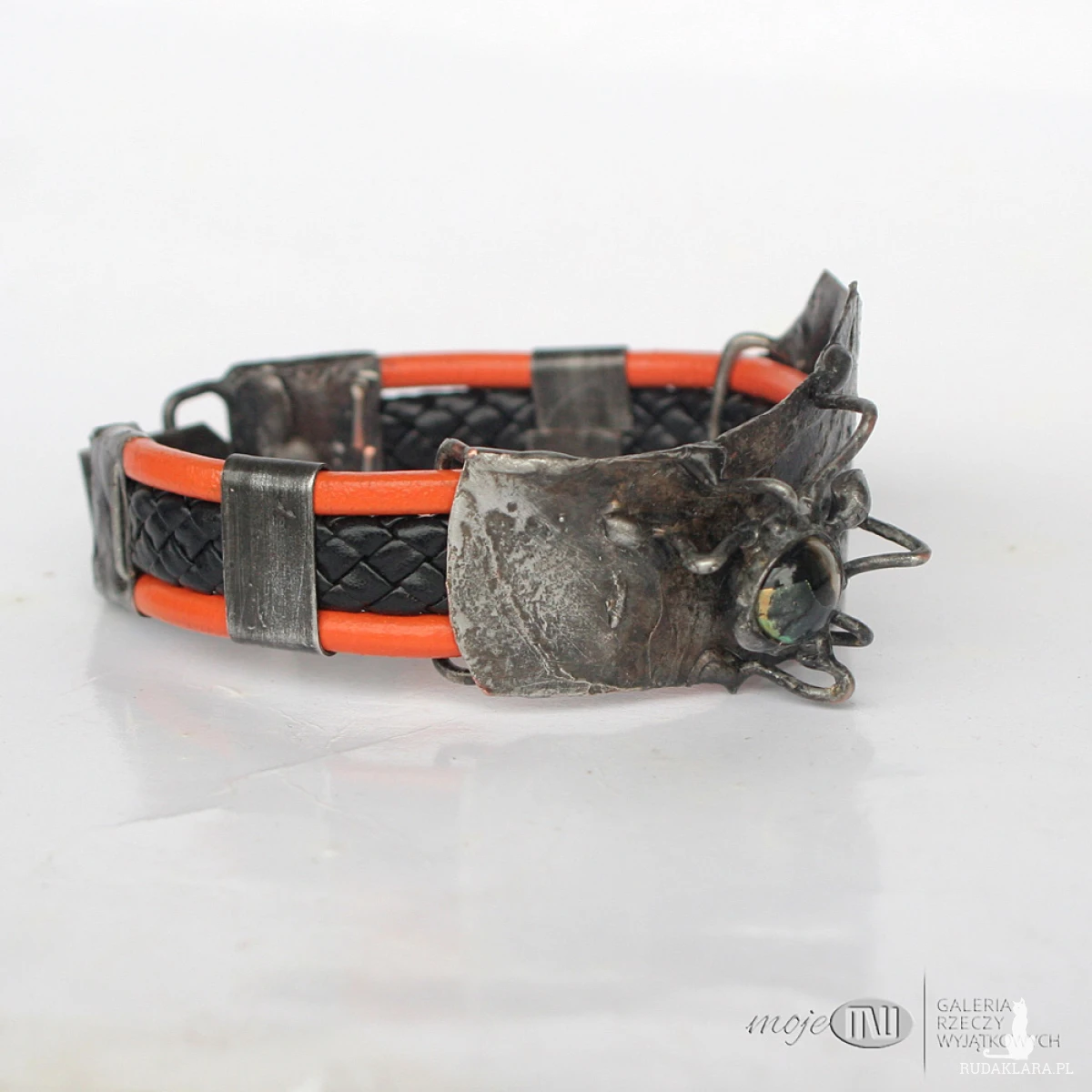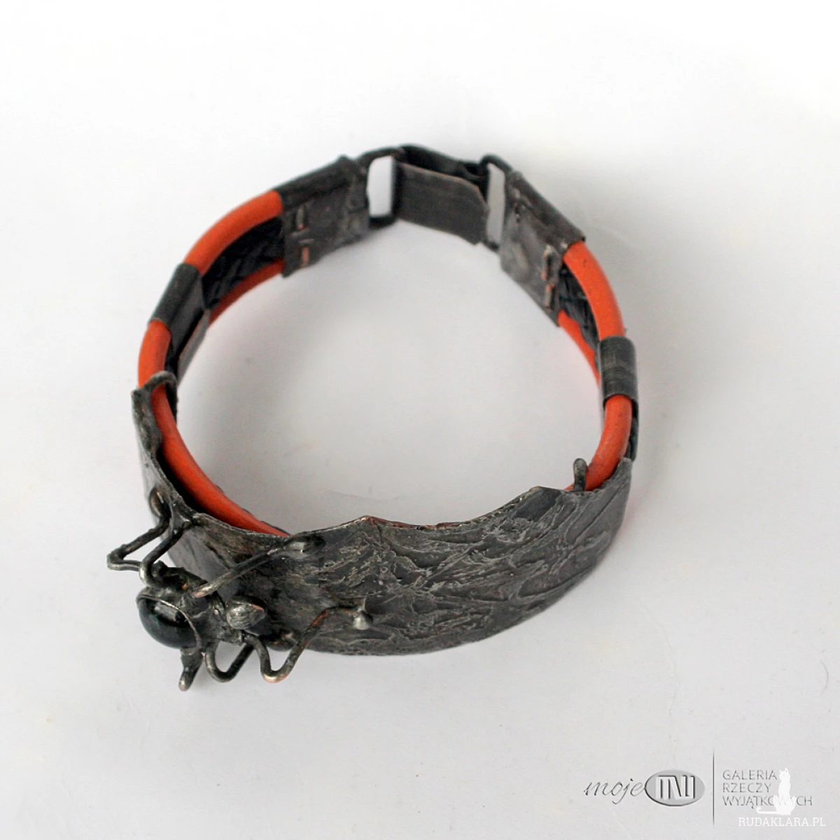 Bransoleta z trawionej miedzianej blachy i skórzanych rzemieni. Głównym elementem jest trójwymiarowy pająk. Jego tułów wytopiłam metodą fusingu ze szkła, oprawiony i wykończony jest miedzią. Miedź pokryta jest cyną, patynowaną i przecieraną dla wydobycia wzorów. Bazą maneli są skórzane rzemienie - okrągłe pomarańczowe i płaska czarna plecionka.