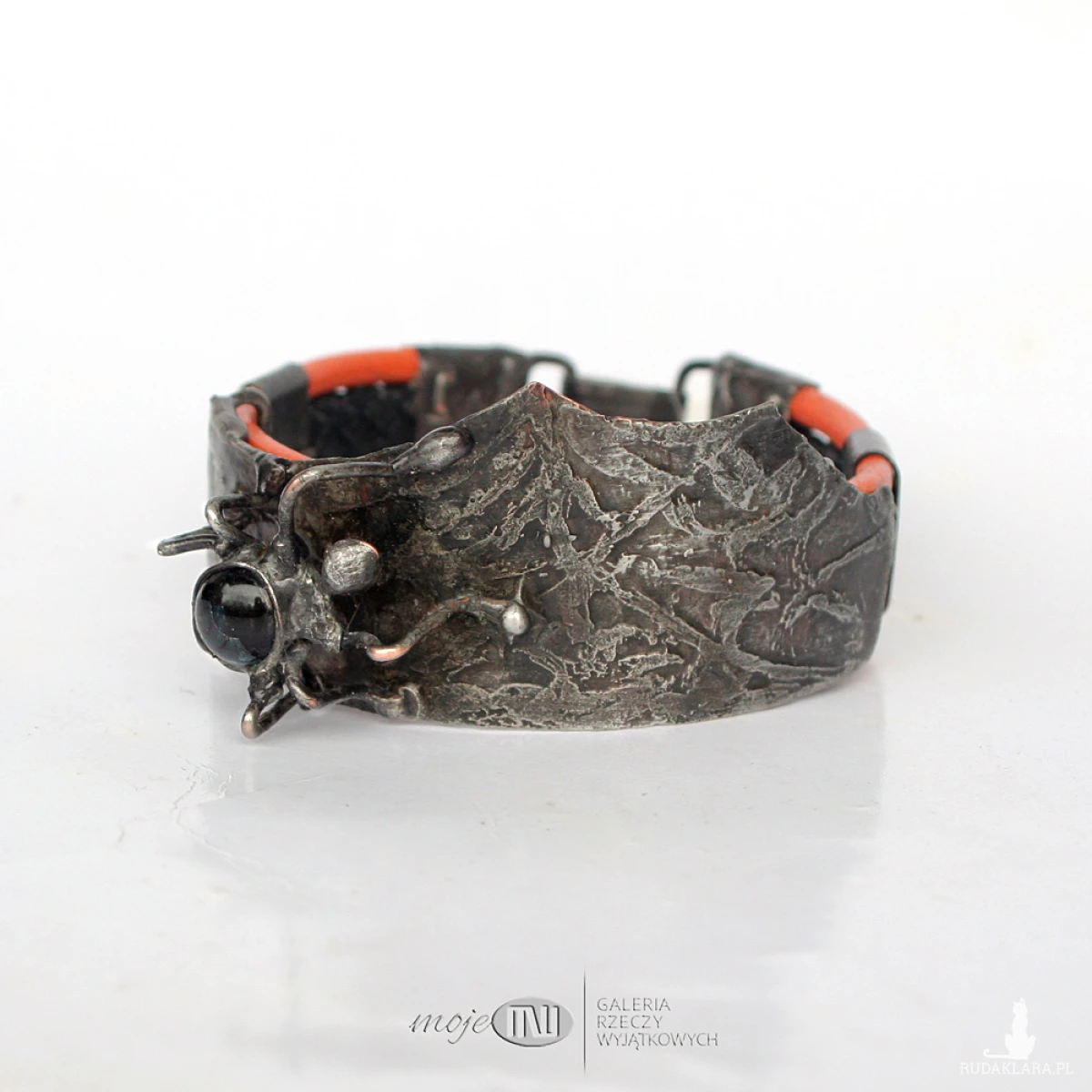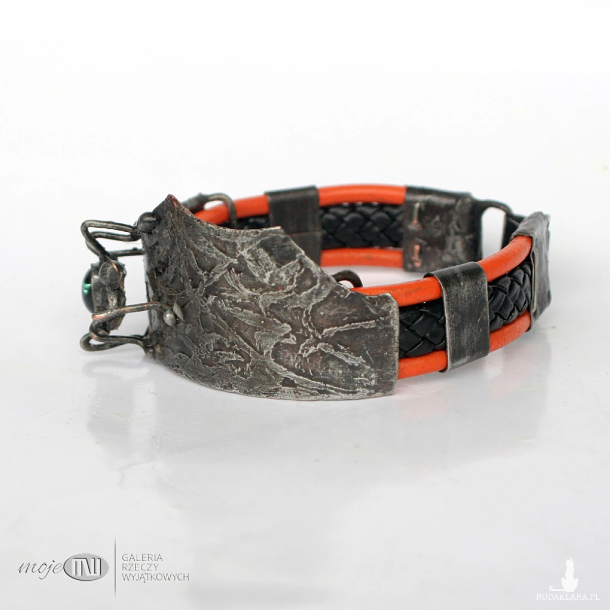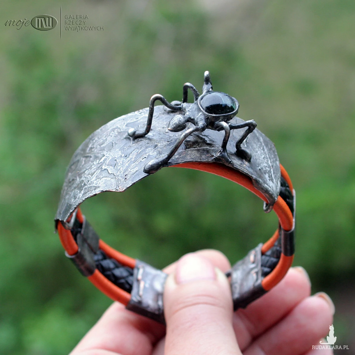 Bransoleta z trawionej miedzianej blachy i skórzanych rzemieni. Głównym elementem jest trójwymiarowy pająk. Jego tułów wytopiłam metodą fusingu ze szkła, oprawiony i wykończony jest miedzią. Miedź pokryta jest cyną, patynowaną i przecieraną dla wydobycia wzorów. Bazą maneli są skórzane rzemienie - okrągłe pomarańczowe i płaska czarna plecionka.