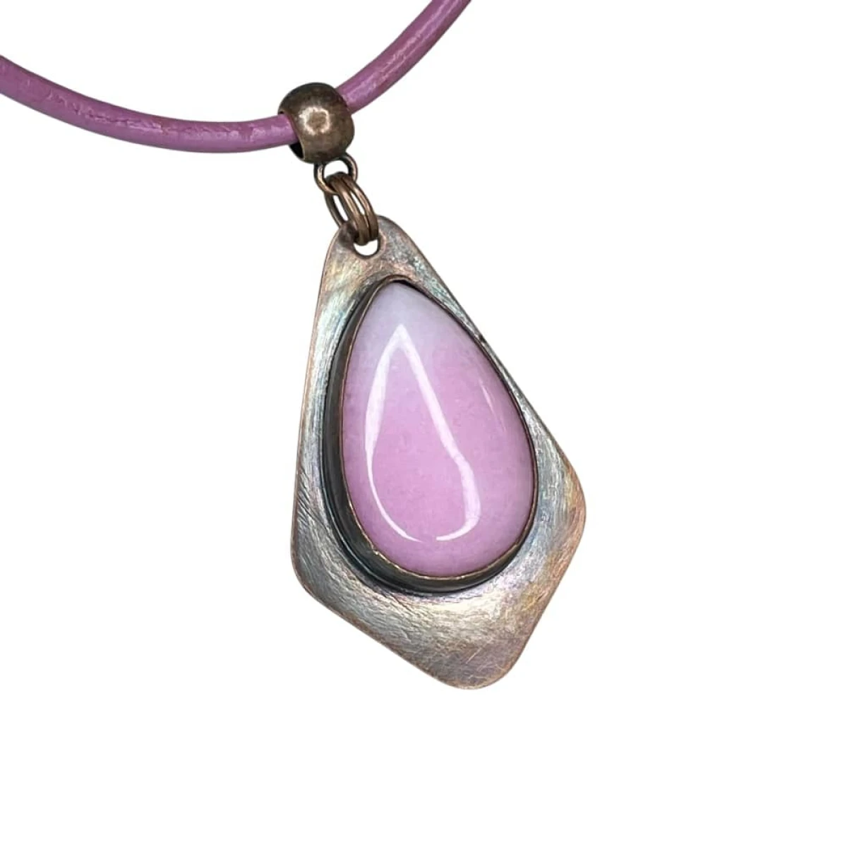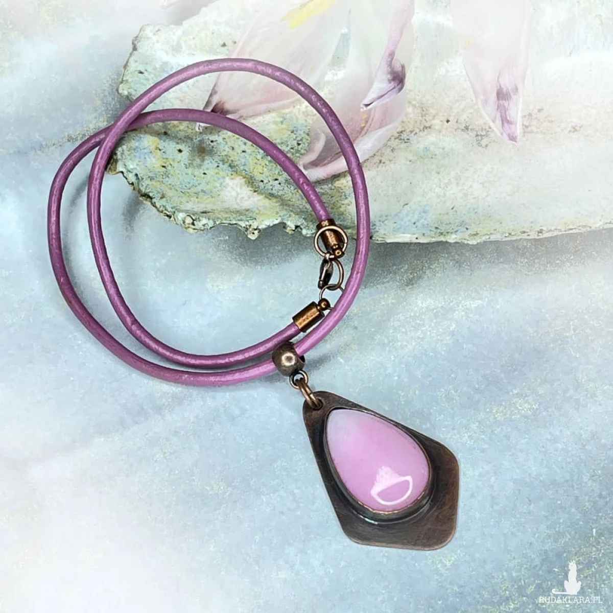 Delikatny róż i ciepła miedź tworzą wyrazistą, ale harmonijną parę. Centralny punkt naszyjnika stanowi geometryczna zawieszka z pastelowym jadeitem, który przyciąga wzrok subtelnym, kobiecym odcieniem. Otulony polerowaną i oksydowaną miedzią kamień zyskuje szlachetny charakter, a różowy rzemień nadaje całości lekkości i nowoczesnej swobody.