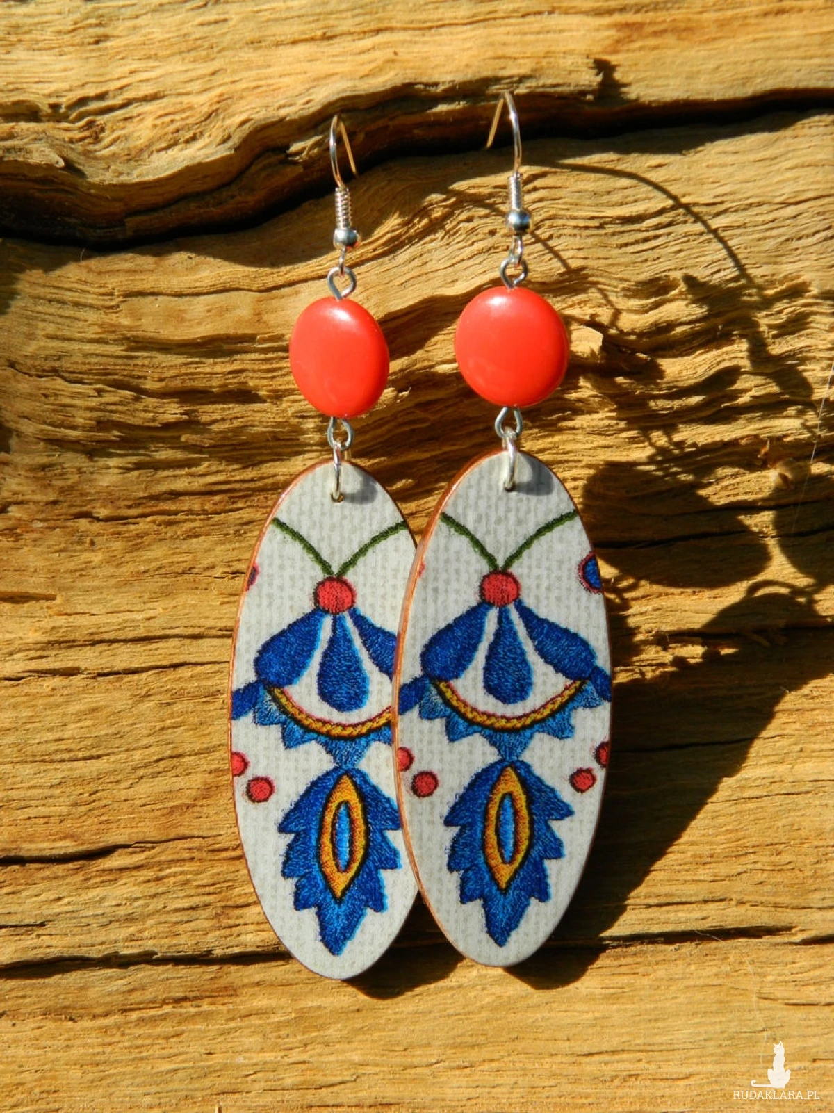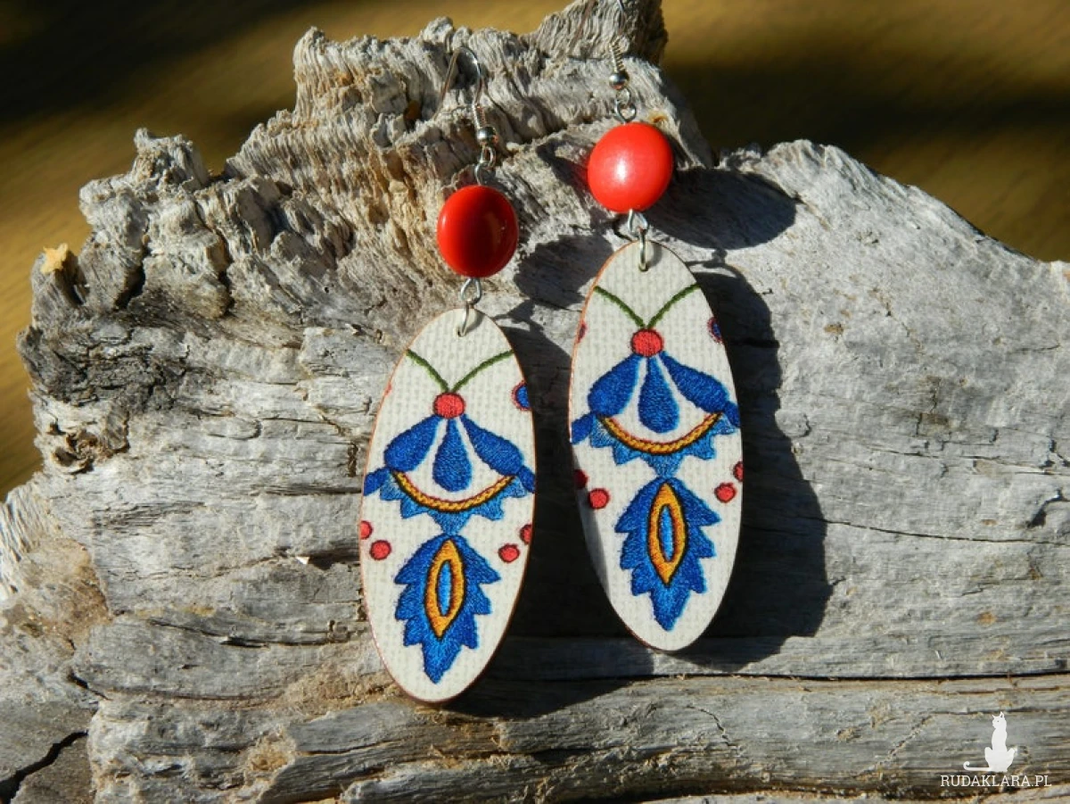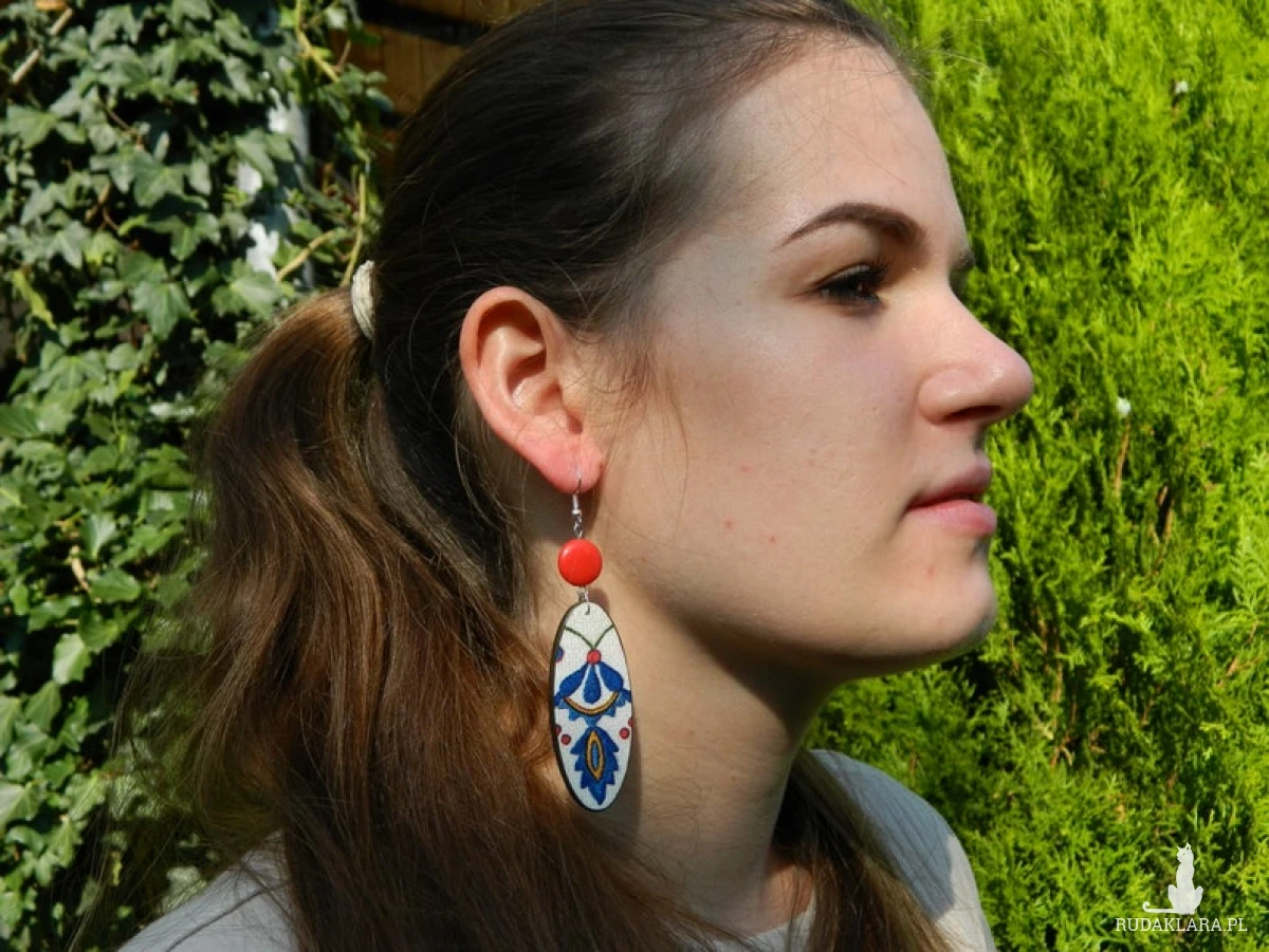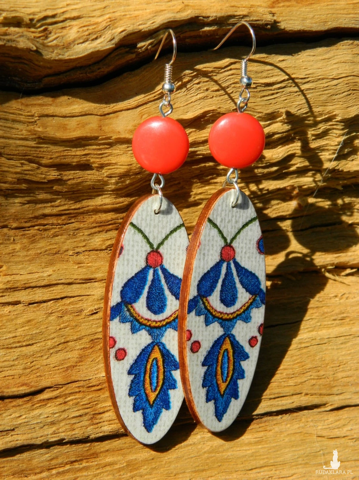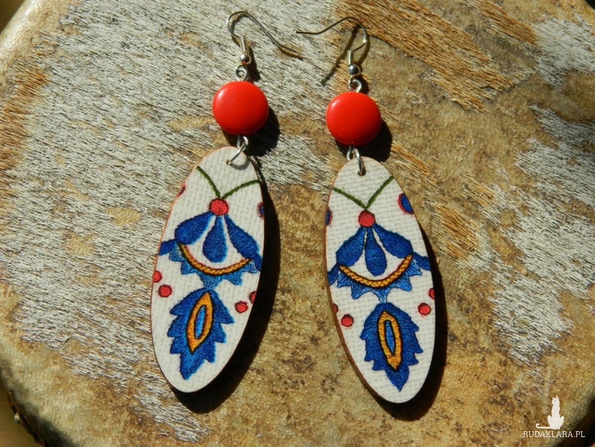Lekkie, drewniane kolczyki, zdobione dwustronnie metodą decoupage'u. Wielokrotnie pokryte lakierem akrylowym w celu zabezpieczenia i zapewnienia trwałości. Bigle antyalergiczne.