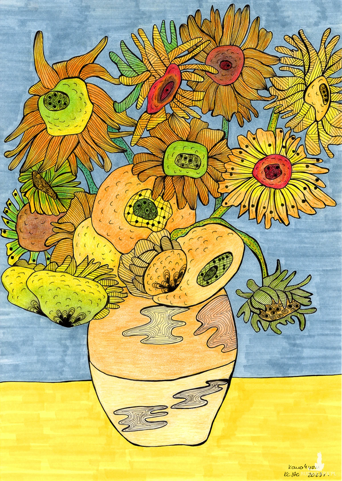 Ekspresyjna ilustracja przedstawiająca bukiet słoneczników w wazonie, wyraźnie inspirowana stylem Vincenta van Gogha, ale wzbogacona elementami Doodle Art / Zentangle.