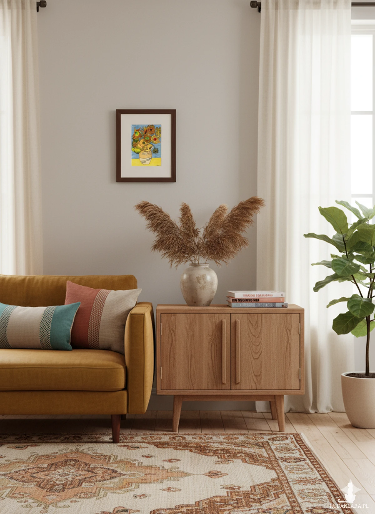 Intensywne odcienie żółtego i pomarańczowego dominują w kwiatach, które są dynamiczne i lekko zdeformowane. Odróżnia je jednak precyzyjne wypełnienie detalami (wzory geometryczne i organiczne) w centrach kwiatów i na wazonie. Tło jest proste — niebieska ściana i żółty stół — co podkreśla kontrast między ekspresją a medytacyjnym detalem.