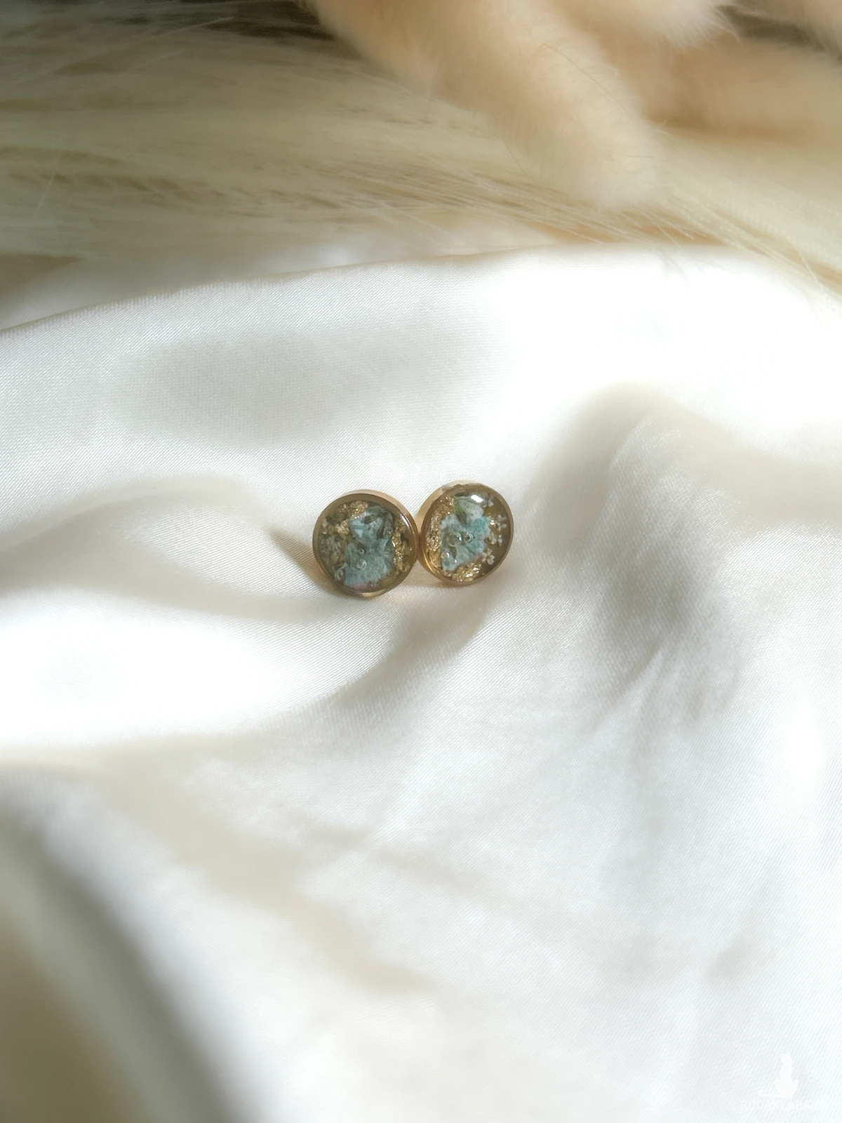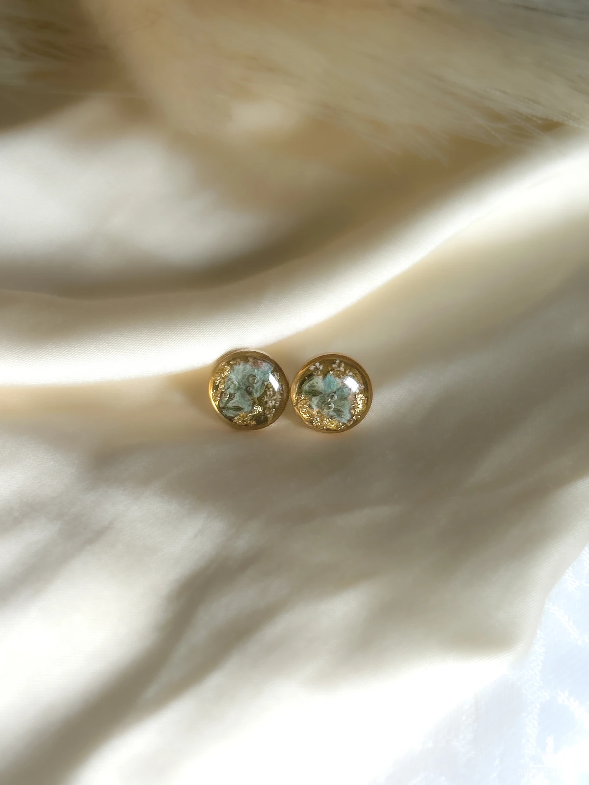 ✨ Ręcznie robione kolczyki wkrętki z prawdziwymi kwiatami zatopionymi w lśniącej żywicy. Całość oprawiona w złote kółeczko ✨