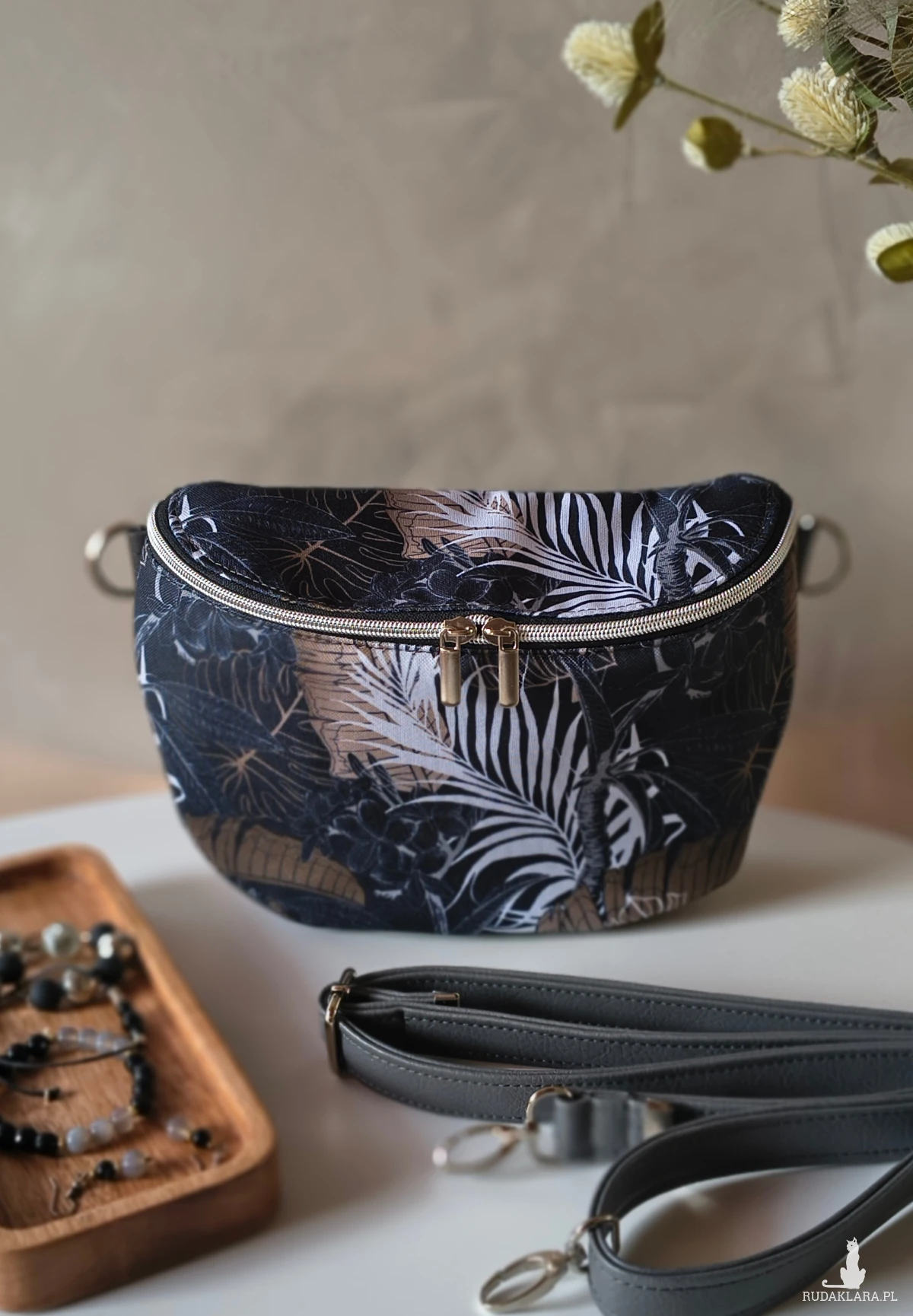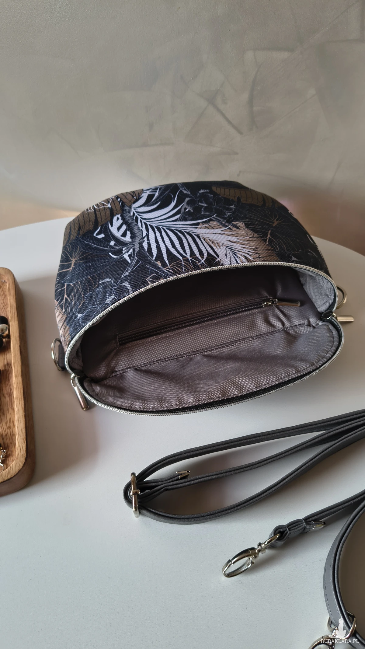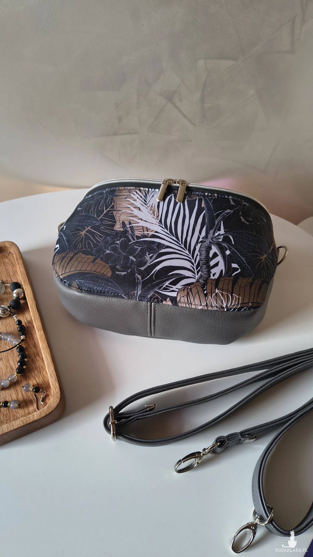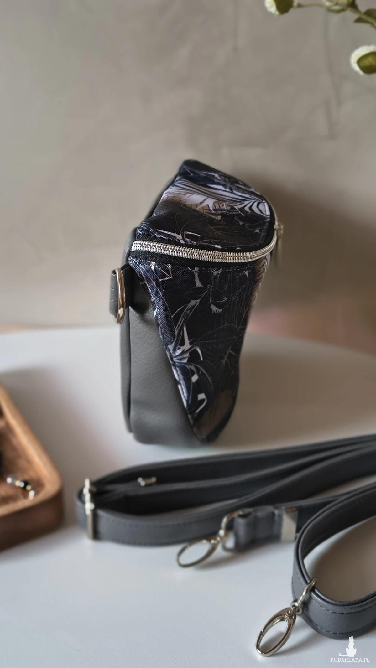 Torebka wykonana z ekoskóry w kolorze ciemno szarym oraz poliestru wodoodpornego w liście. Wewnątrz znajduje się wodoodporna, szara podszewka z kieszonką na zamek. Pasek wykonany z ekoskóry, regulowany. Okucia w kolorze srebrnym.