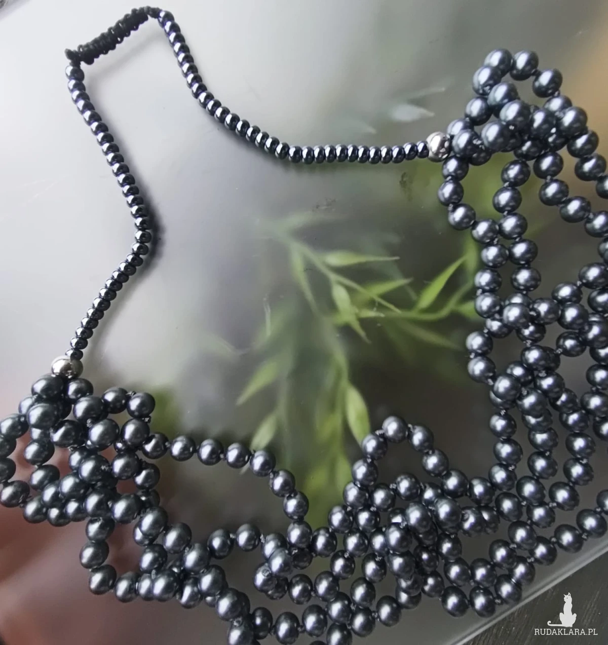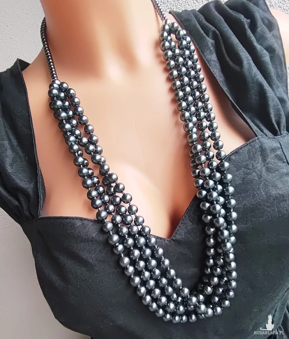Naszyjnik z pereł szklanych w kolorze grafitowym. Kulki szklane 8 mm, stalowe przekładki w kolorze srebrnym. Naszyjnik na sznurku syntetycznym, bez regulacji. Długość 38 cm