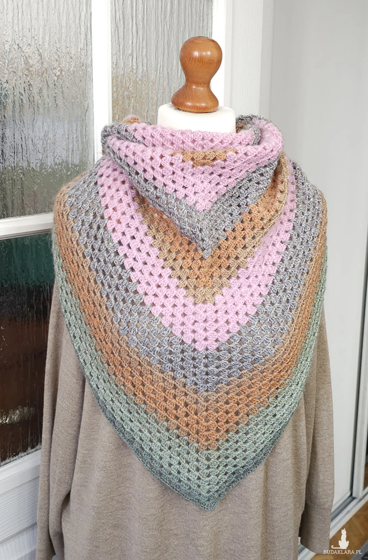 Użycie cieniowanej włóczki o pastelowej kolorystyce (róż, szary, beż/brąz i szałwiowa zieleń) sprawia, że chusta jest nowoczesna i łatwo dopasuje się do różnych ubrań.
