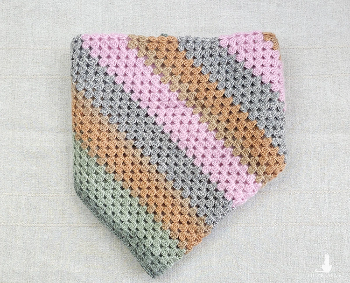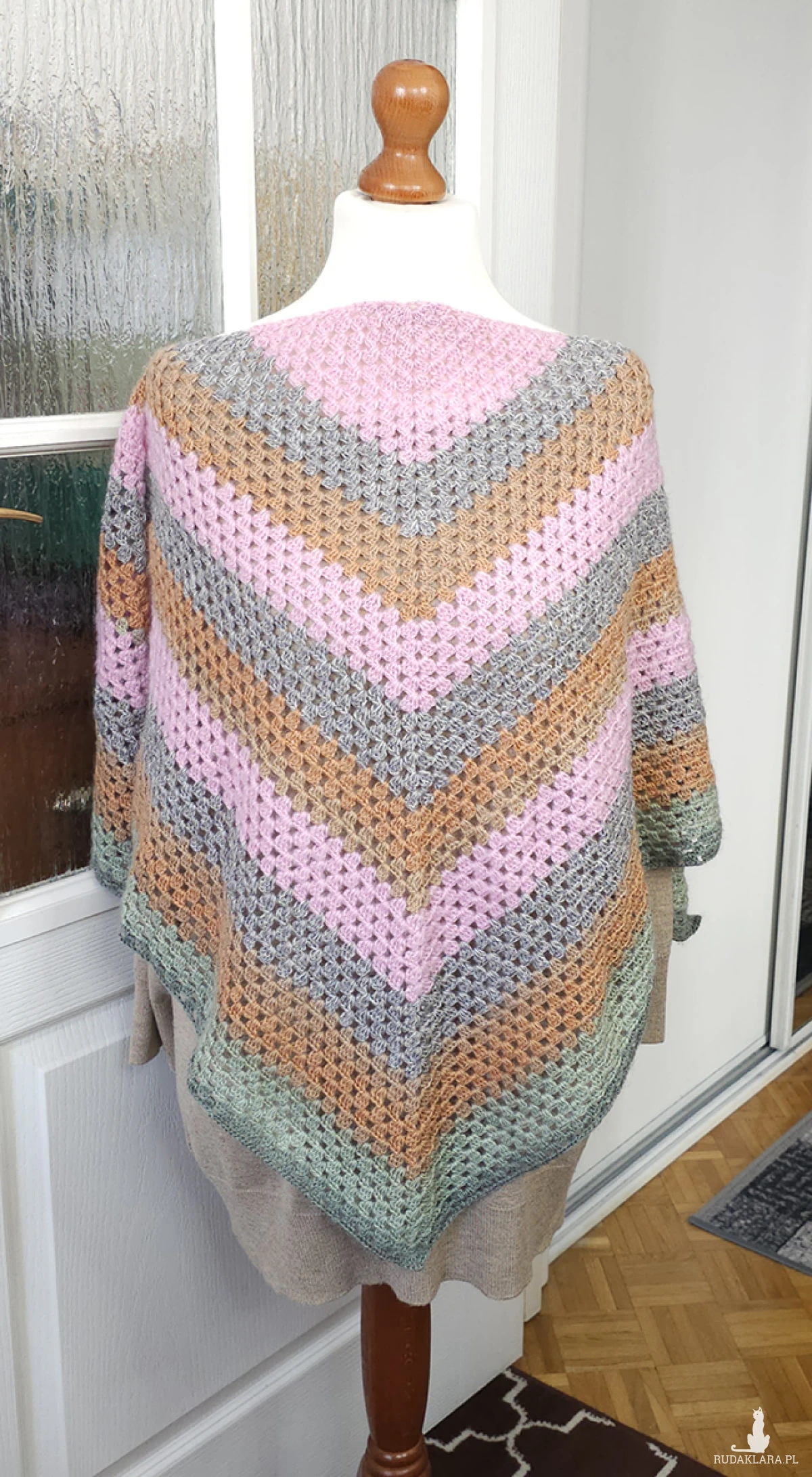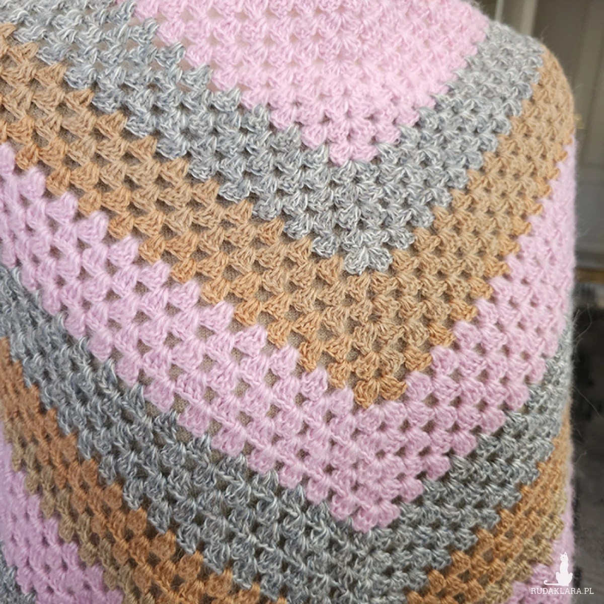 Wzór opiera się na klasycznym, otwartym ściegu typu "granny", tworząc charakterystyczne trójkątne pasy.