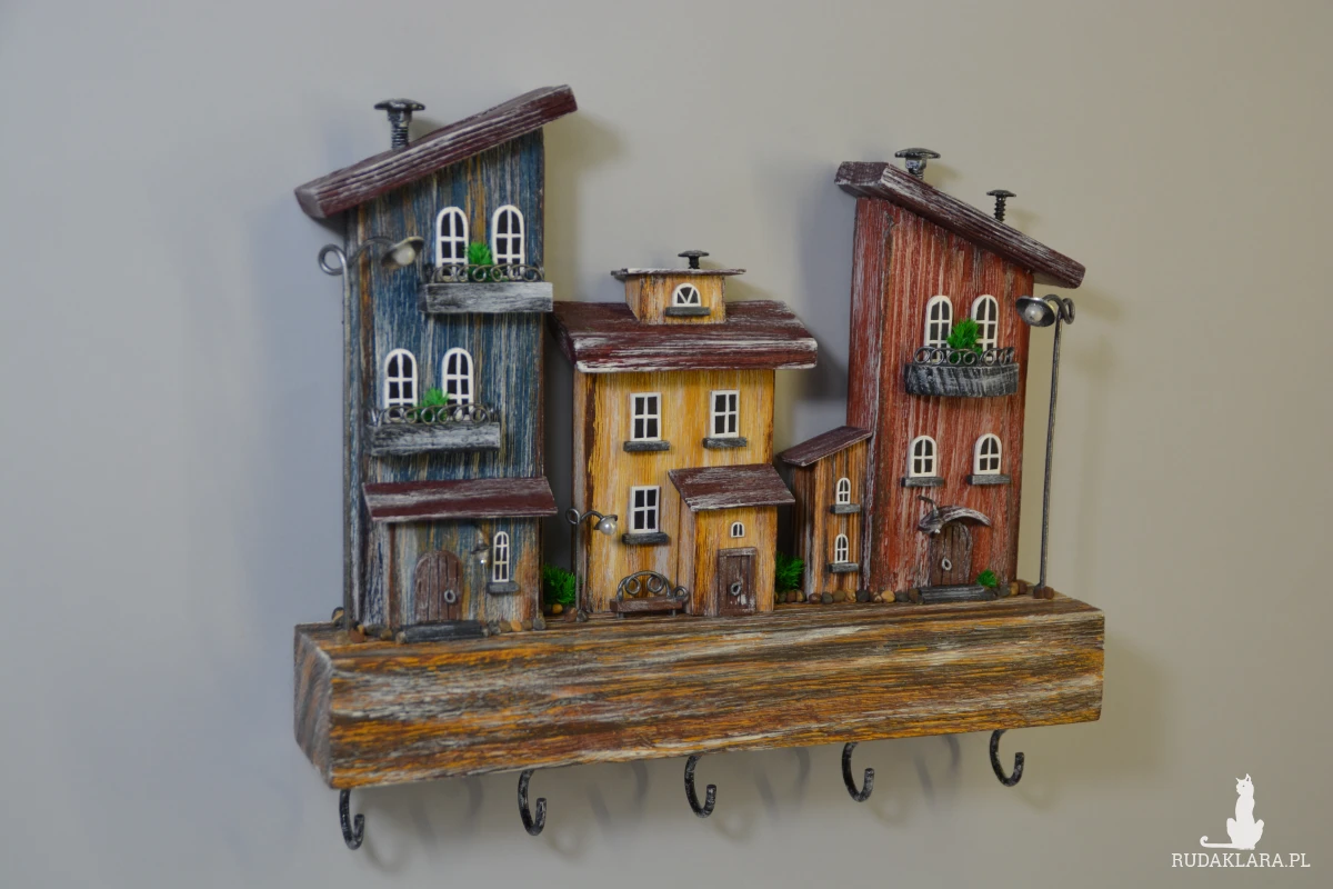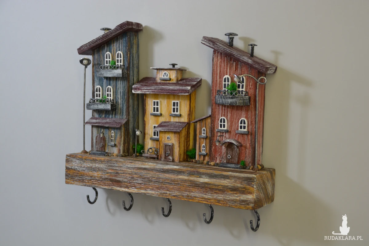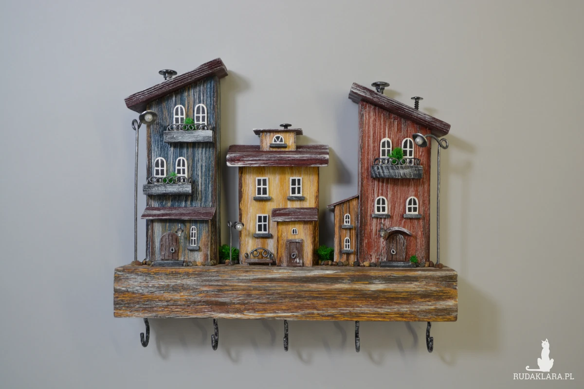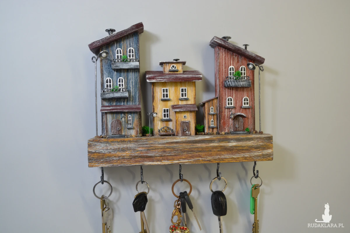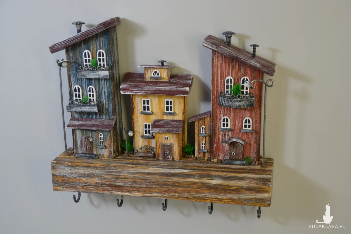 Unikalny, ręcznie wykonany wieszak na klucze z drewna odzyskanego, ozdobiony miniaturowymi domkami i stabilizowanym mchem. Wieszak posiada 5 solidnych metalowych haczyków do przechowywania kluczy, biżuterii lub drobnych akcesoriów. Z tyłu umieszczone są uchwyty do łatwego montażu na ścianie. Dzięki kombinacji rustykalnego drewna i naturalnych dekoracji, produkt harmonijnie łączy funkcję praktyczną z dekoracyjnym akcentem do wnętrza. Idealny jako prezent z okazji parapetówki, nowego domu lub po prostu dla tych, którzy cenią rękodzieło i ciepły klimat wnętrz.