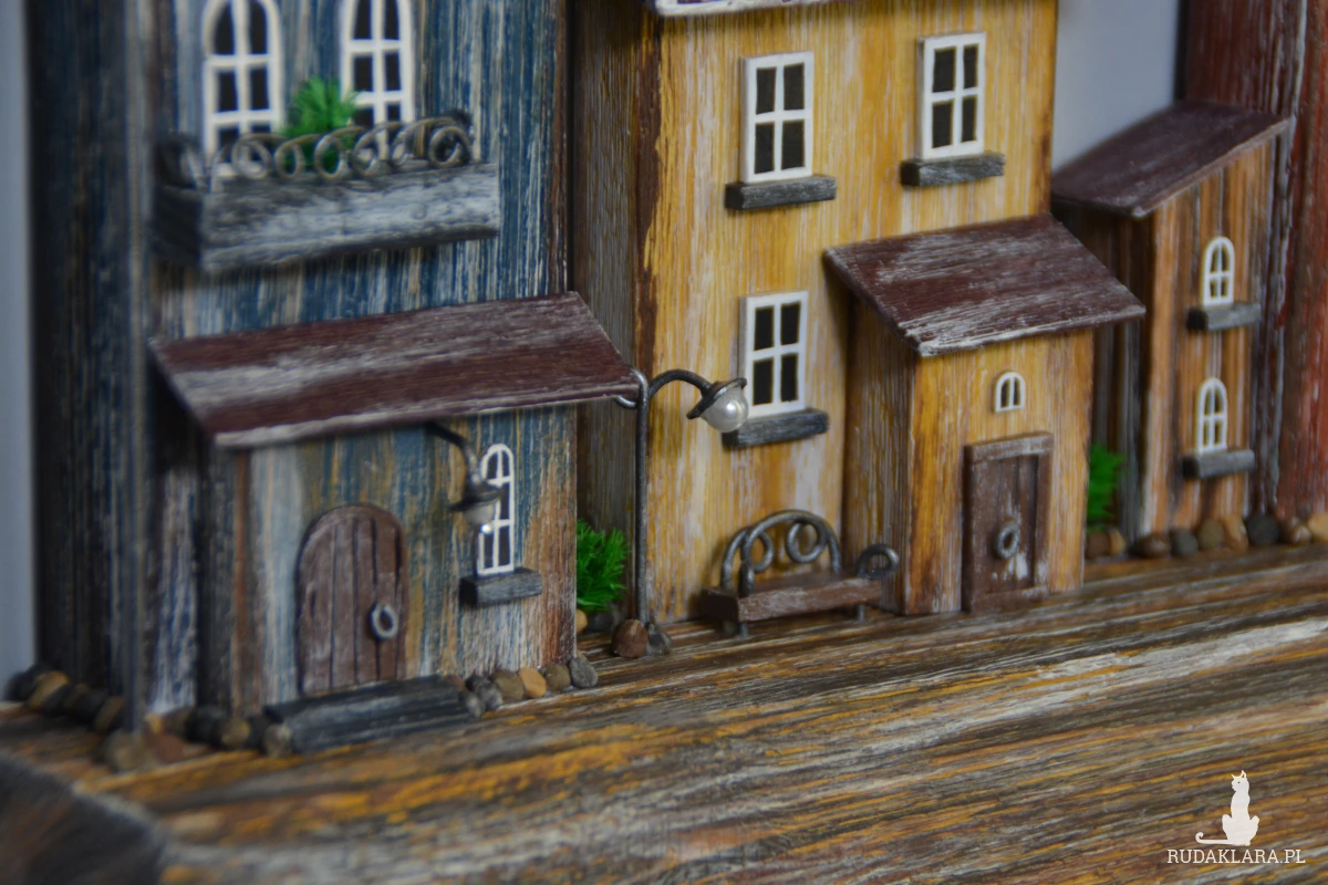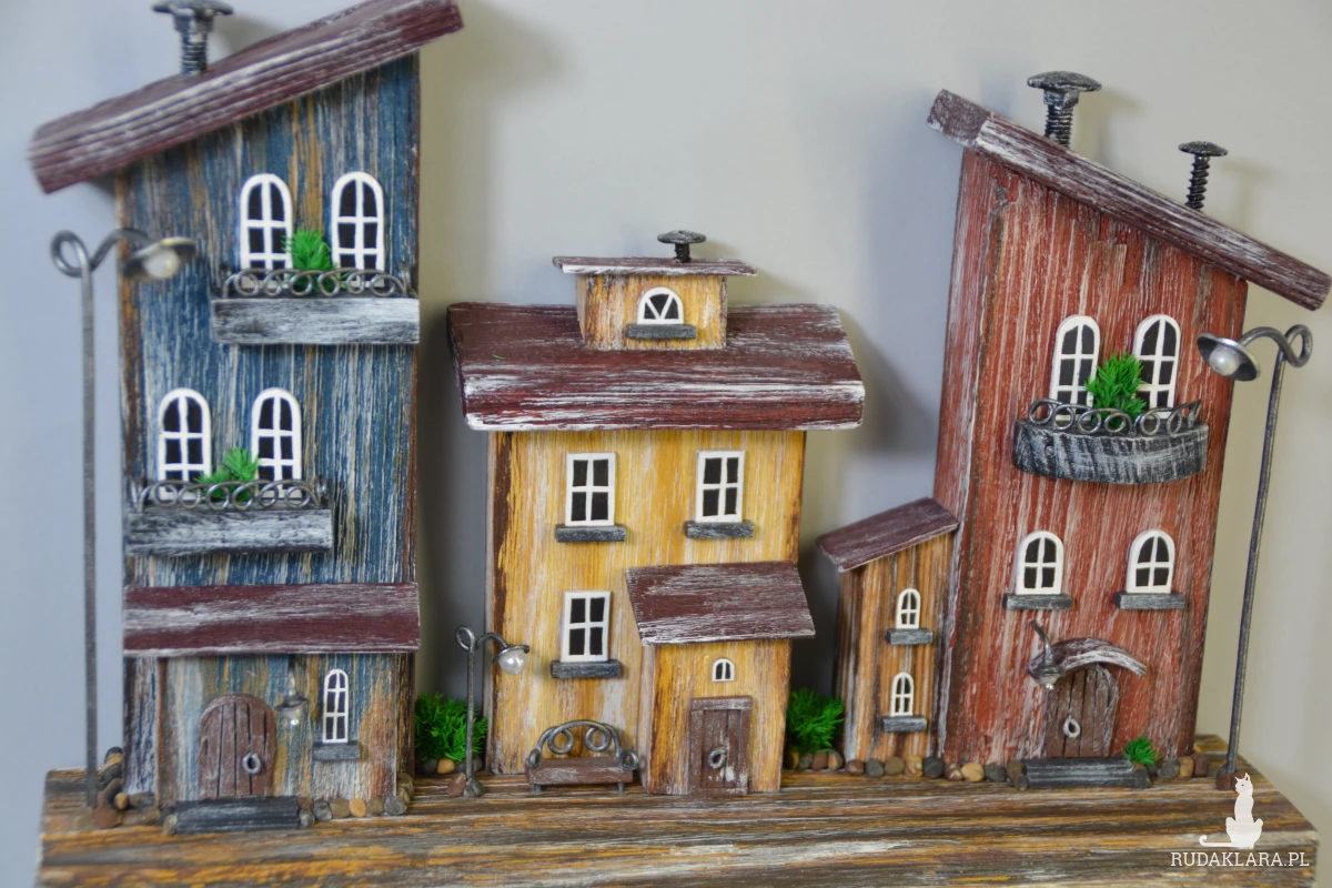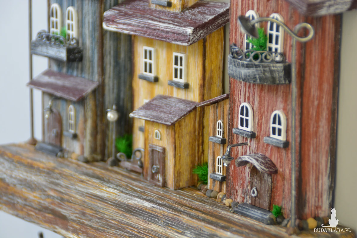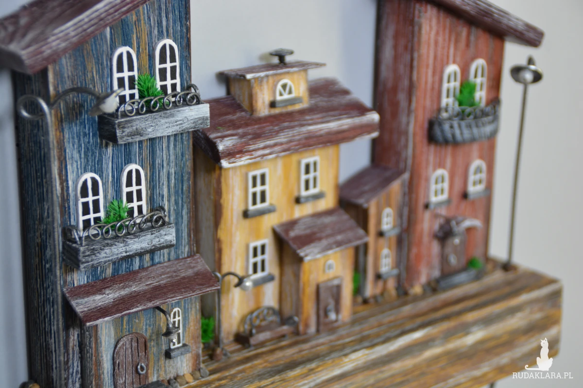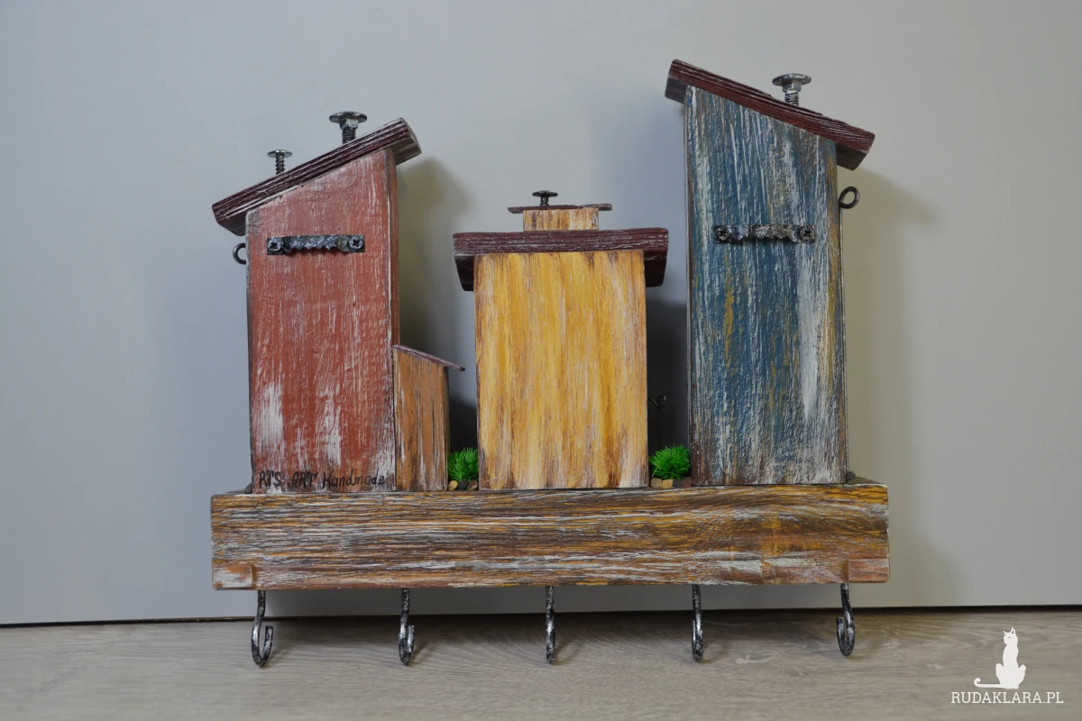 Unikalny, ręcznie wykonany wieszak na klucze z drewna odzyskanego, ozdobiony miniaturowymi domkami i stabilizowanym mchem. Wieszak posiada 5 solidnych metalowych haczyków do przechowywania kluczy, biżuterii lub drobnych akcesoriów. Z tyłu umieszczone są uchwyty do łatwego montażu na ścianie. Dzięki kombinacji rustykalnego drewna i naturalnych dekoracji, produkt harmonijnie łączy funkcję praktyczną z dekoracyjnym akcentem do wnętrza. Idealny jako prezent z okazji parapetówki, nowego domu lub po prostu dla tych, którzy cenią rękodzieło i ciepły klimat wnętrz.
