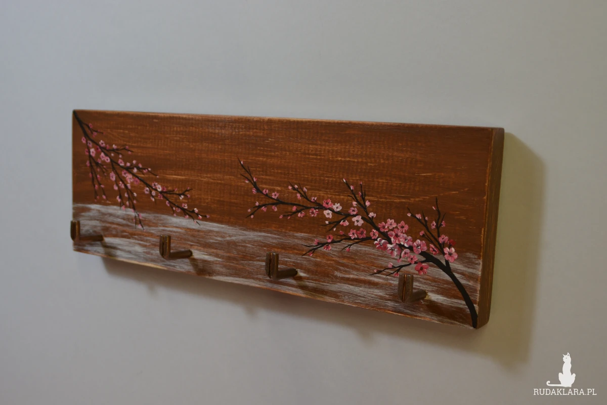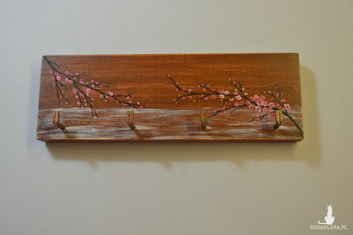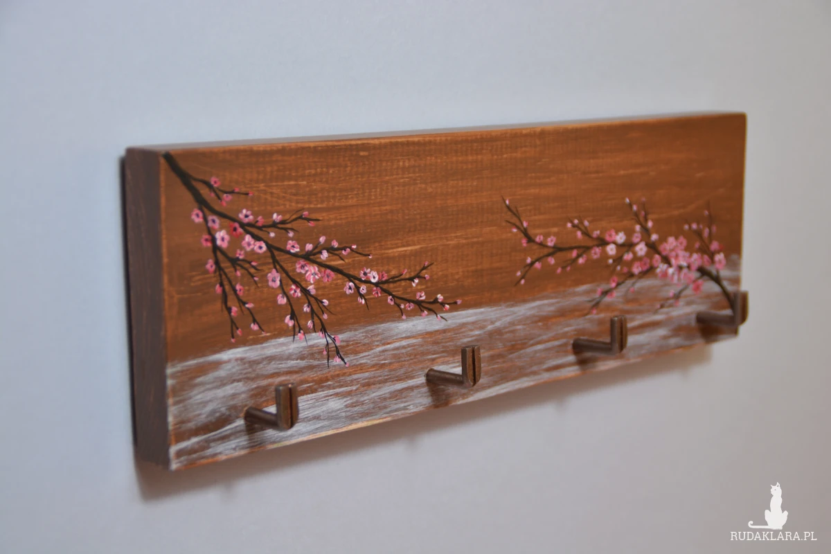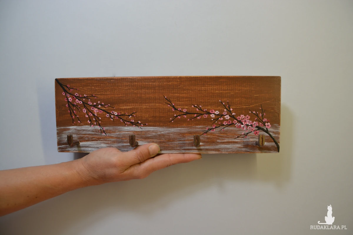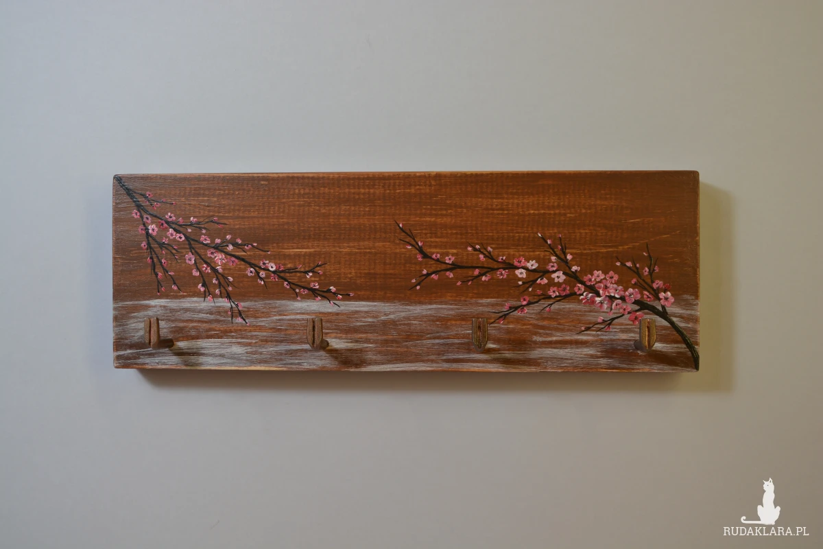 Wieszak na klucze jest ręcznie wykonany z drewna sosnowego. Ma rysunek kwitnącej gałązki sakury. Rysunek jest nakładany ręcznie przy użyciu farb akrylowych i pędzla, a następnie pokryty dwiema warstwami lakieru ochronnego. Drewno jest barwione ręcznie, co nadaje mu oszałamiający wygląd. Wieszak na klucze ma 4 haczyki, które są idealne do organizowania kluczy i nie tylko. Tył wieszaka na klucze ma zapięcia, które umożliwiają łatwą instalację na ścianie.
