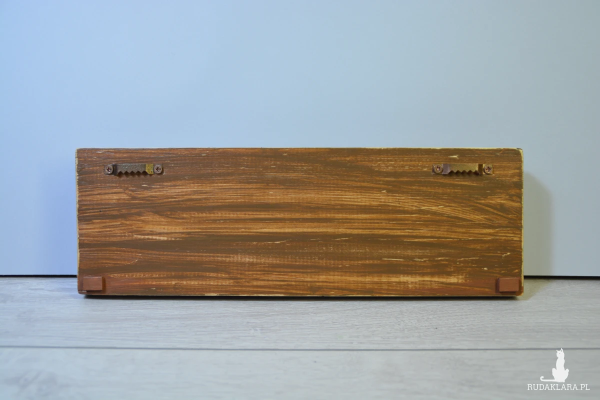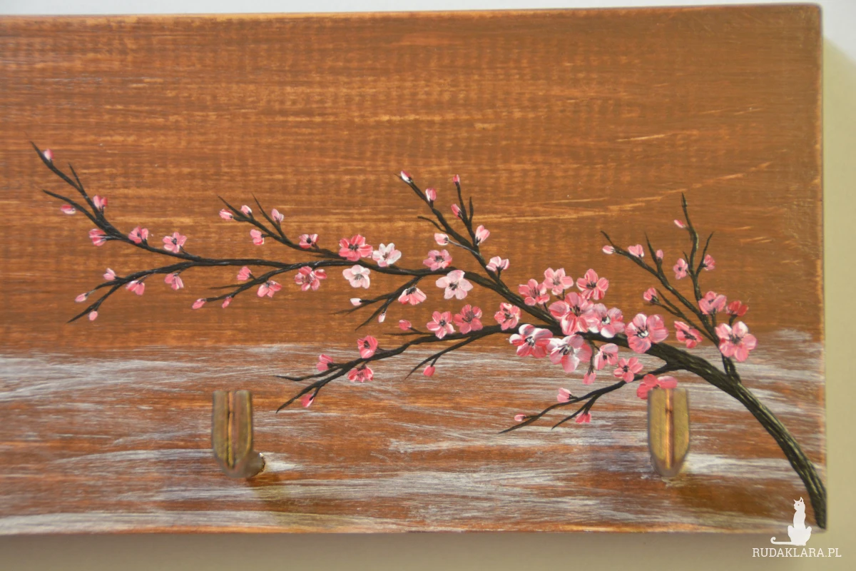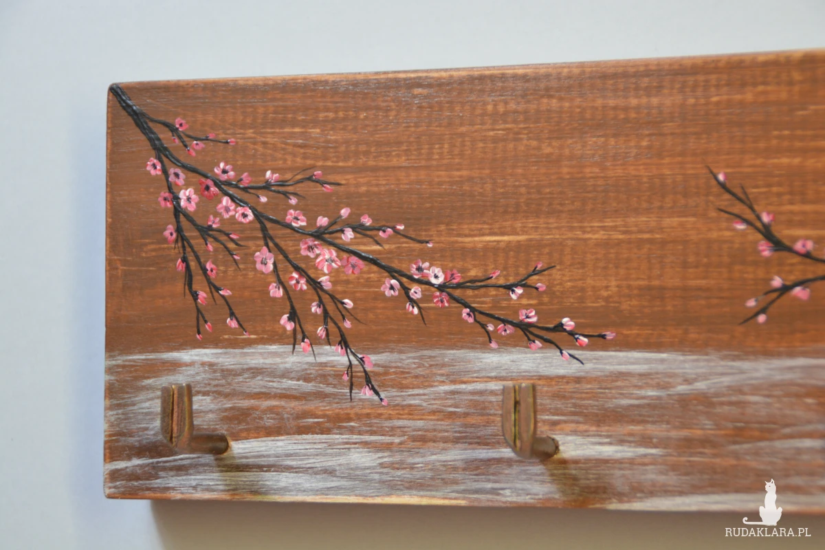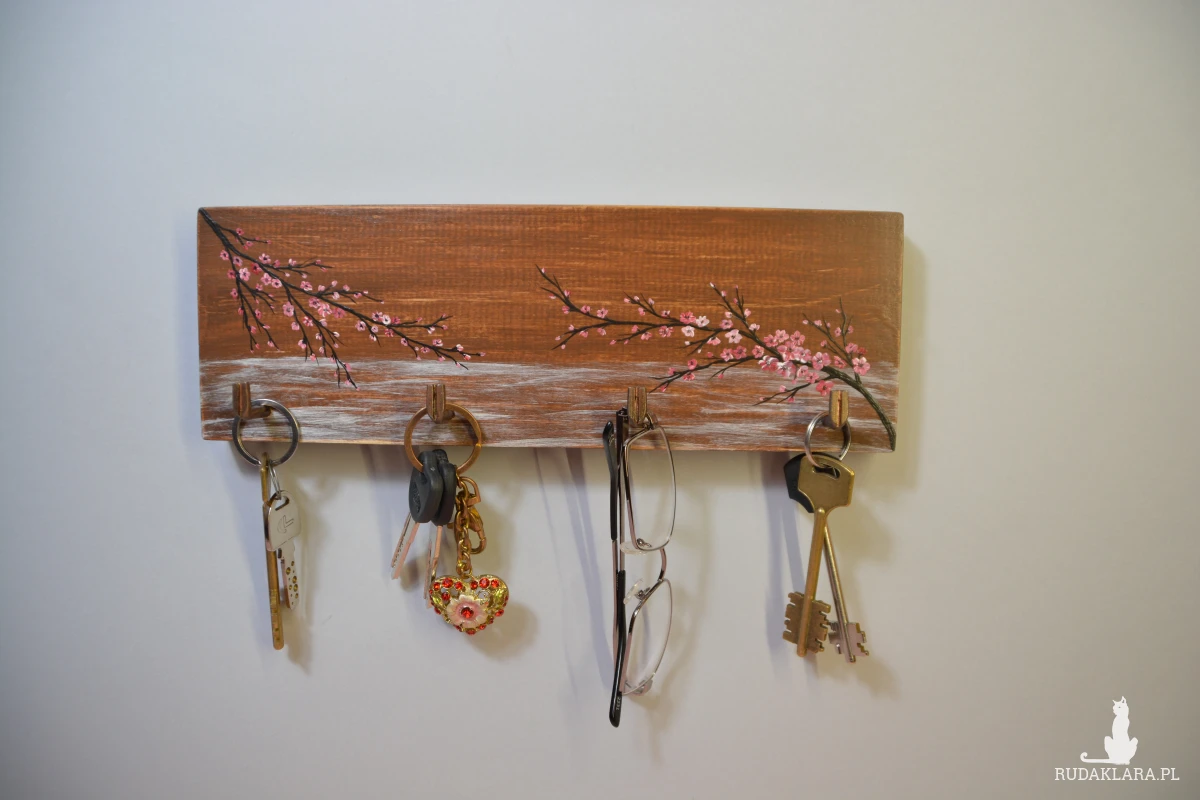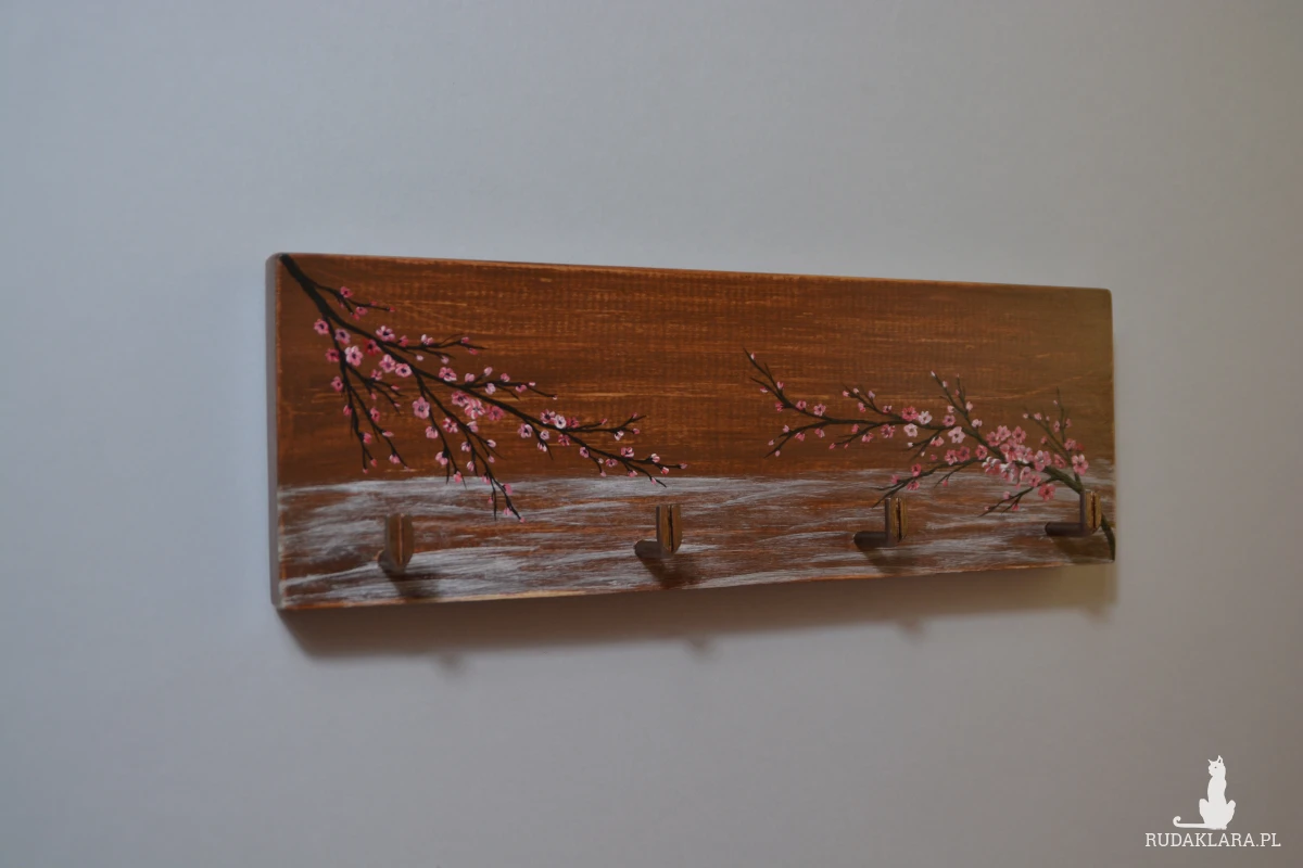 Wieszak na klucze jest ręcznie wykonany z drewna sosnowego. Ma rysunek kwitnącej gałązki sakury. Rysunek jest nakładany ręcznie przy użyciu farb akrylowych i pędzla, a następnie pokryty dwiema warstwami lakieru ochronnego. Drewno jest barwione ręcznie, co nadaje mu oszałamiający wygląd. Wieszak na klucze ma 4 haczyki, które są idealne do organizowania kluczy i nie tylko. Tył wieszaka na klucze ma zapięcia, które umożliwiają łatwą instalację na ścianie.