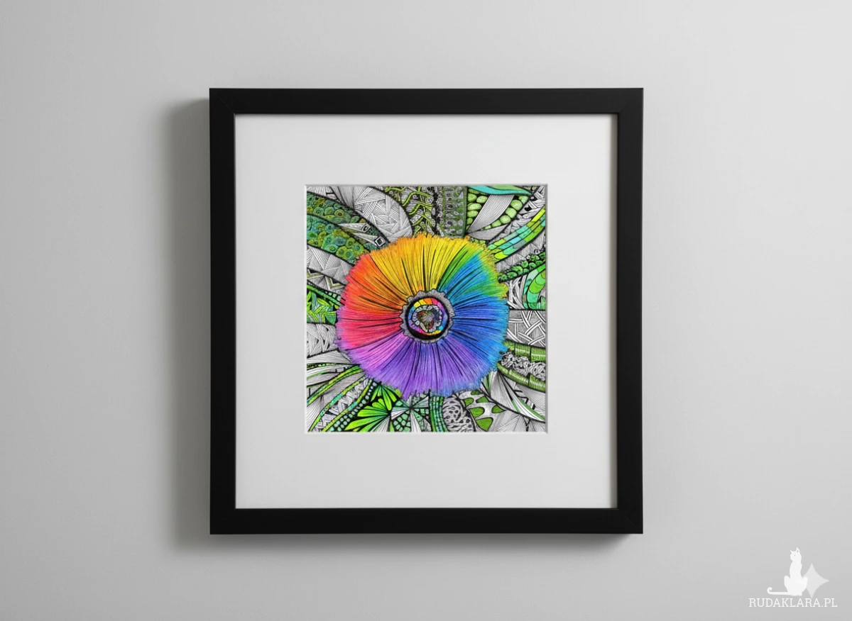 który eksploduje kolorem (pełne spektrum tęczy, od czerwieni do fioletu). To kolorowe centrum jest otoczone gęstą, chaotyczną i hipnotyzującą siatką wzorów w czerni, bieli i zieleni.