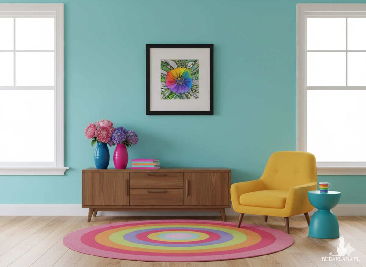 Obejmuje ono radość (żółty, pomarańczowy), spokój (niebieski), pasję (czerwony) i duchowość (fioletowy). Ten wybuch kolorów jest czystą witalnością i dowodem na to, że prawdziwa siła to akceptacja pełnej palety uczuć.