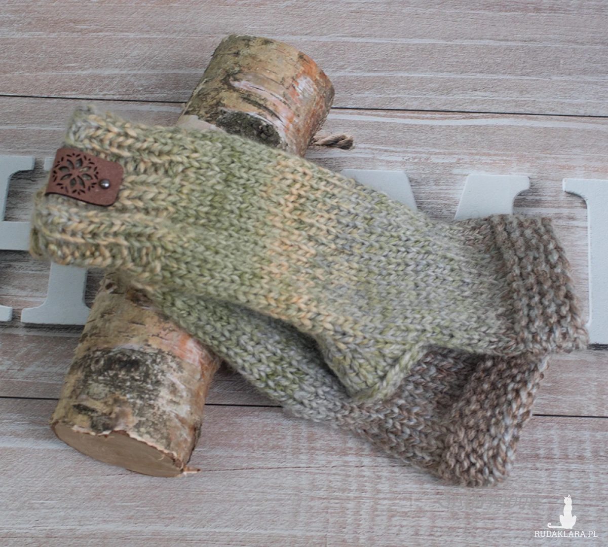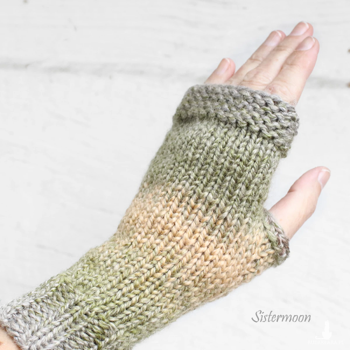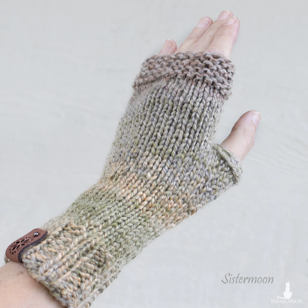 Krótkie mitenki z wełną w pięknych barwach: zielenie, delikatne szarości, brązy i zgaszone żółcie. Wykonane ręcznie, bezszwowo. Skład: 30% owcza wełna, 70% akryl. Mitenki są ciepłe, miękkie, niegryzące. Miłe w dotyku. Dopasowują się do dłoni. Nie powinny się mechacić. Dł. ok. 21 cm. Rozmiar uniwersalny. Zalecane pranie ręczne w temp. do 30 stopni. Nie wirować.