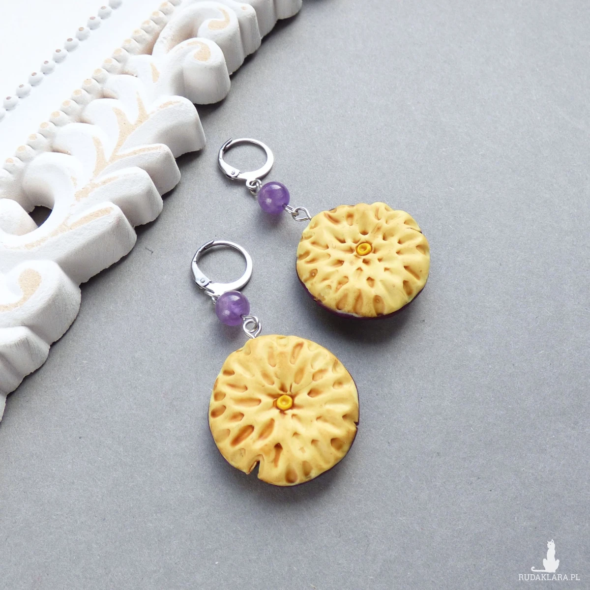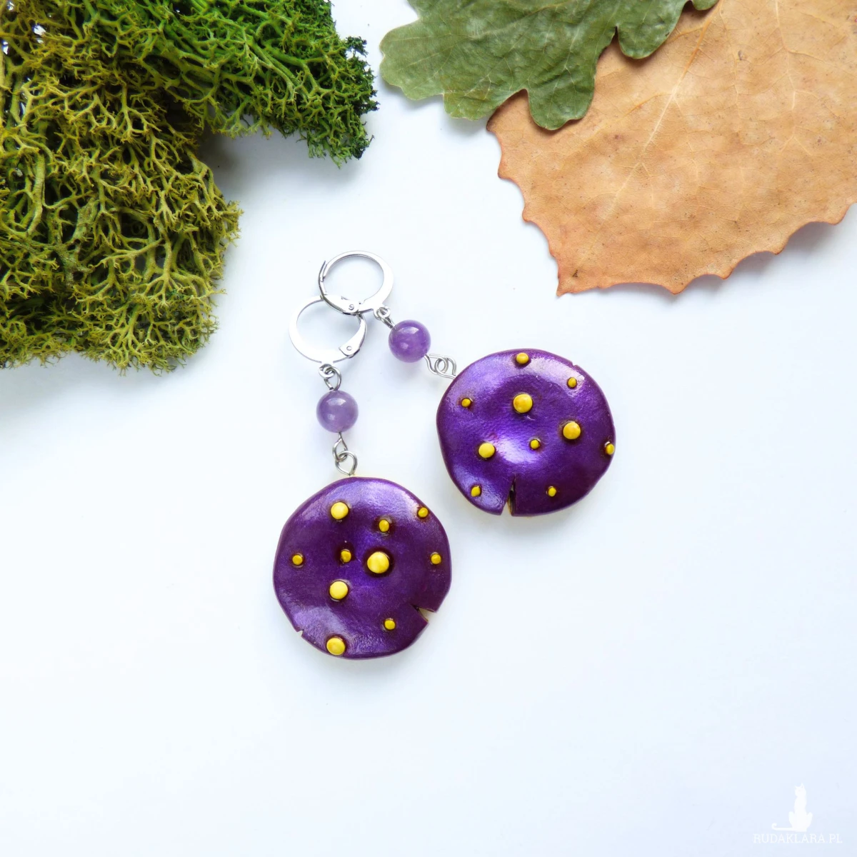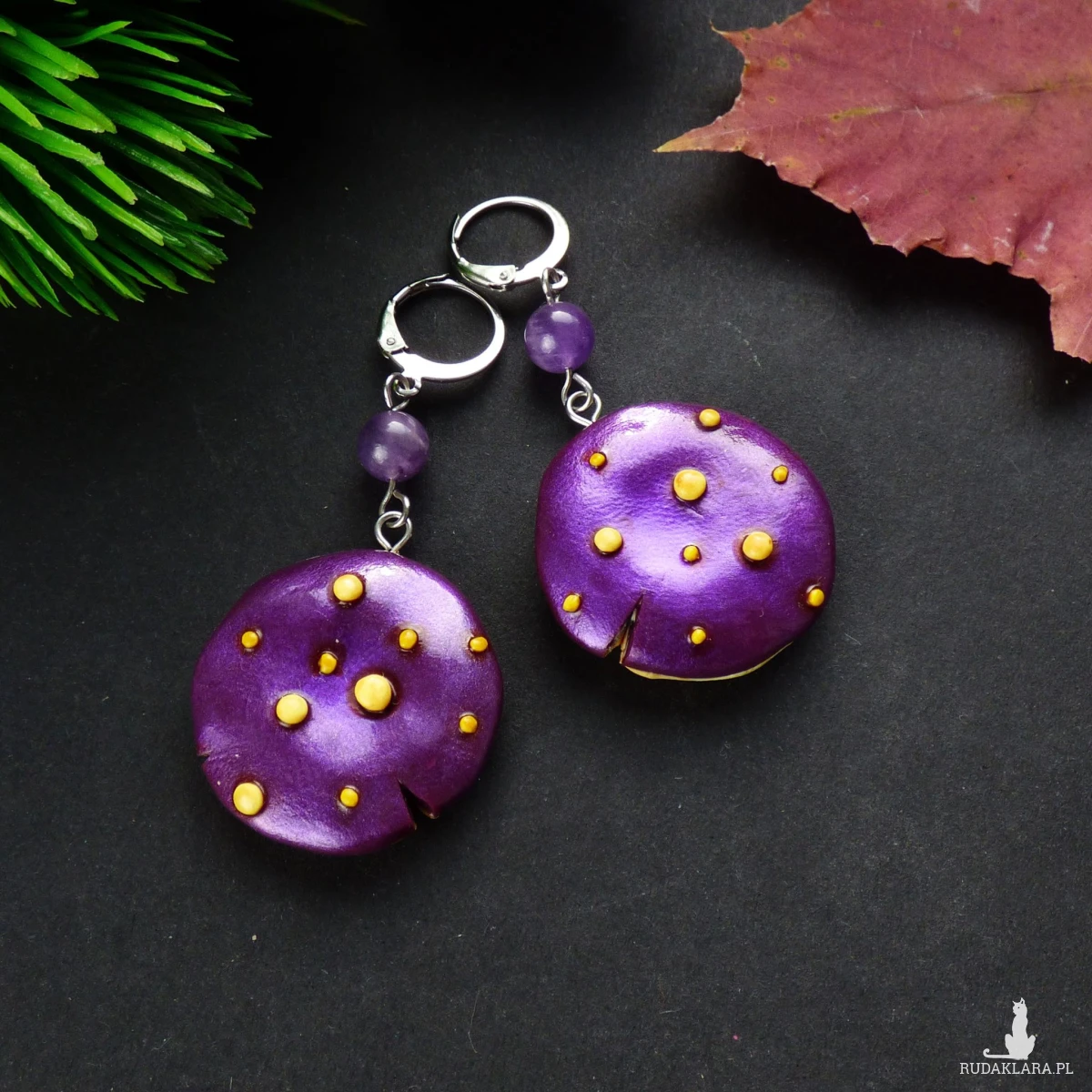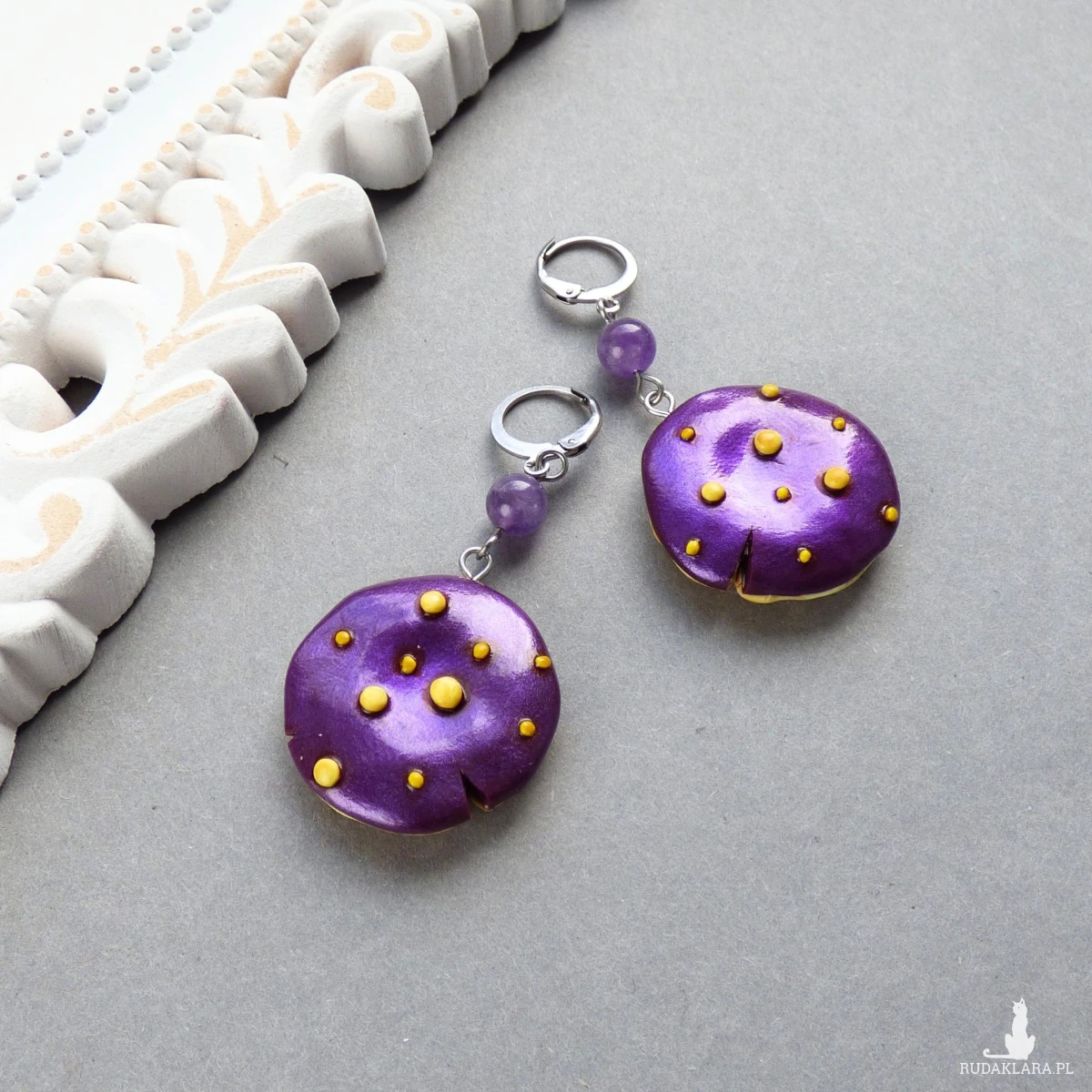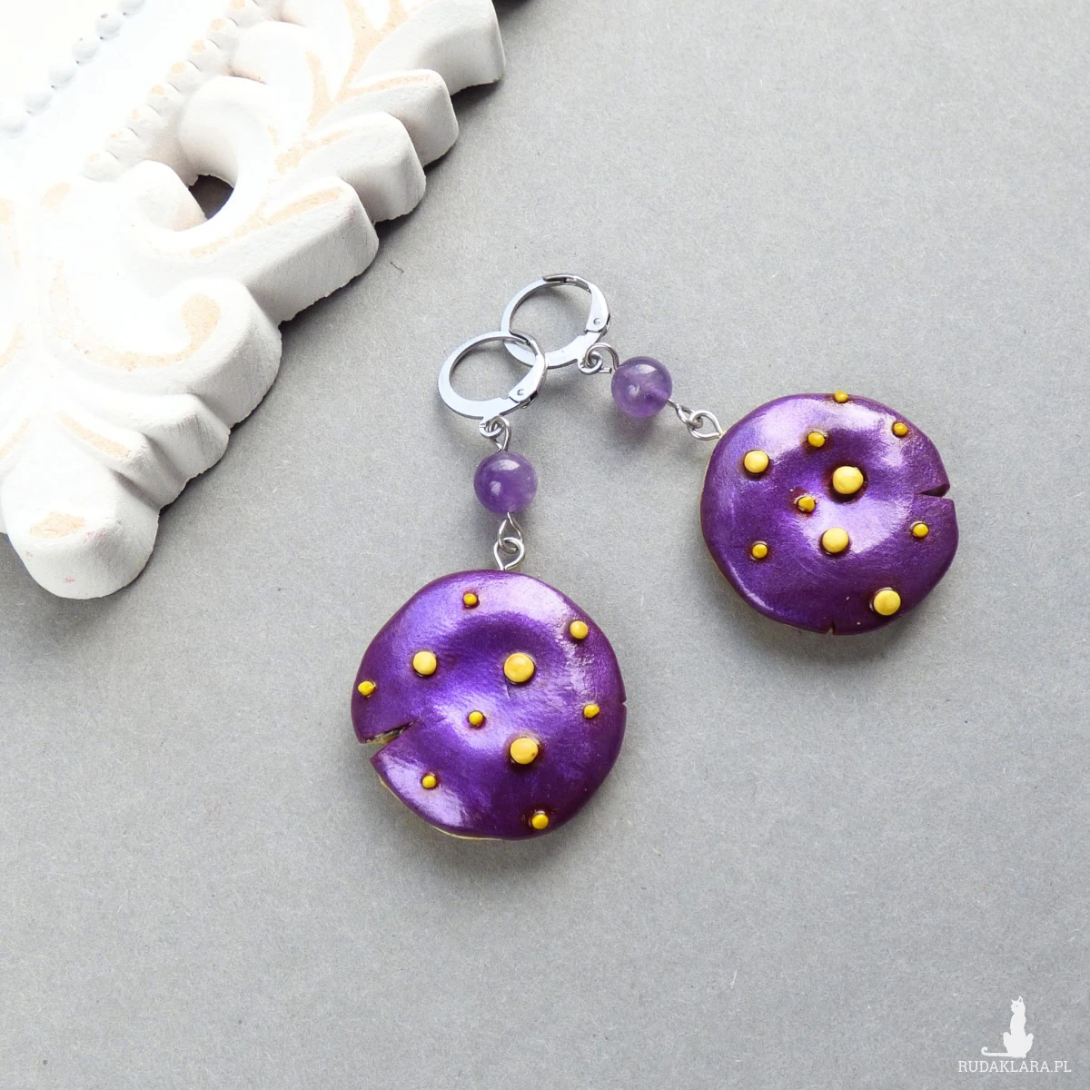 Materiały: glinka polimerowa (modelina Fimo),proszek metaliczny, farby akrylowe, kulki ametystu 6mm, bigle zamknięte typu kajdanki ze stali szlachetnej.