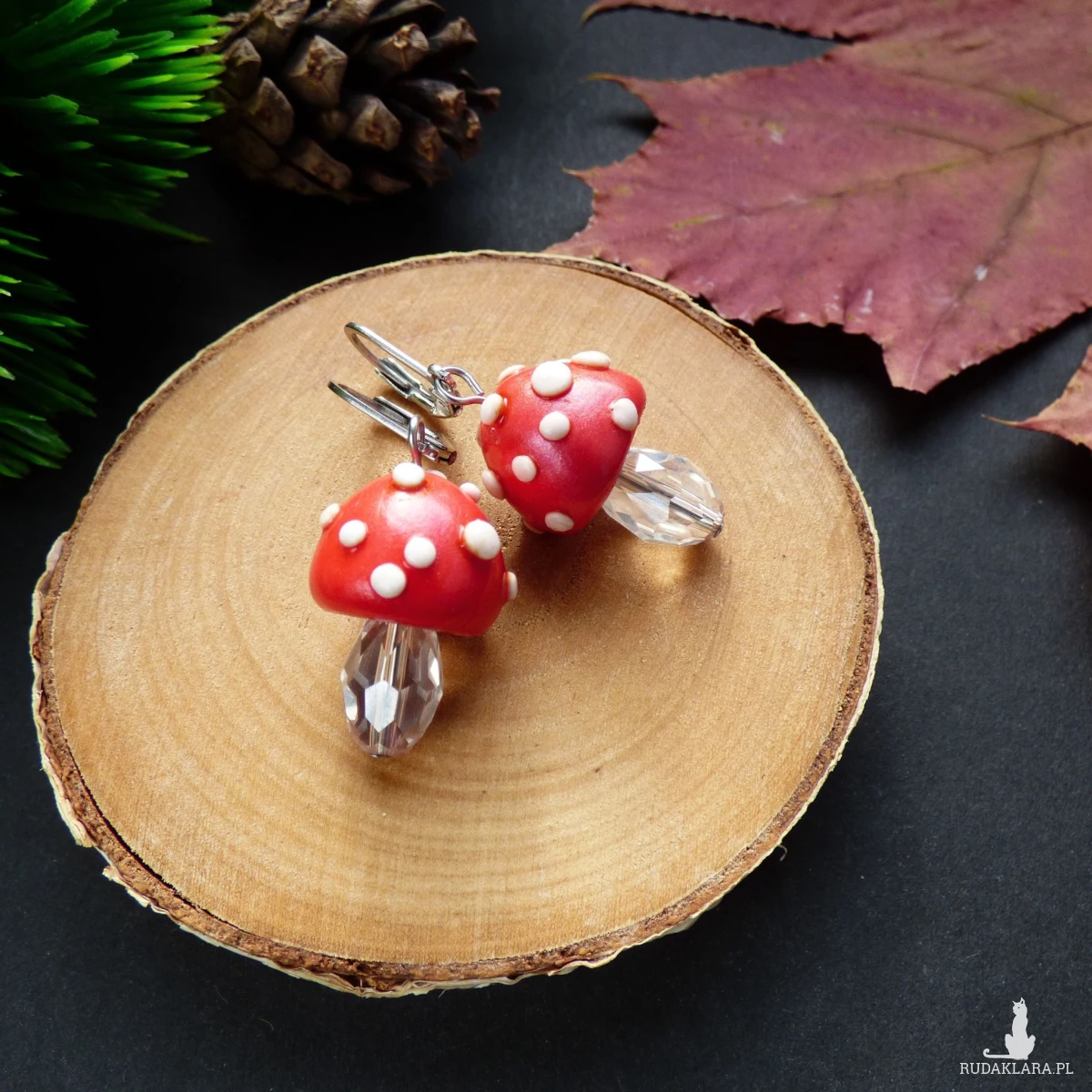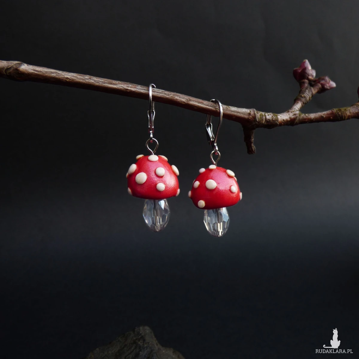 Urocze, autorskie kolczyki inspirowane muchomorem czerwonym, modelowane ręcznie z glinki polimerowej. Baśniowe grzybki z kryształową nóżką, niby kropla rosy. Czapeczki muchomorków mają soczystą czerwień z lekko metalicznym połyskiem i wypukłe białe kropeczki. Pod spodem zawiesiłam fasetowane, bezbarwne krople szkła kryształowego – dodają lekkości i pięknie łapią światło. Całość jest lekka i subtelnie mieni się przy każdym ruchu.