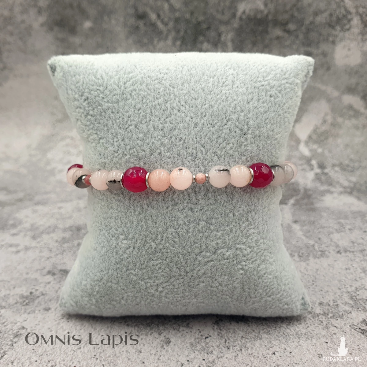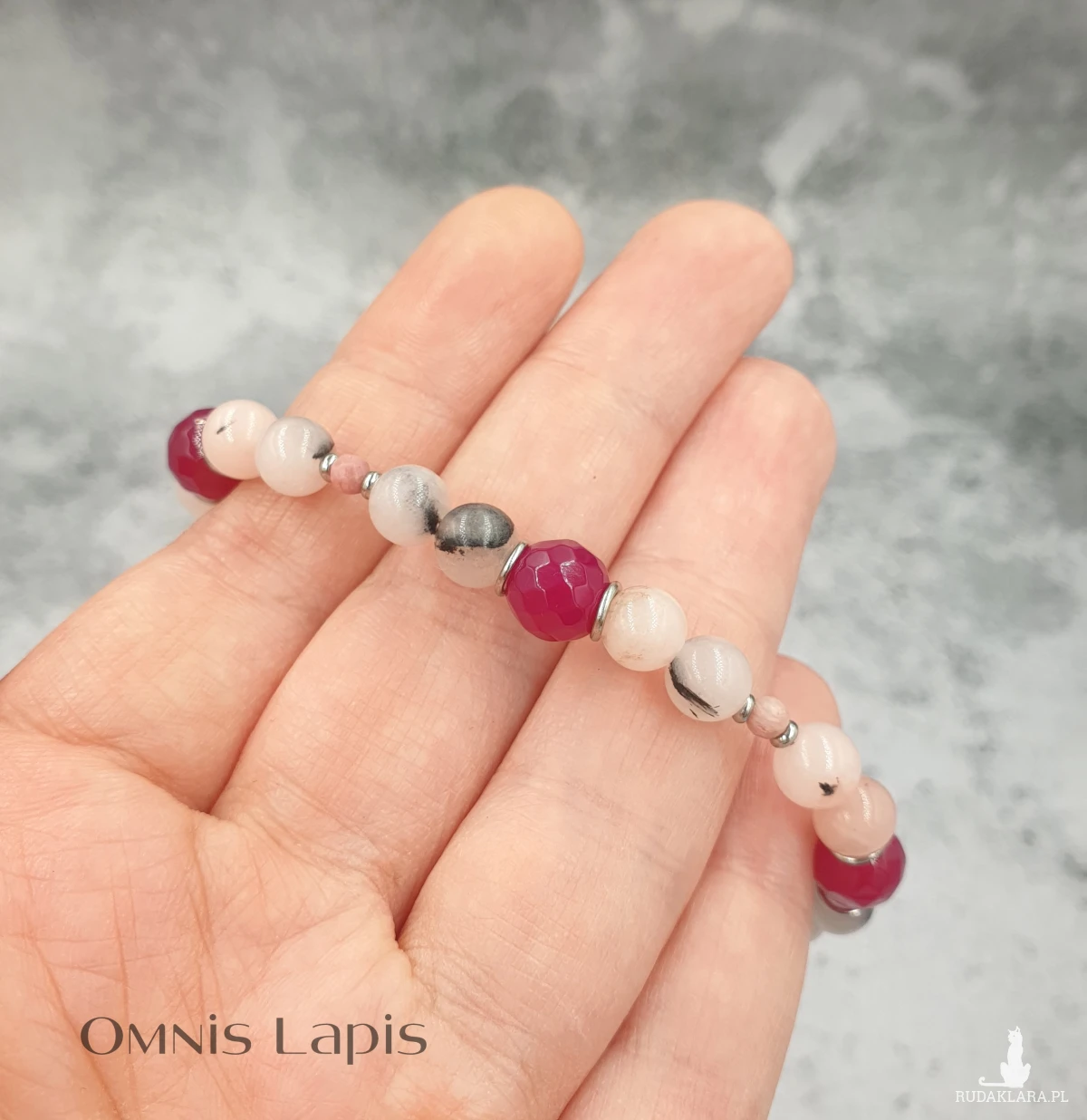Wykonana z kul opalowego jadeitu, jadeitu fuksja oraz rodonitu.