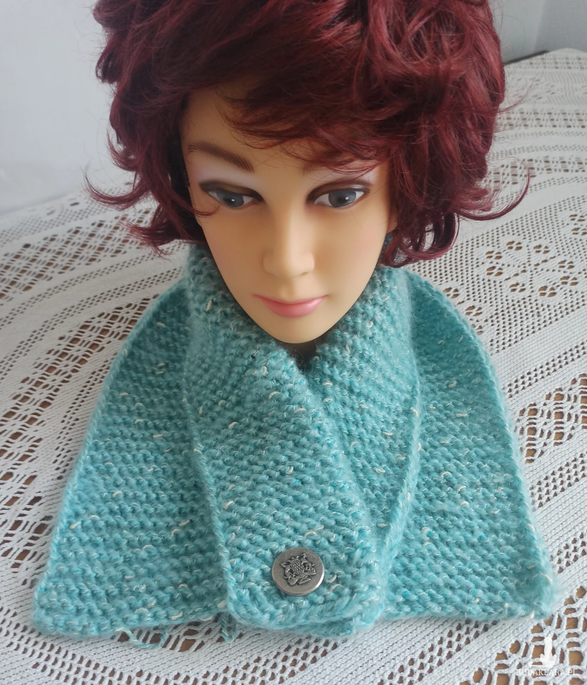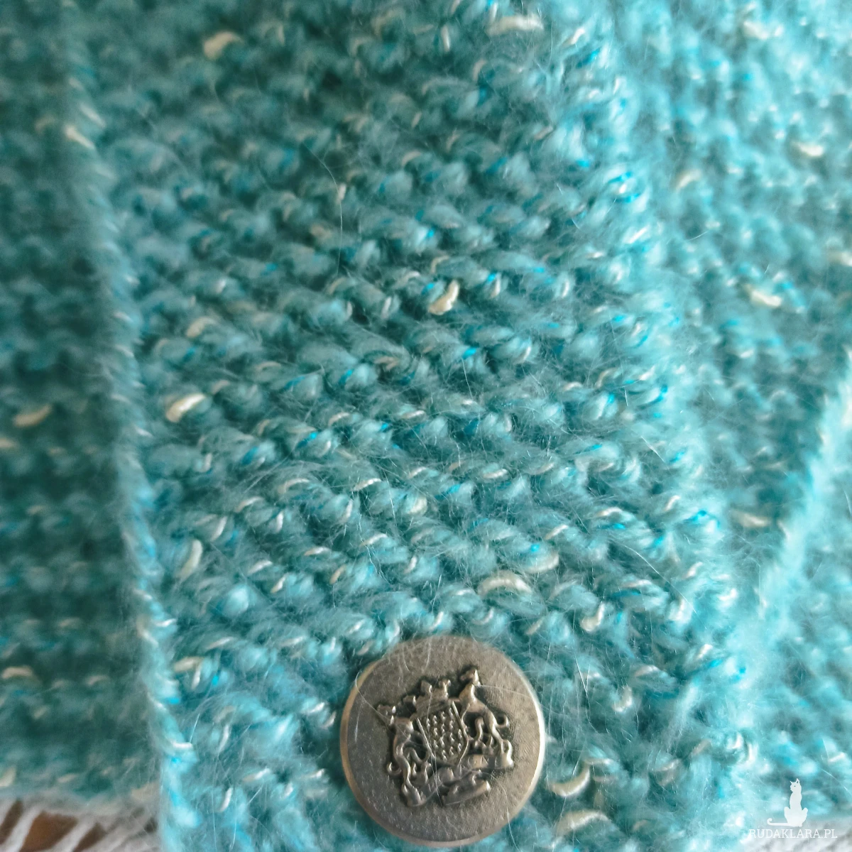 Komin w kolorze pudrowego niebieskiego wykonany handmade ściegiem francuskim z wełny moherowej Yorn z domieszką 20% akrylu, 20% poliamidu z niewidocznym zapięciem na zatrzask, ozdobiony efektownym guzikiem. Zapięcie jest praktyczne i wygodne w użyciu, można obwód dopasować do własnych potrzeb. Bardzo miękki, mięsisty w dotyku, wełna wysokiej jakości. Wyrób z tych grubszych. Skutecznie zatrzymuje ciepło, przepuszcza powietrze, łatwo przylega do ciała. Można wywinąć do góry by osłonić głowę lub po prostu na nią nałożyć, duża szerokość na to pozwala. Nie rozciąga się na trwałe lecz elastycznie pozwala regulować długość. Kolor modny w tym sezonie. Jedyny taki!!!