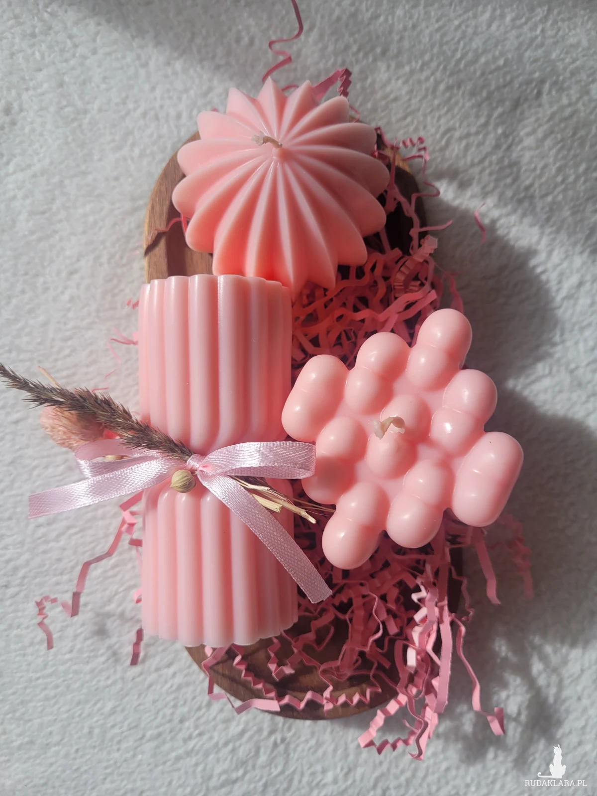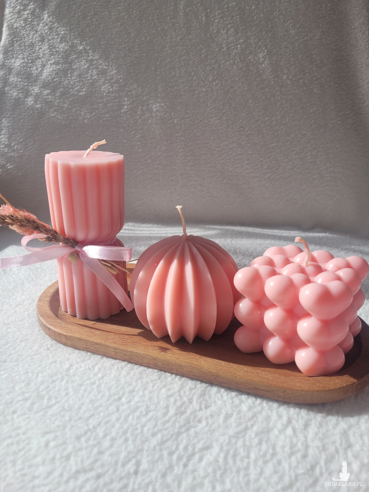 Zestaw świec sojowych handmade na drewnianej tacce.