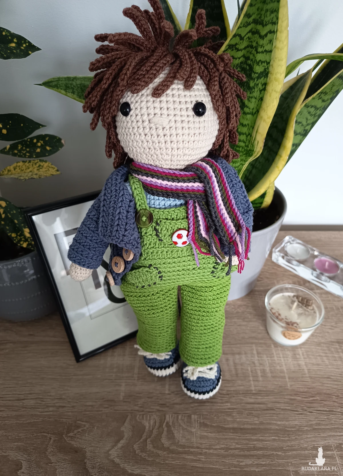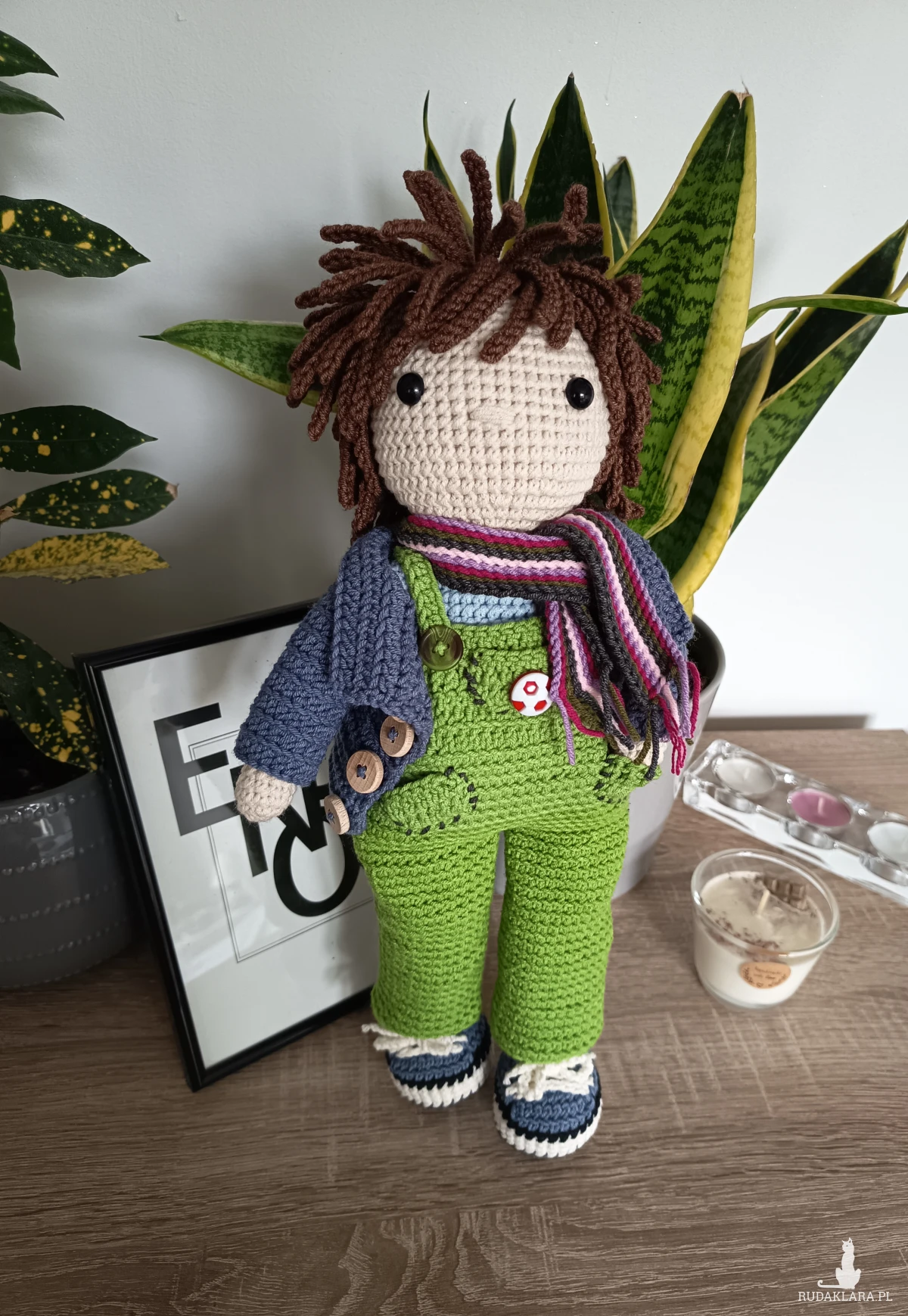 Unikatowa, ręcznie robiona szydełkowa lalka o wysokości ok. 37 cm. Wykonana z dużą starannością z wysokiej jakości włóczki YarnArt Jeans – miękkiej, trwałej i przyjemnej w dotyku, z przewagą bawełny.