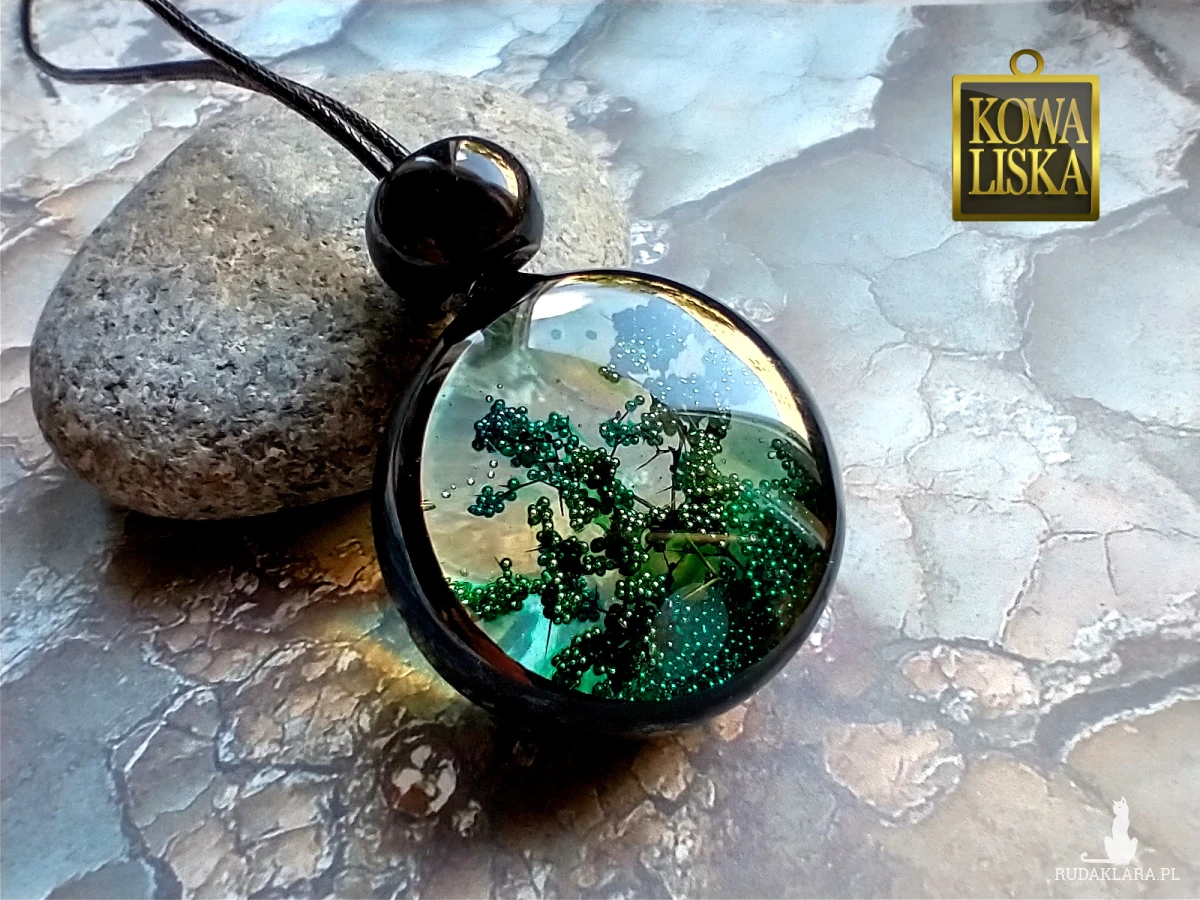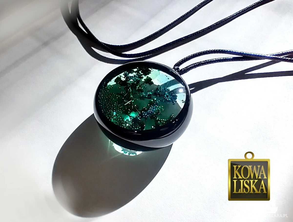 Długi, duży medalion z żywicy. Drzewko "kwitnące" turkusowo-zielonymi owocami w lekkiej poświacie, stanowi bardzo efektowne wnętrze czarnej ramki. Medalion został w całości oblany żywicą, co spotęgowało wrażenie trójwymiarowości.