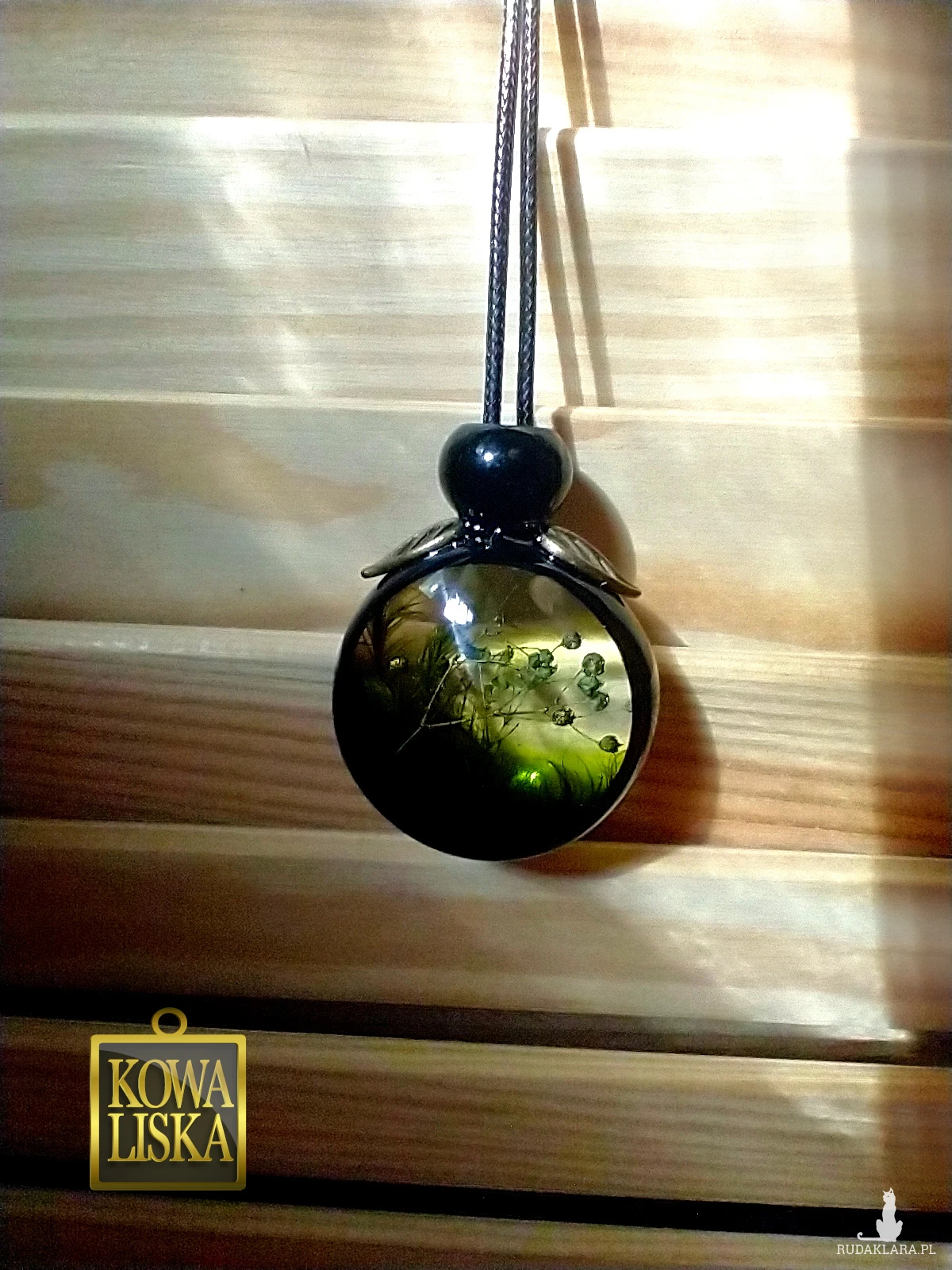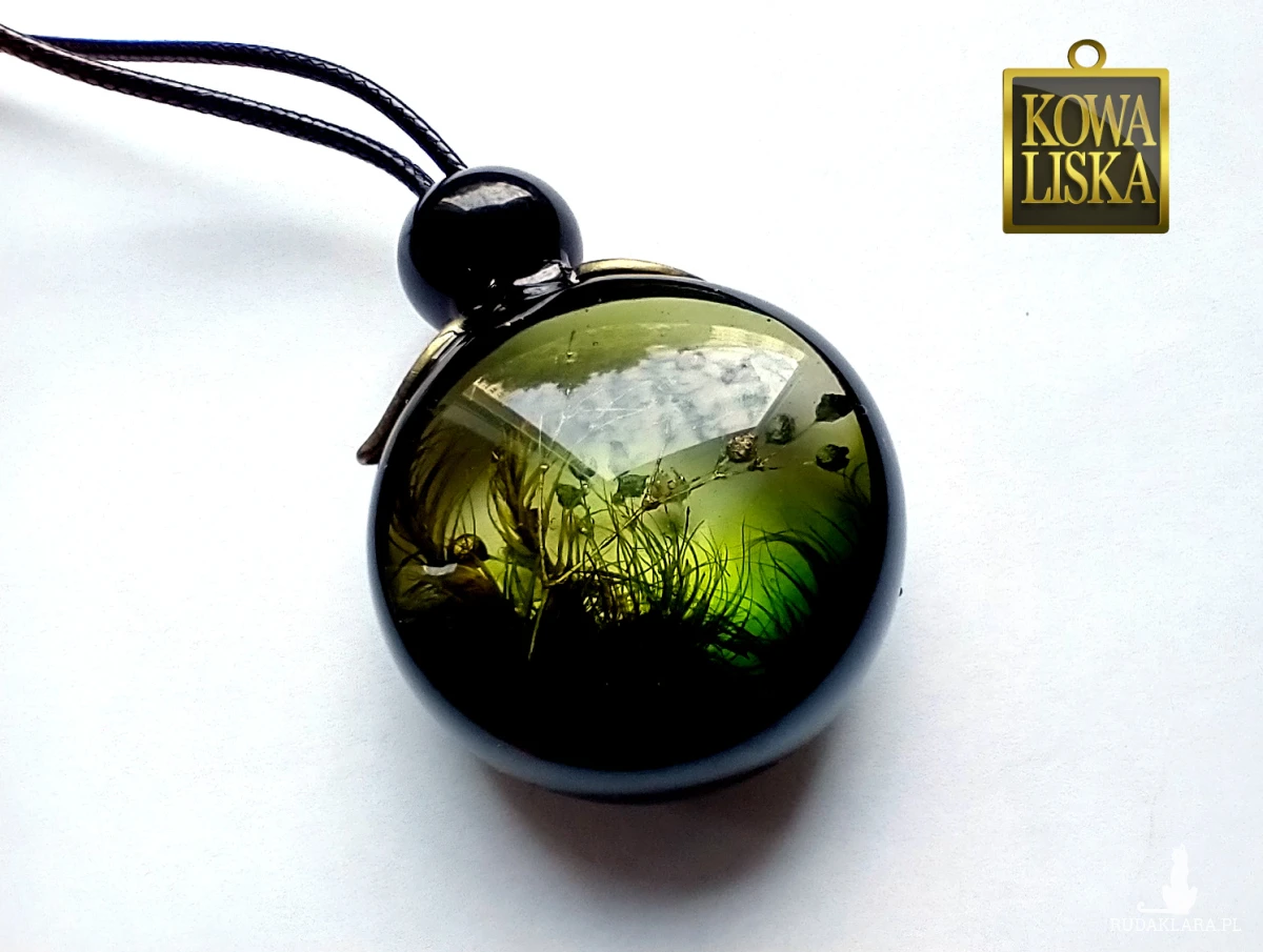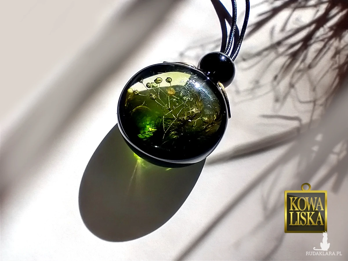 Długi, duży medalion z żywicy. Leśne, roślinne motywy umieszczone w oliwkowej poświacie, stanowią bardzo efektowne wnętrze czarnej ramki. Medalion został w całości oblany żywicą, co spotęgowało wrażenie trójwymiarowości. Listki w kolorze starego brązu pięknie oprawiają całość.