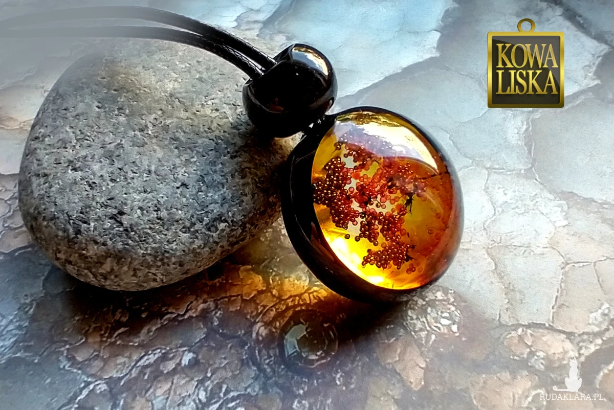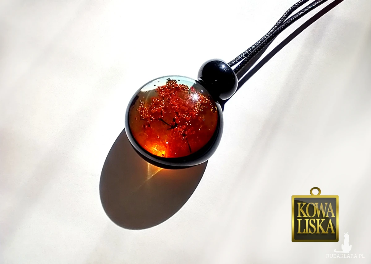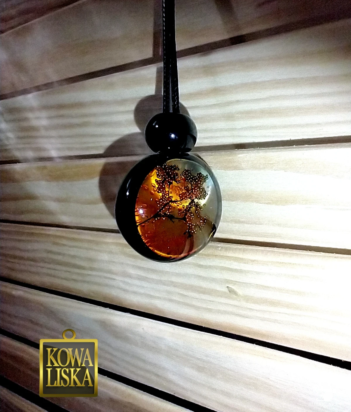Długi, duży medalion z żywicy. Jesienne, złocisto-bursztynowe drzewka umieszczone w ognistej poświacie, stanowią bardzo efektowne wnętrze czarnej ramki. Medalion został w całości oblany żywicą, co spotęgowało wrażenie trójwymiarowości.